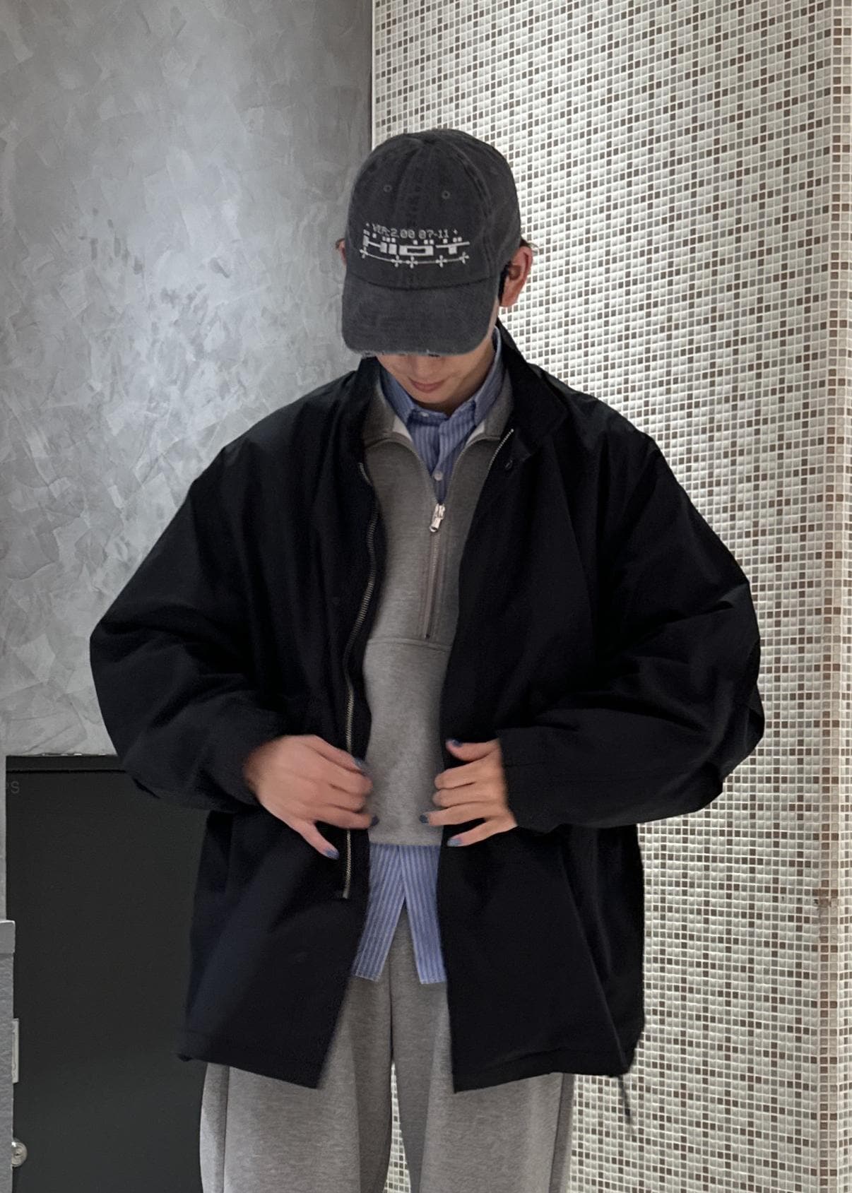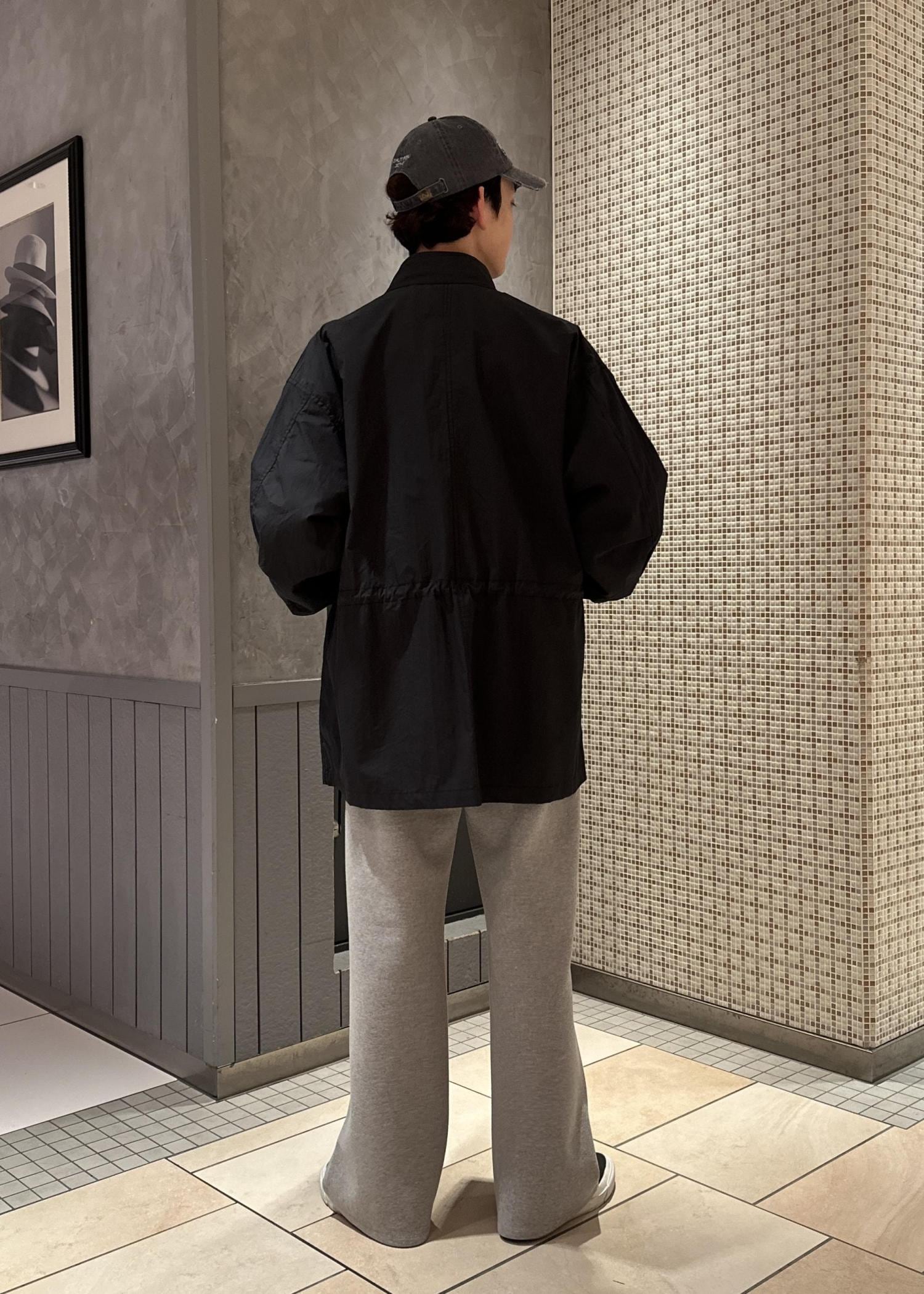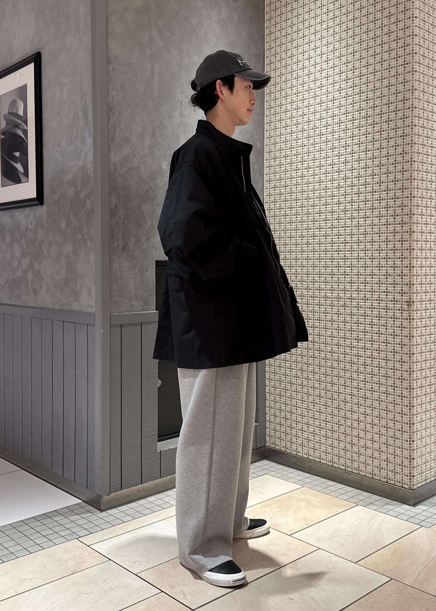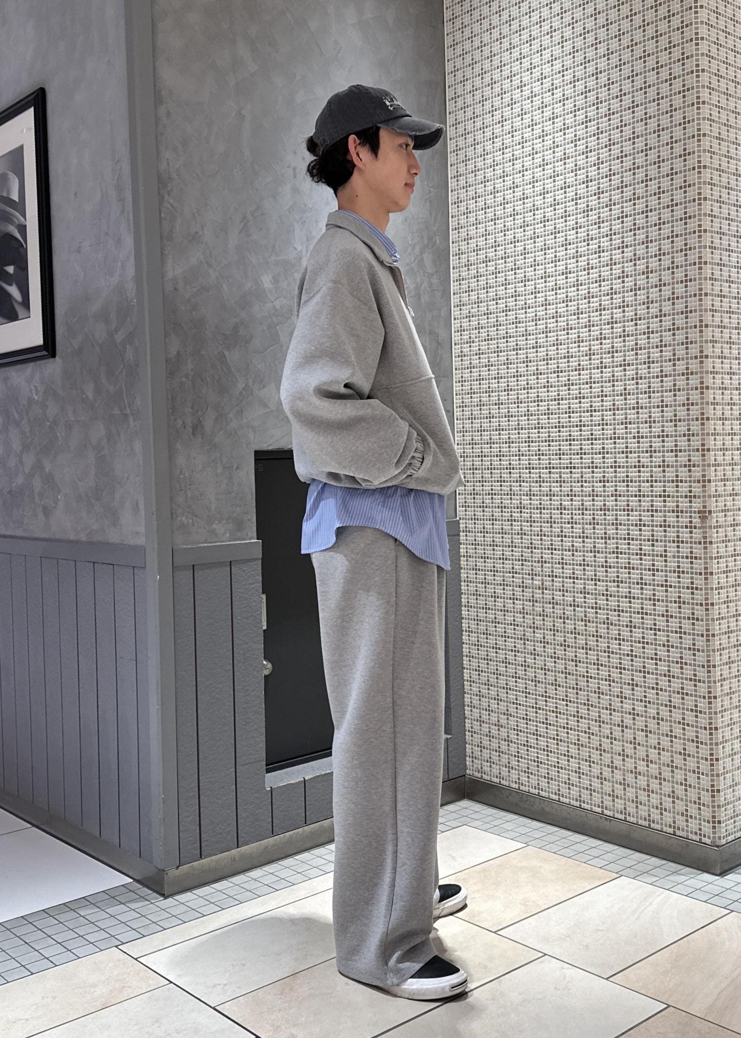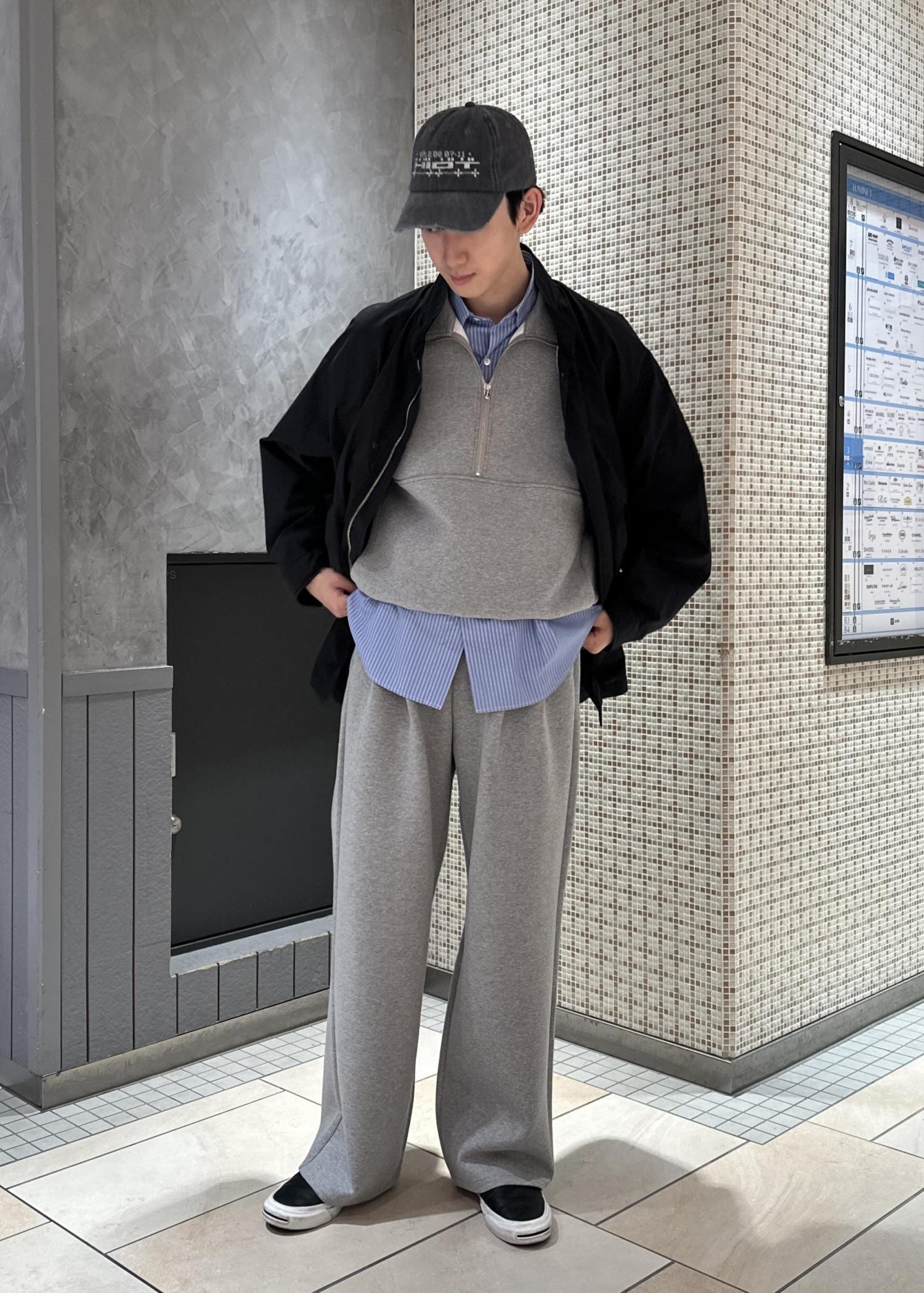 スウェットのセットアップにモッズコートを合わせたラフなコーデ。モノトーンでまとめ、差し色にブルーのストライプシャツをレイヤードすることで大人っぽく落ち着いた印象に仕上げました。