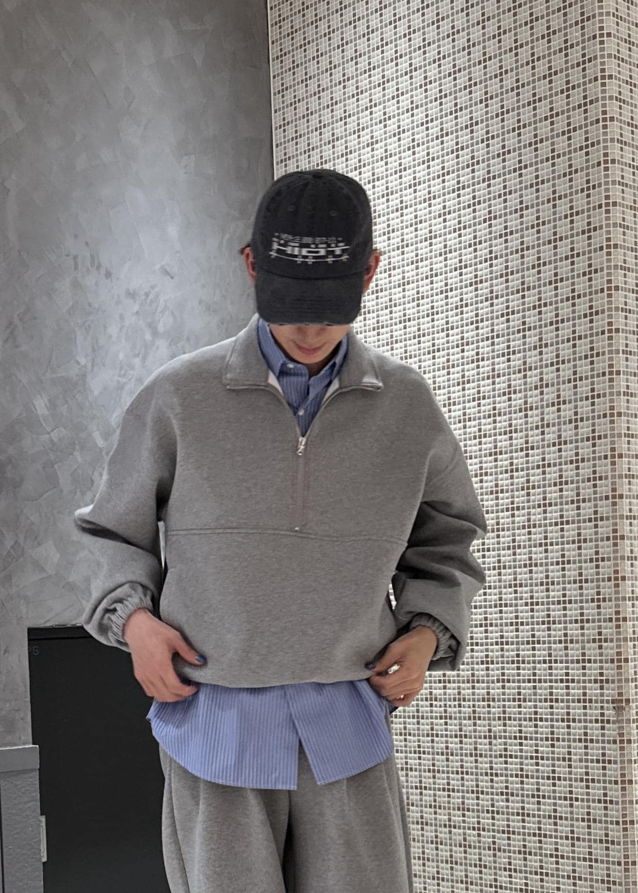 オーバーサイズ、短丈のハーフジップのスウェット。サラッとしていて、肌触りがよいです。楽ちんな着心地でラフな印象。キレイめの外しとしてもおすすめです。 -