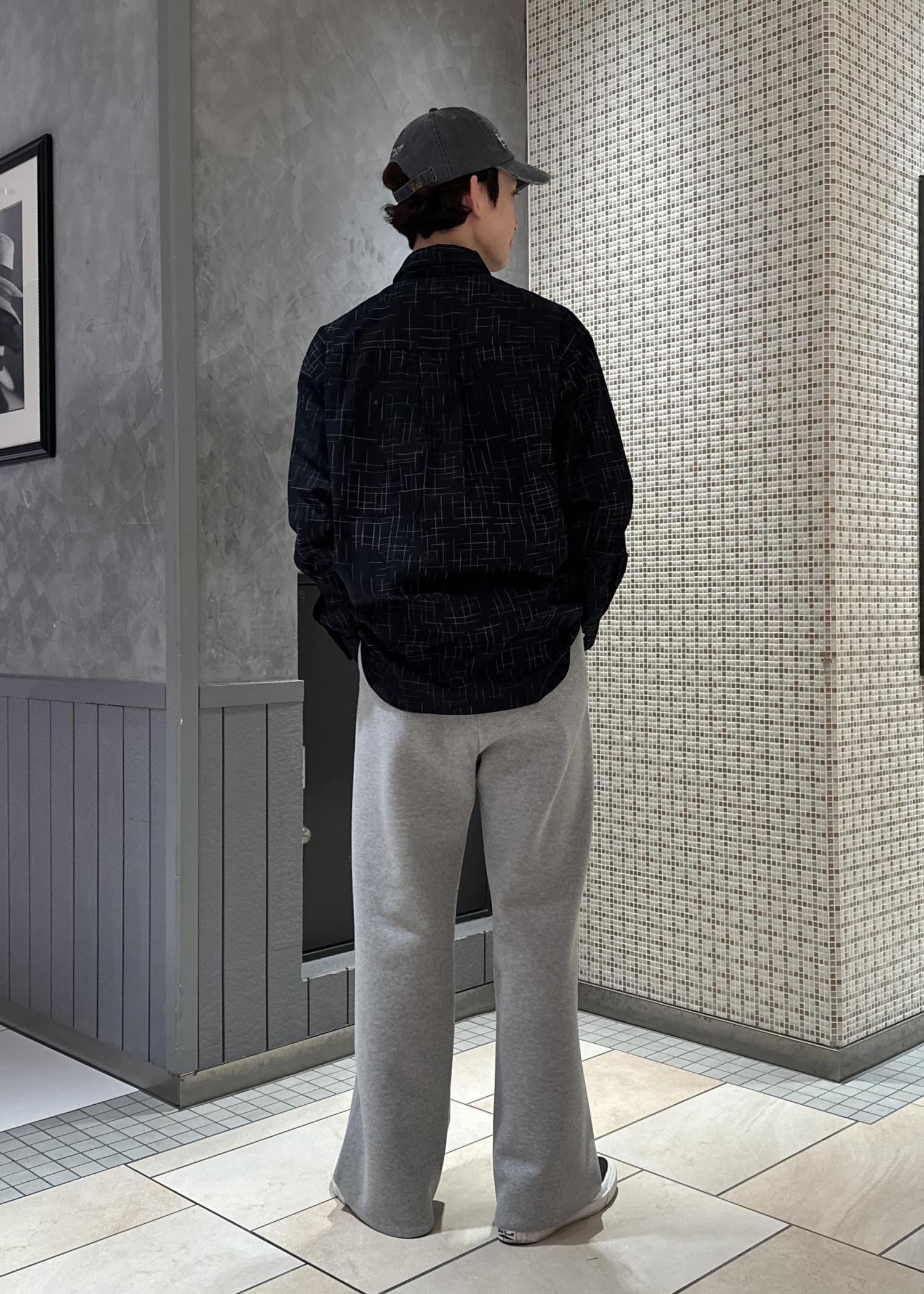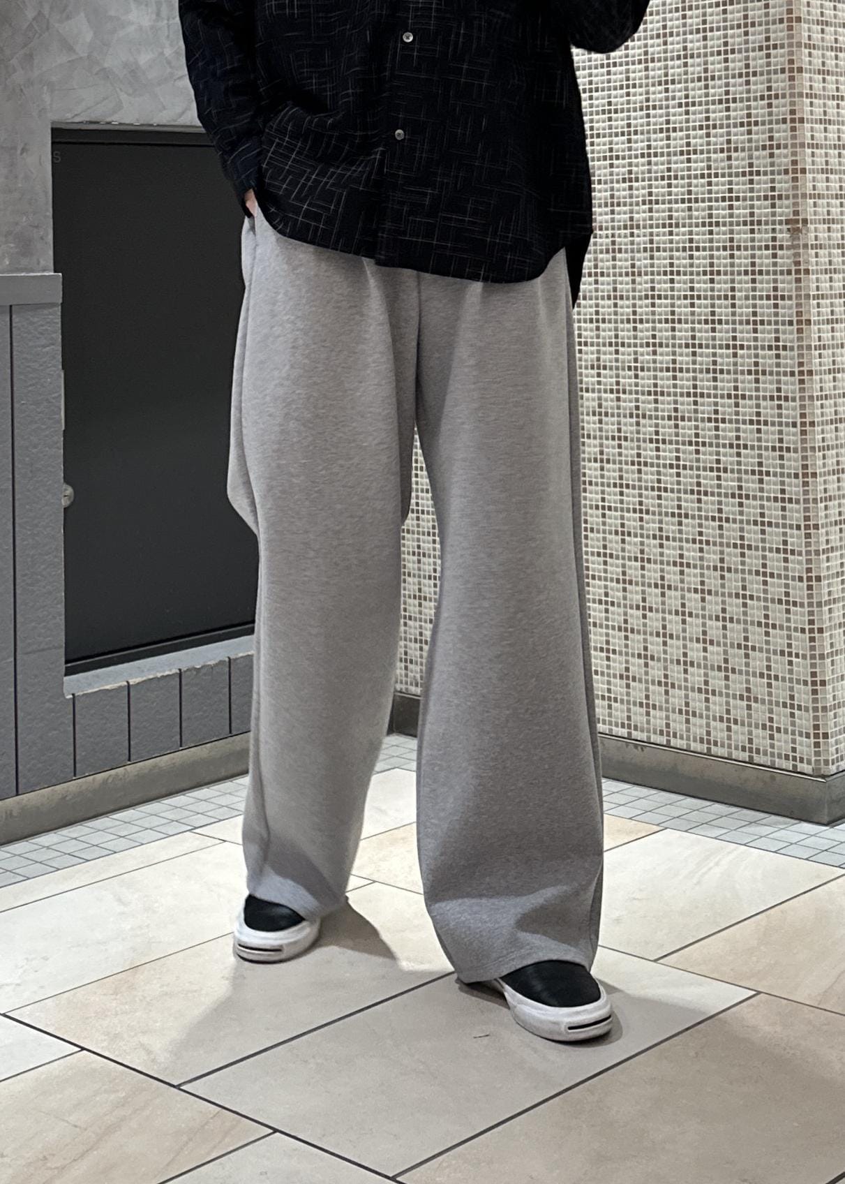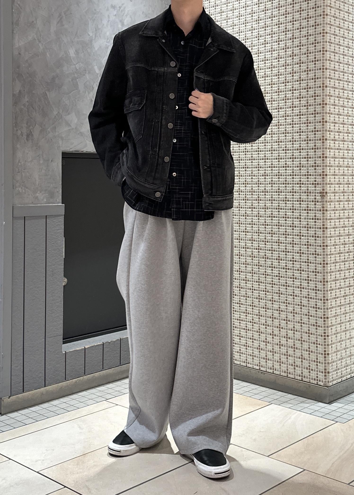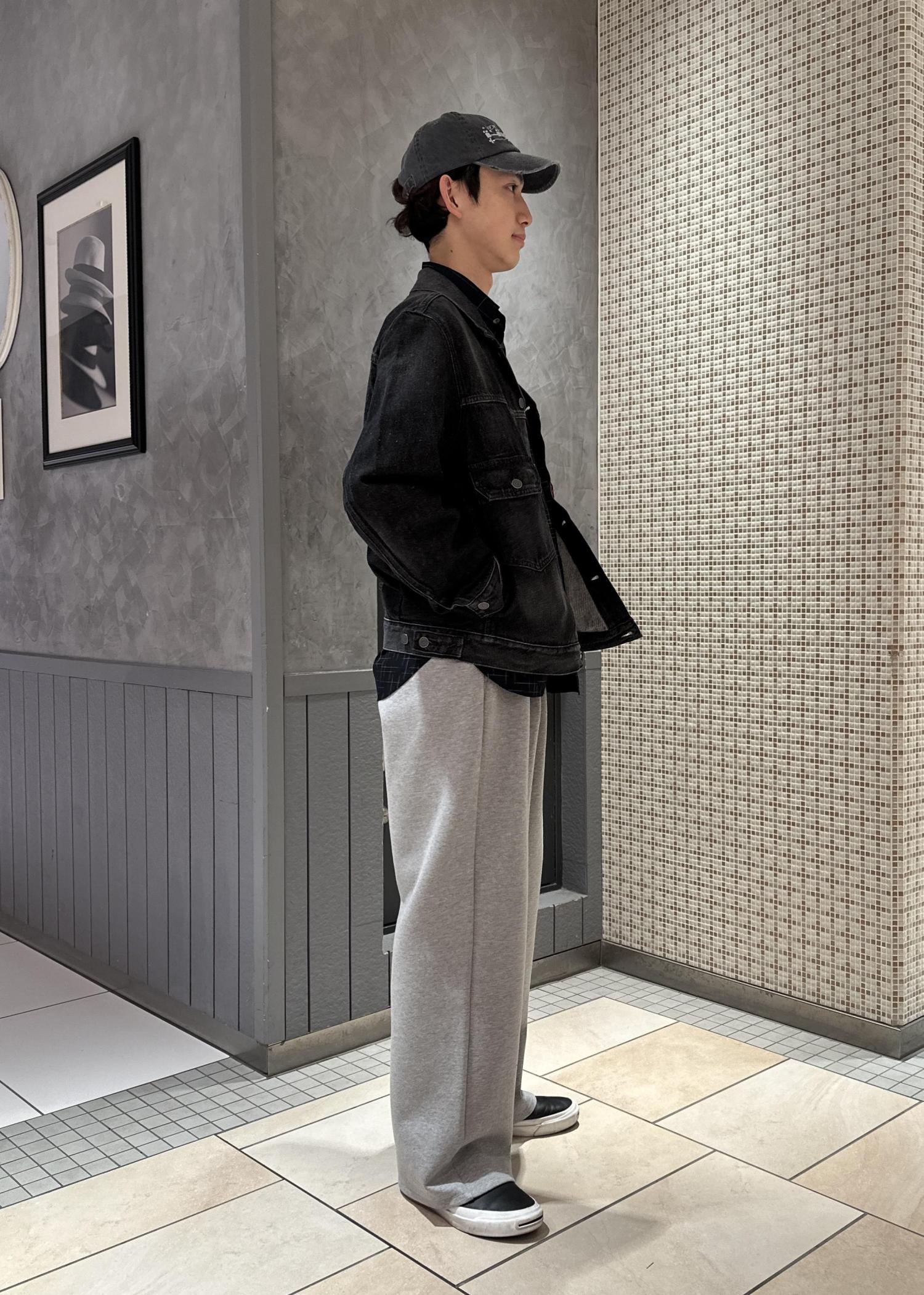 スウェットパンツにチェックシャツ、デニムジャケットを合わせたラフなキレイめカジュアルコーデです。モノトーンと硬めの素材で合わせ、統一感を出しました。全体的にシルエットはキレイでシンプルに。大人っぽく仕上げました。