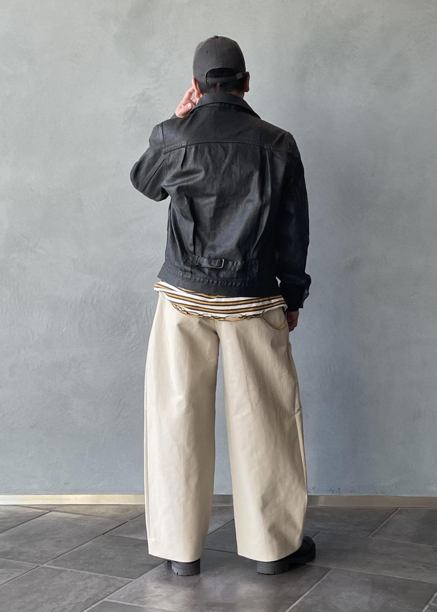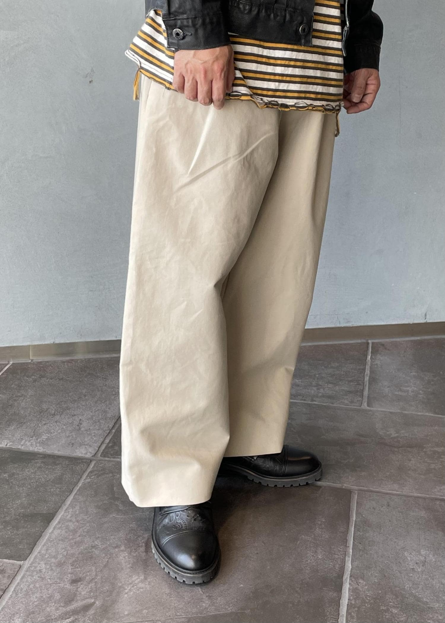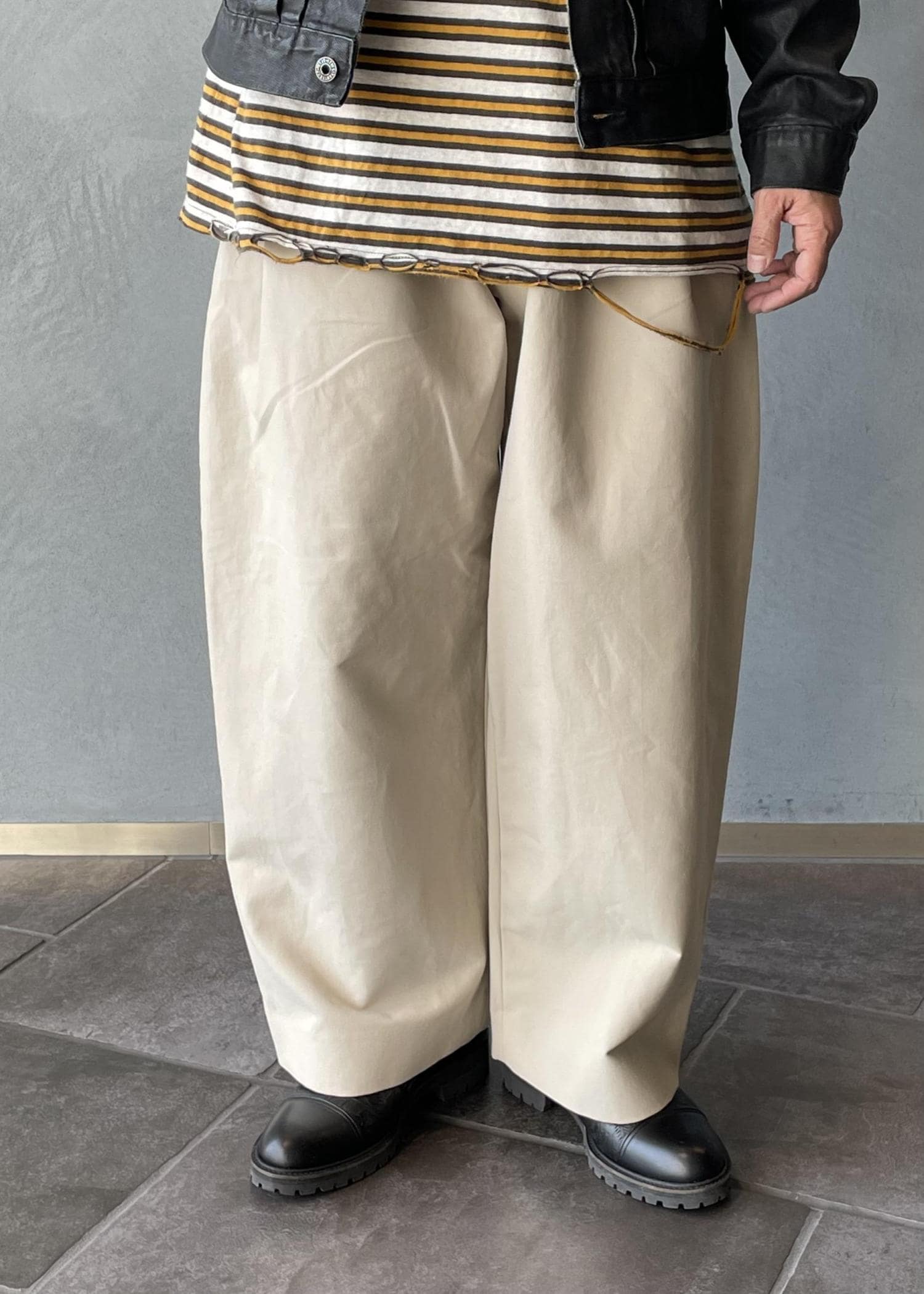 ADAM ET ROPÉ HOMMEコットンダブルクロス バギースラックスベージュ / M¥28,600レビューワタリに広がりがあり太さを存分にアピール出来るパンツです。