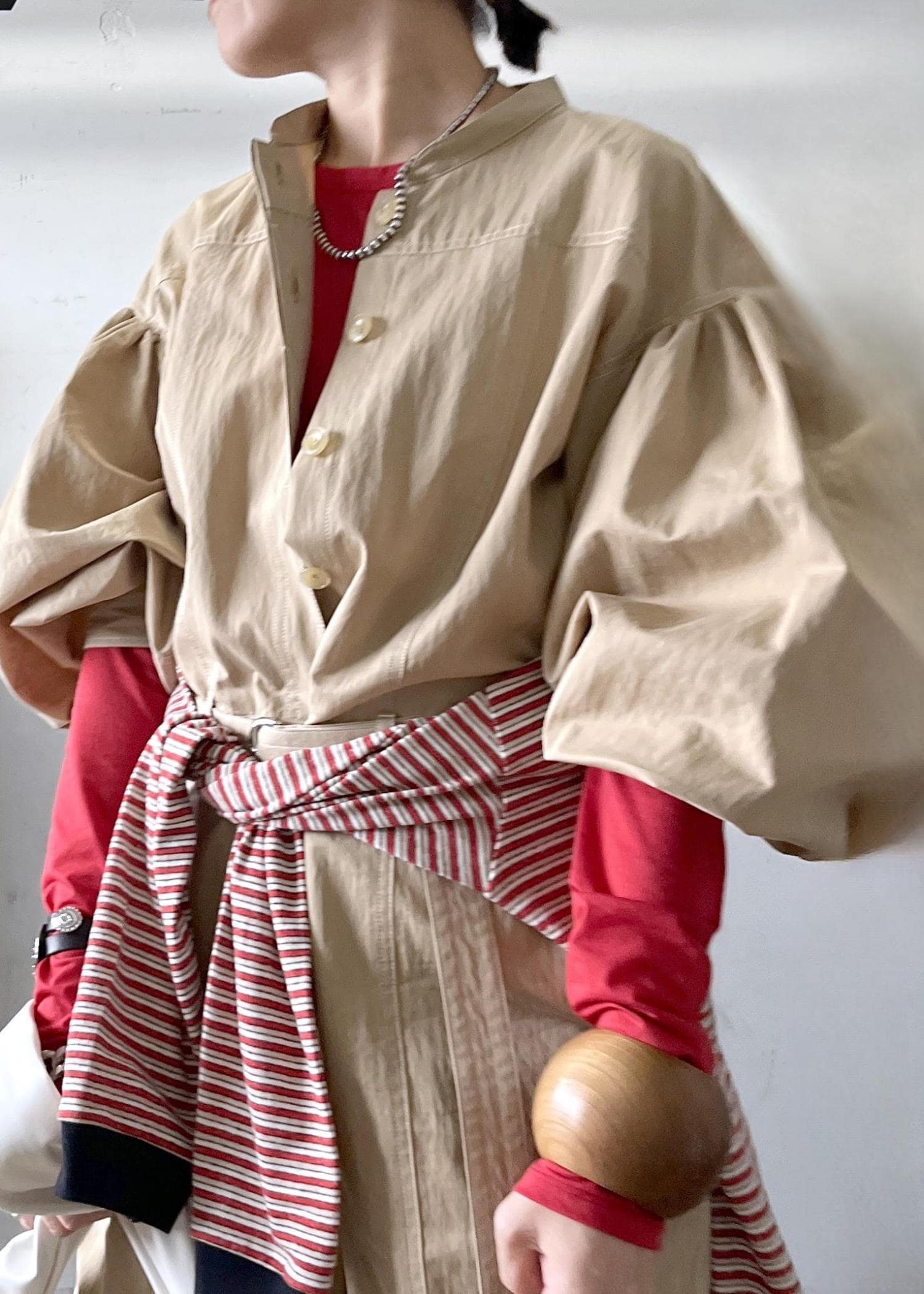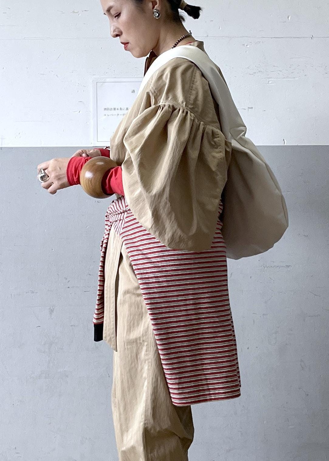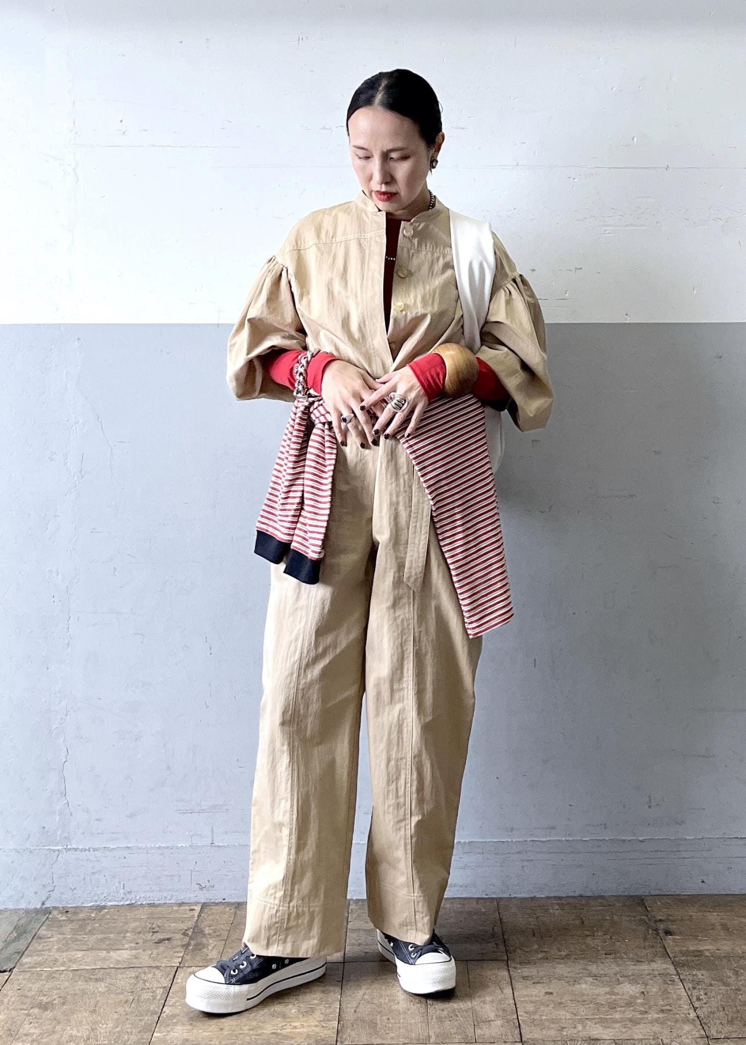 腰に巻いたボーダーカットソーで視線を上に集め、立体感のある着こなしに。