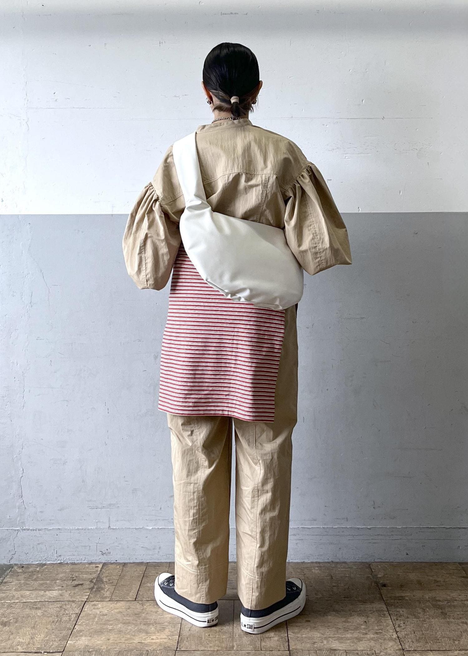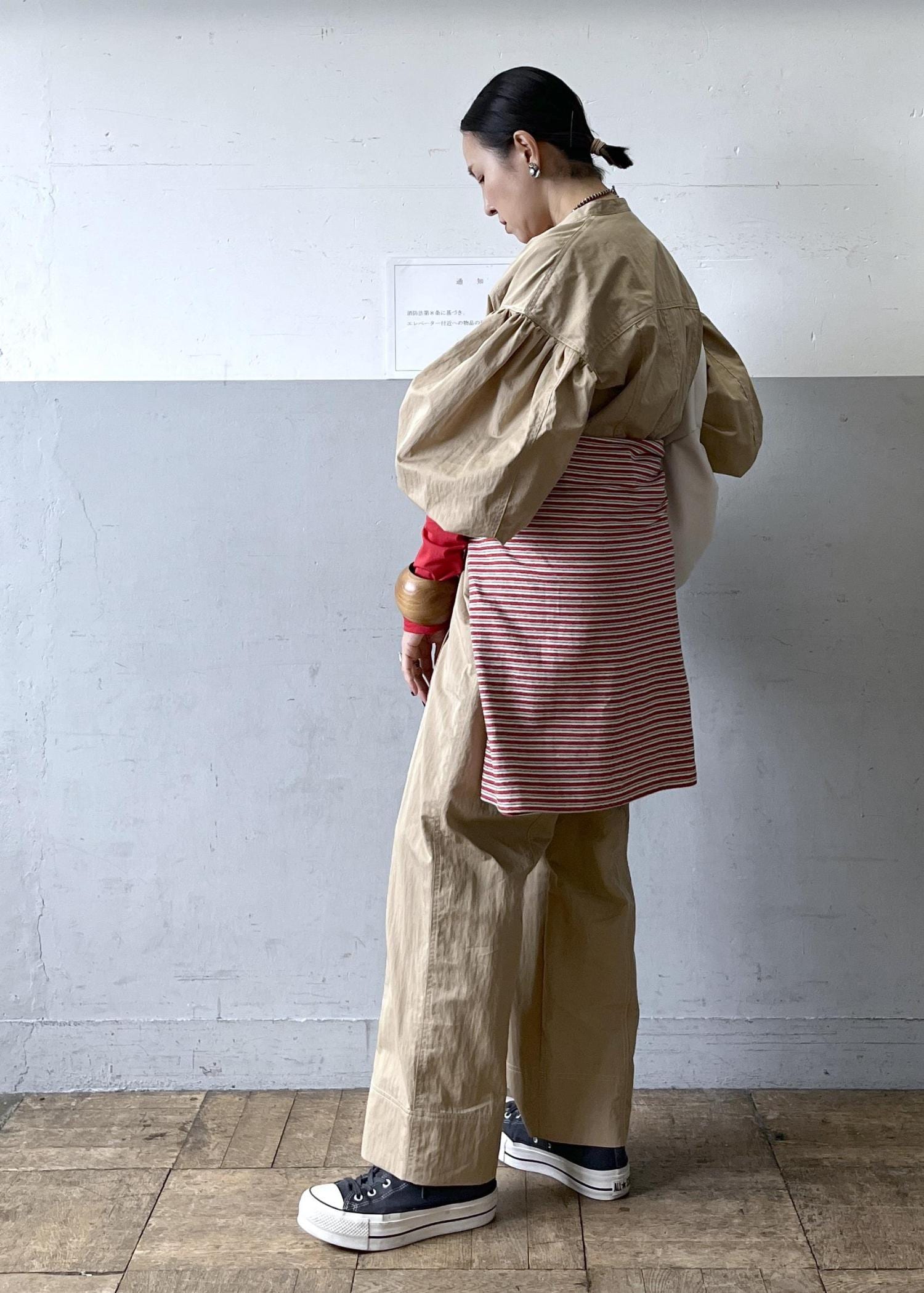 身長166cmで38サイズ着用。全体的にゆとりのあるサイズ感に見えますが、パンツはトップスに比べて細身のサイジング(細すぎるわけではない)なのでいつものサイズ感で大丈夫かと思います。