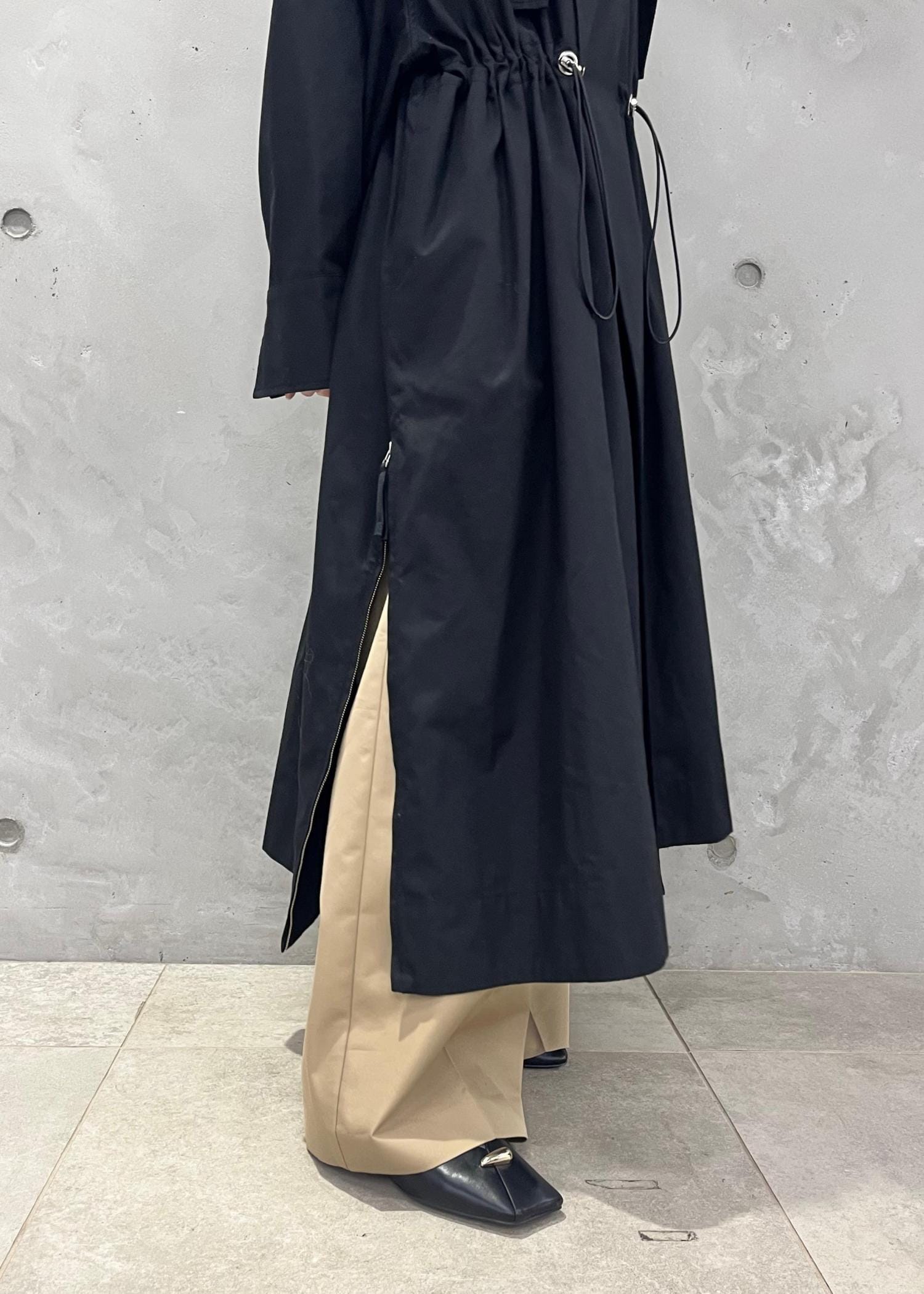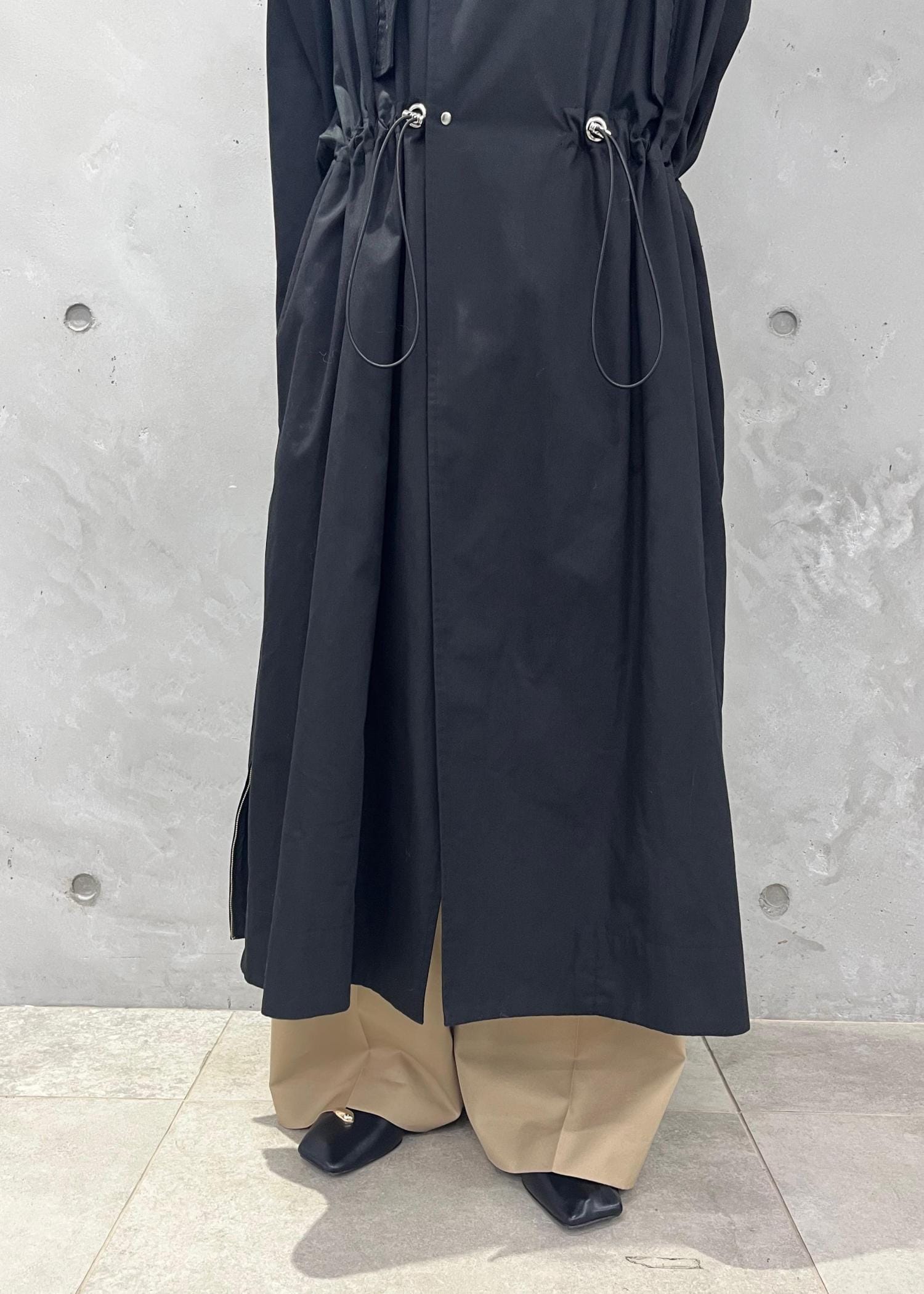 ウエストよりやや高めの位置がドロスト仕様になっており、ギャザーを絞ることもできます!両サイドの裾にはファスナーがあるのでお好みでスリットも入れられます!