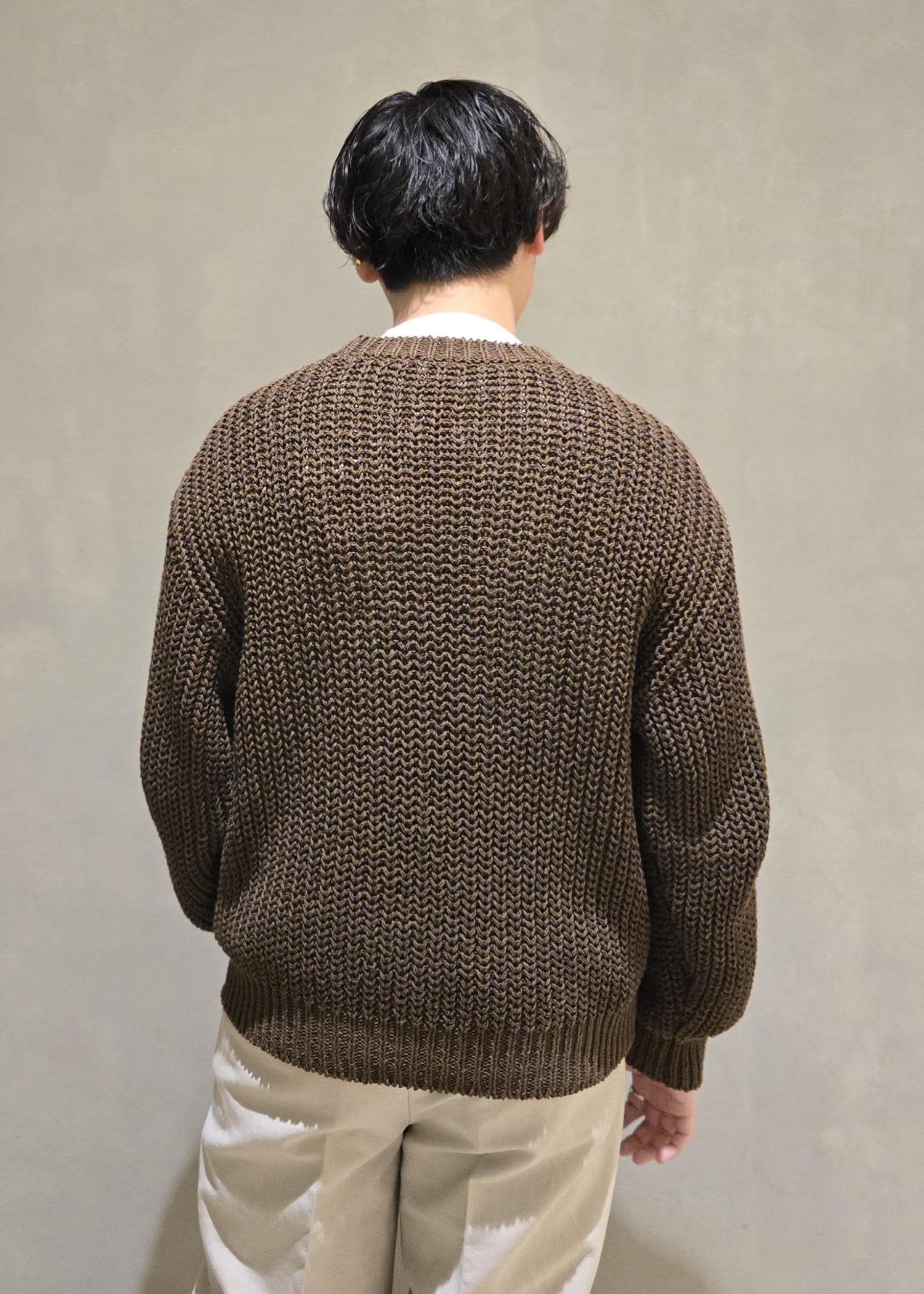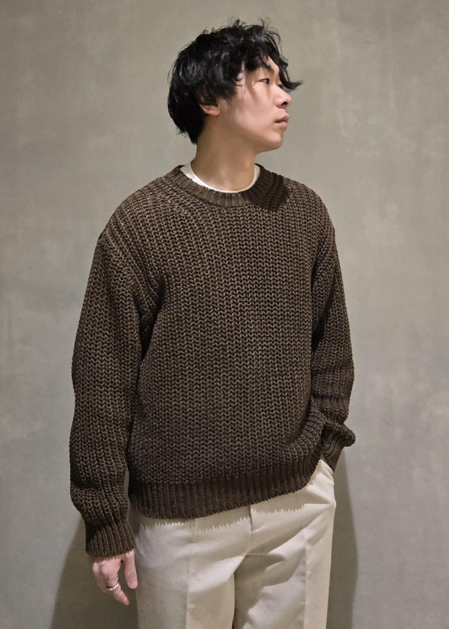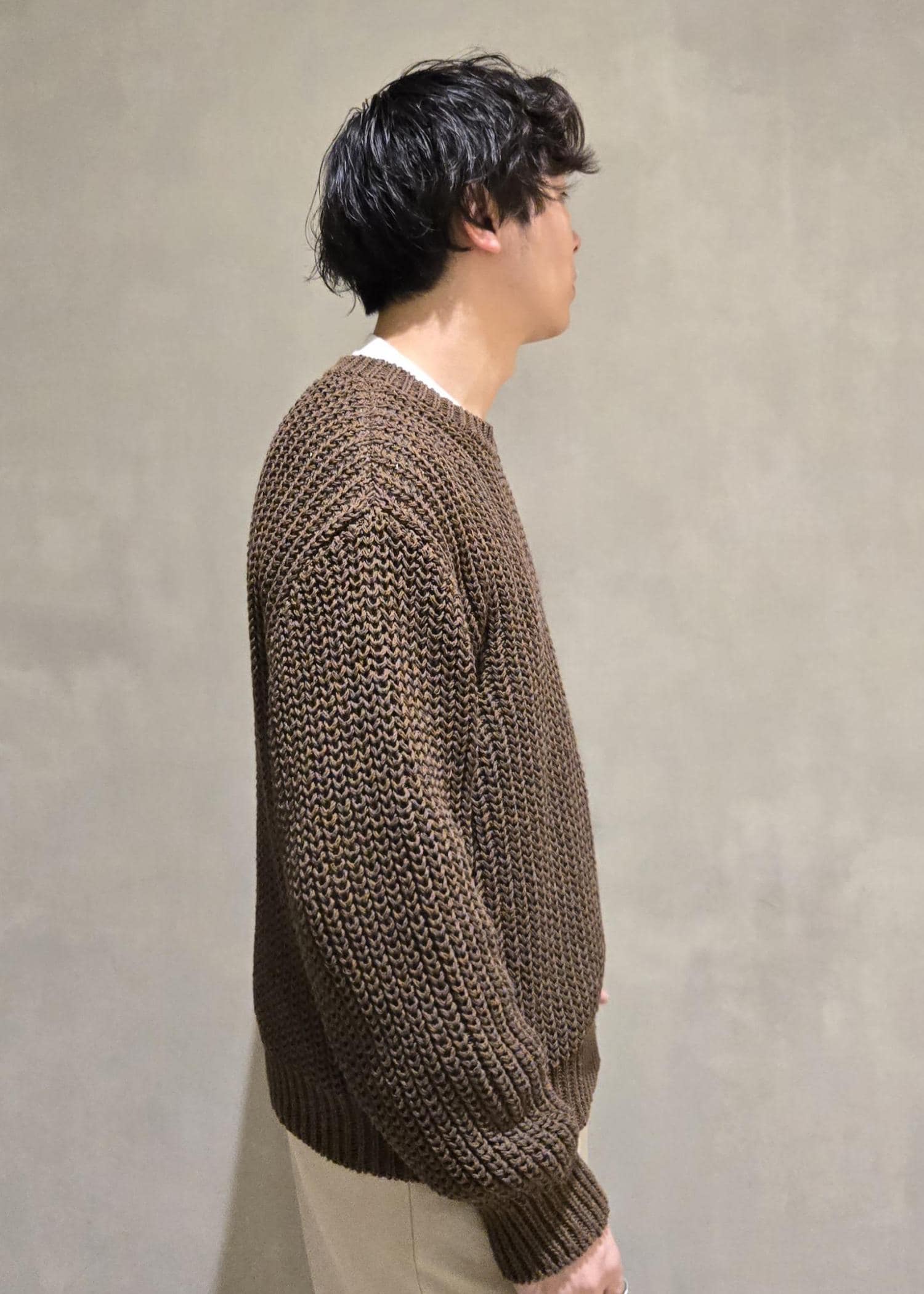 大番手の扁平糸を撚糸でミックスしローゲージの編み機で編んだ色味や風合いが抜群の1枚です!