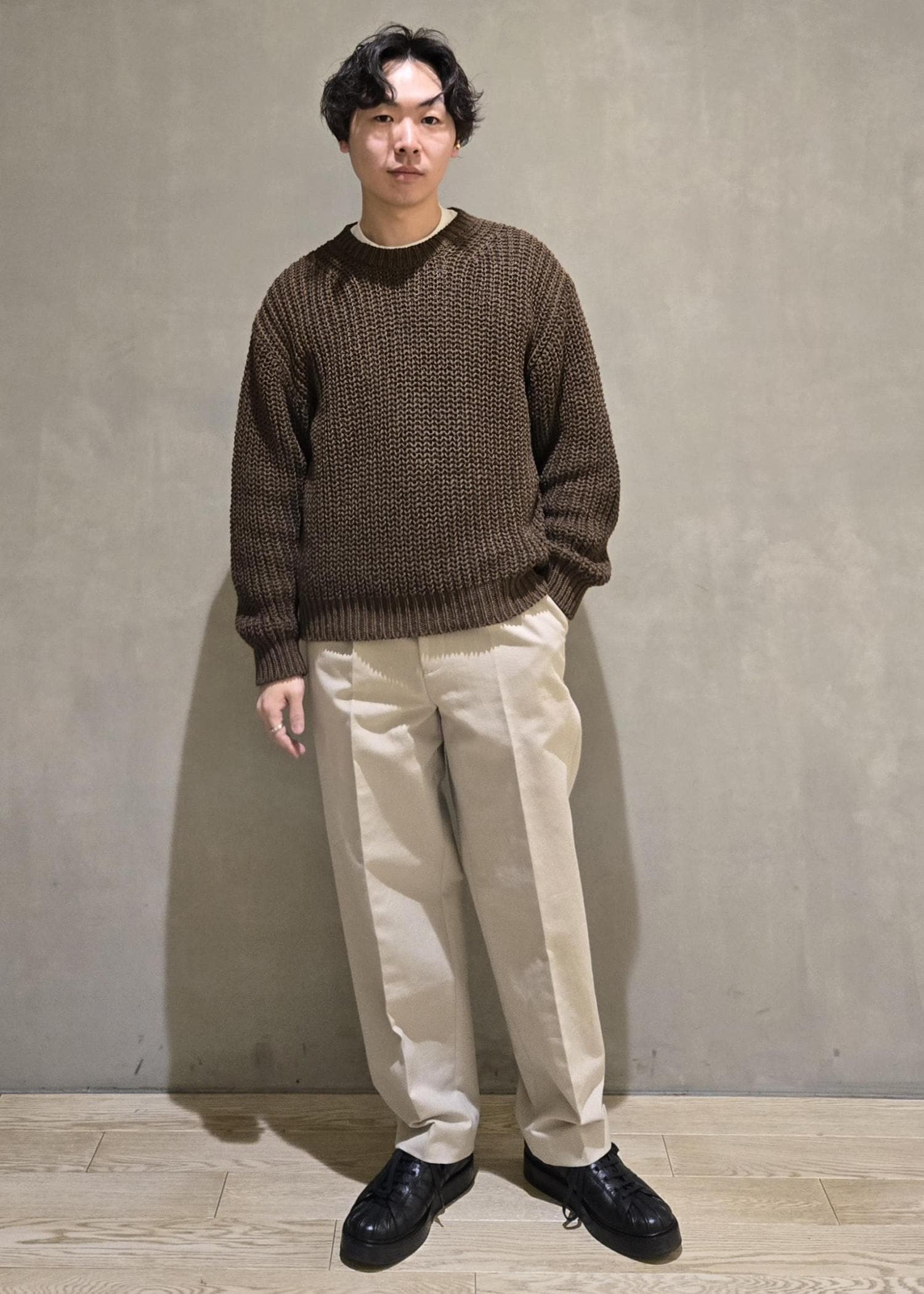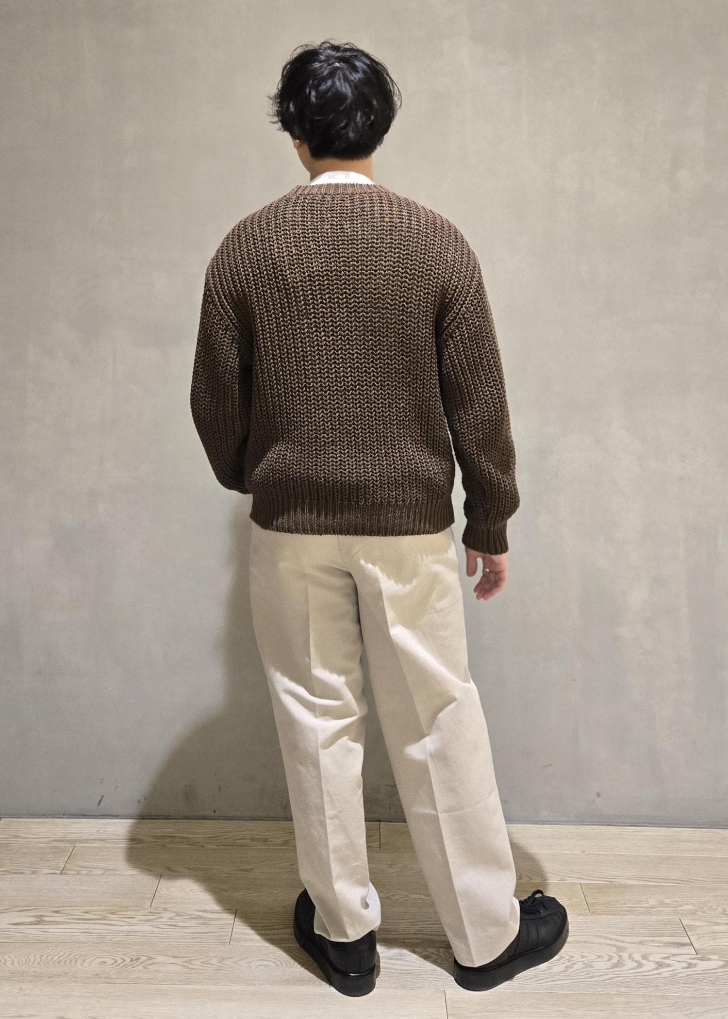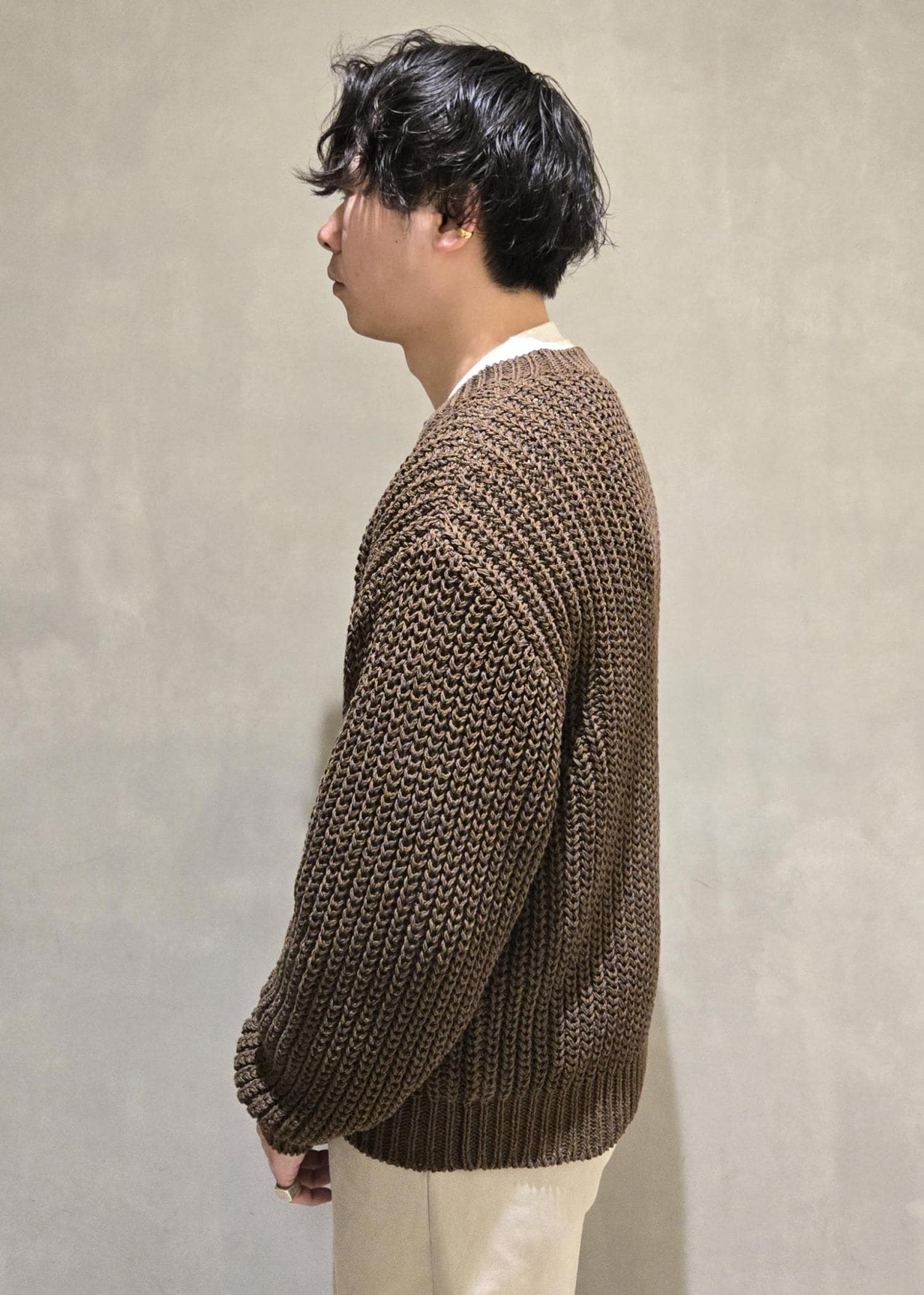 大番手の扁平糸を撚糸でミックスしローゲージの編み機で編んだ色味や風合いが抜群の1枚です!