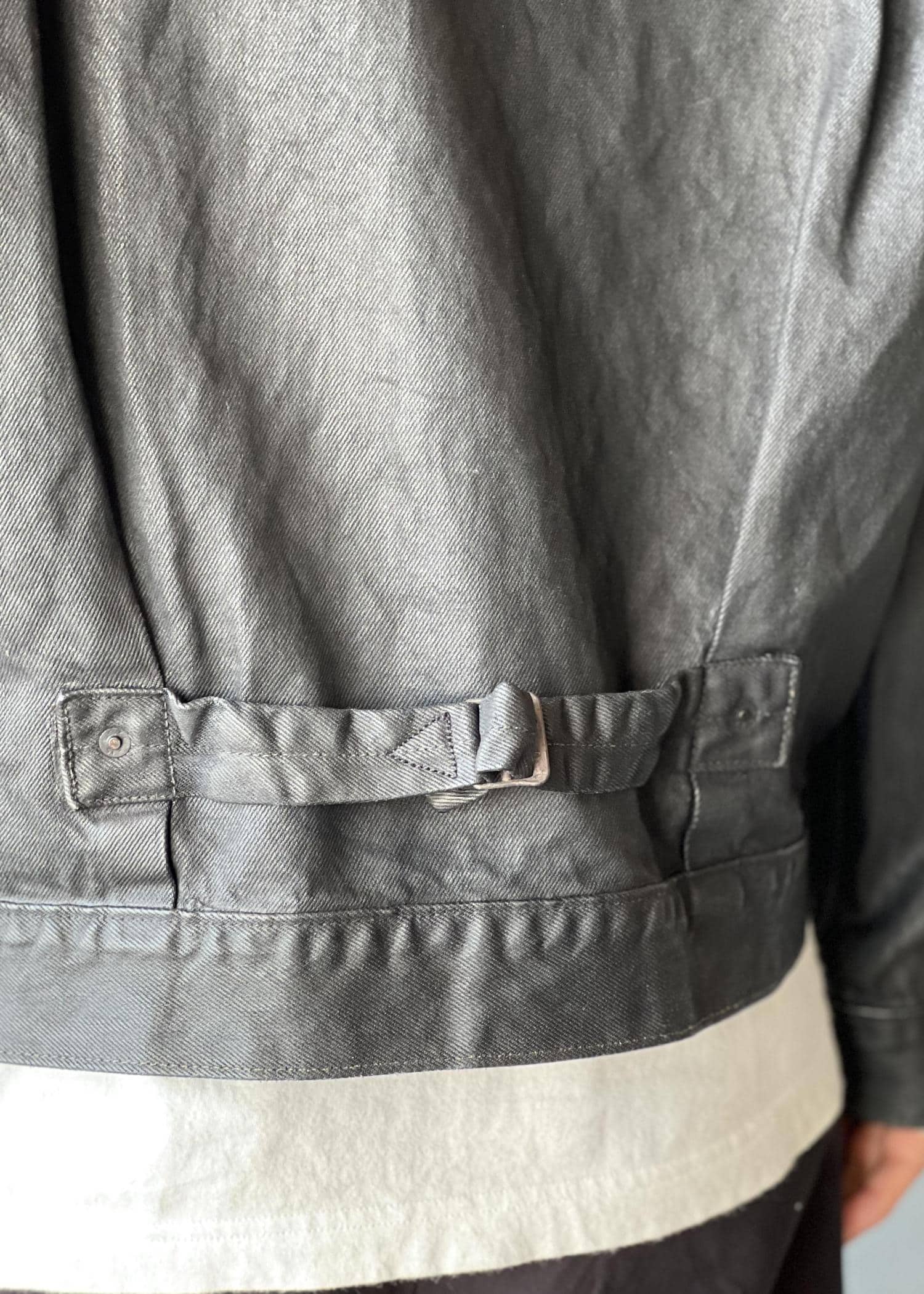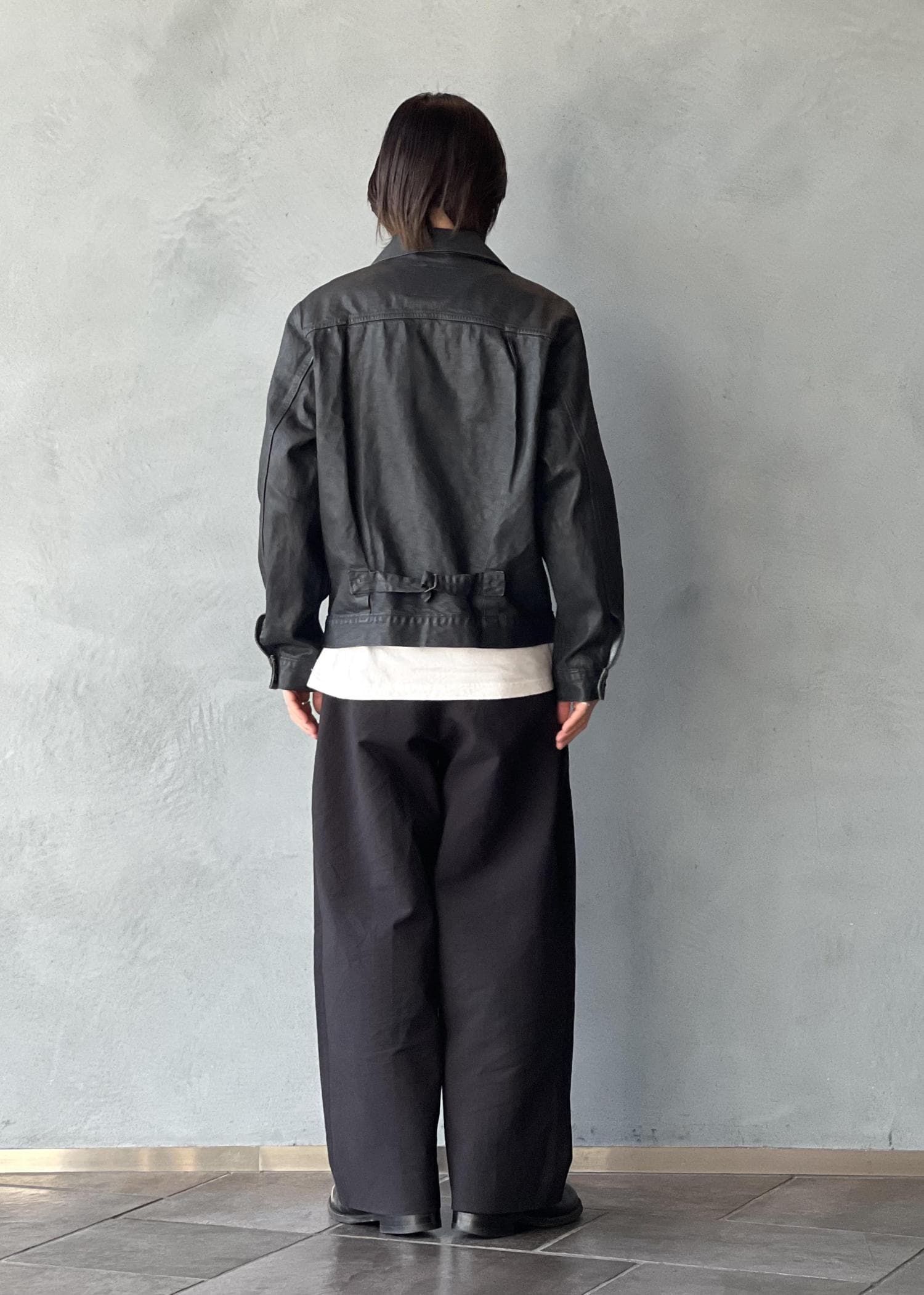デニムのベースカラーにはウォッシュをかけたヴィンテージ風のライトインディゴカラーにし、その上 にブラックの PUコーティングを施すことで、伝統的かつ前衛的でコンテンポラリーな風合いを表現。