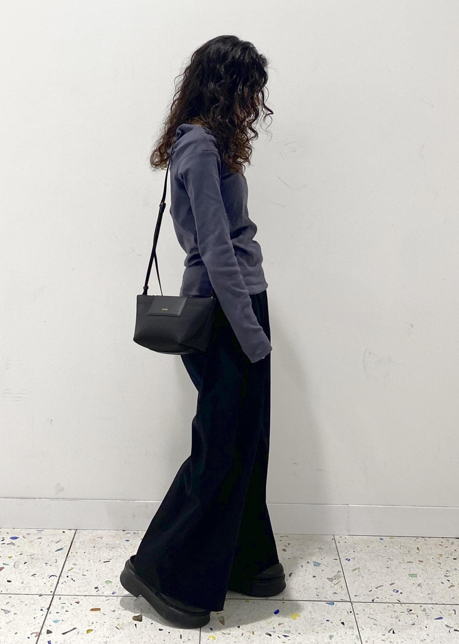 程よいフィット感で、体のラインは出にくいデザインです。 -