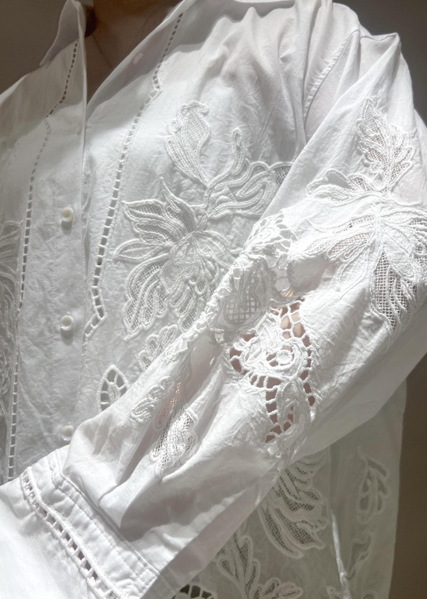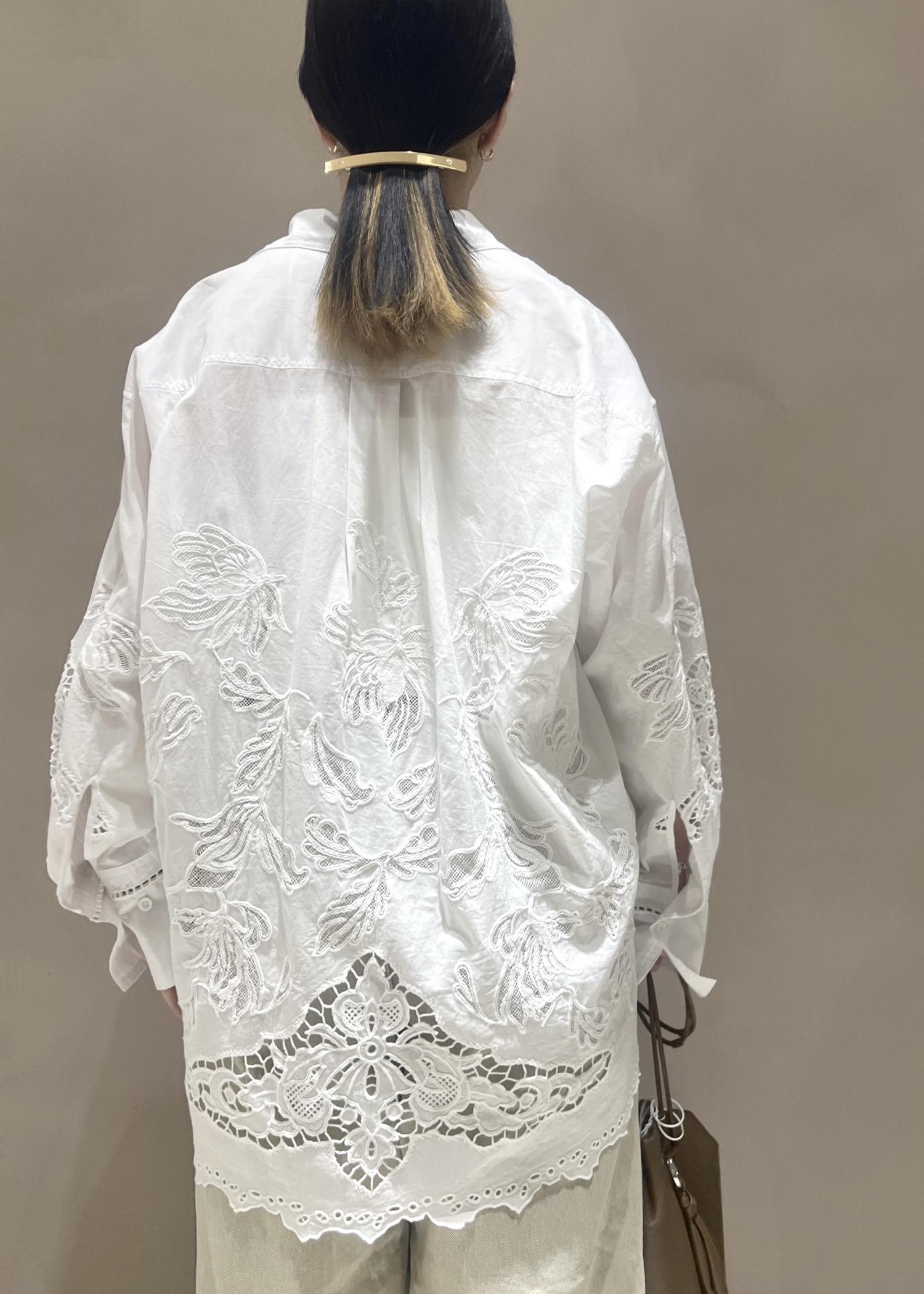 NEW!EMOELLE【EMOELLE】エンブロイダリーシャツホワイト / F¥29,700レビュー柔らかい素材感で着心地がとてもいいです♡裾にかけてボリューム感のあるデザインでゆったりしていてレースのデザインはもちろんシルエットも◎です!