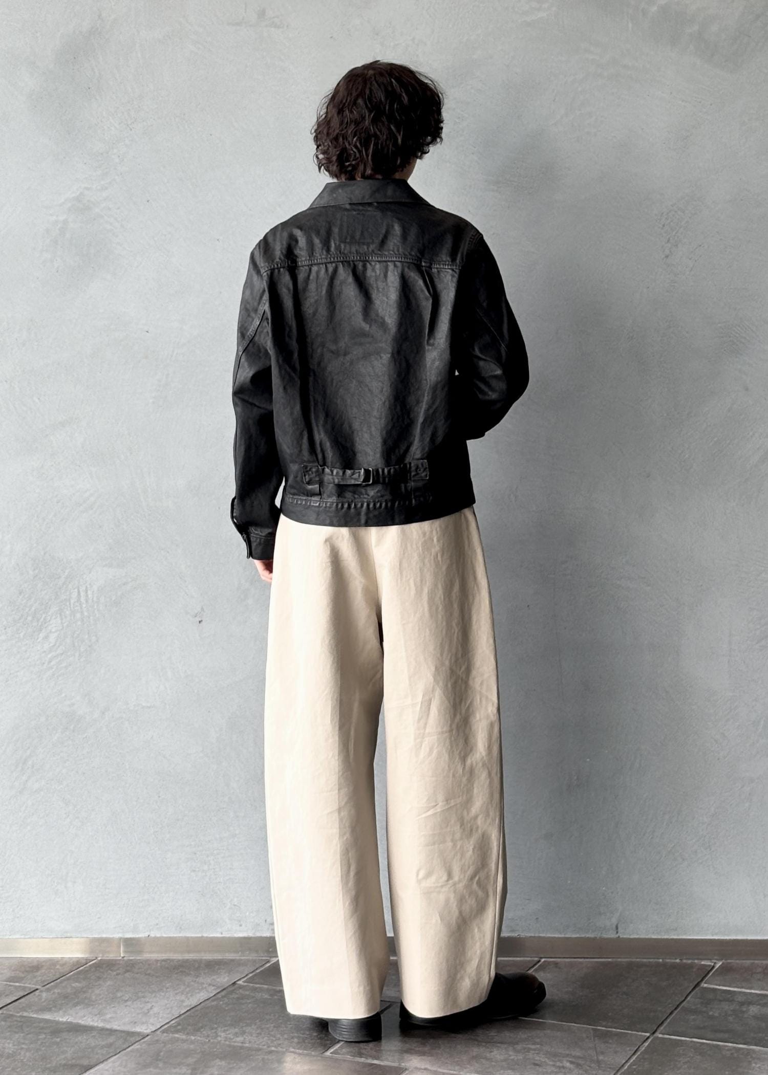 デニムのベースカラーにはウォッシュをかけたヴィンテージ風のライトインディゴカラーにし、その上 にブラックの PUコーティングを施すことで、伝統的かつ前衛的でコンテンポラリーな風合いを表現。