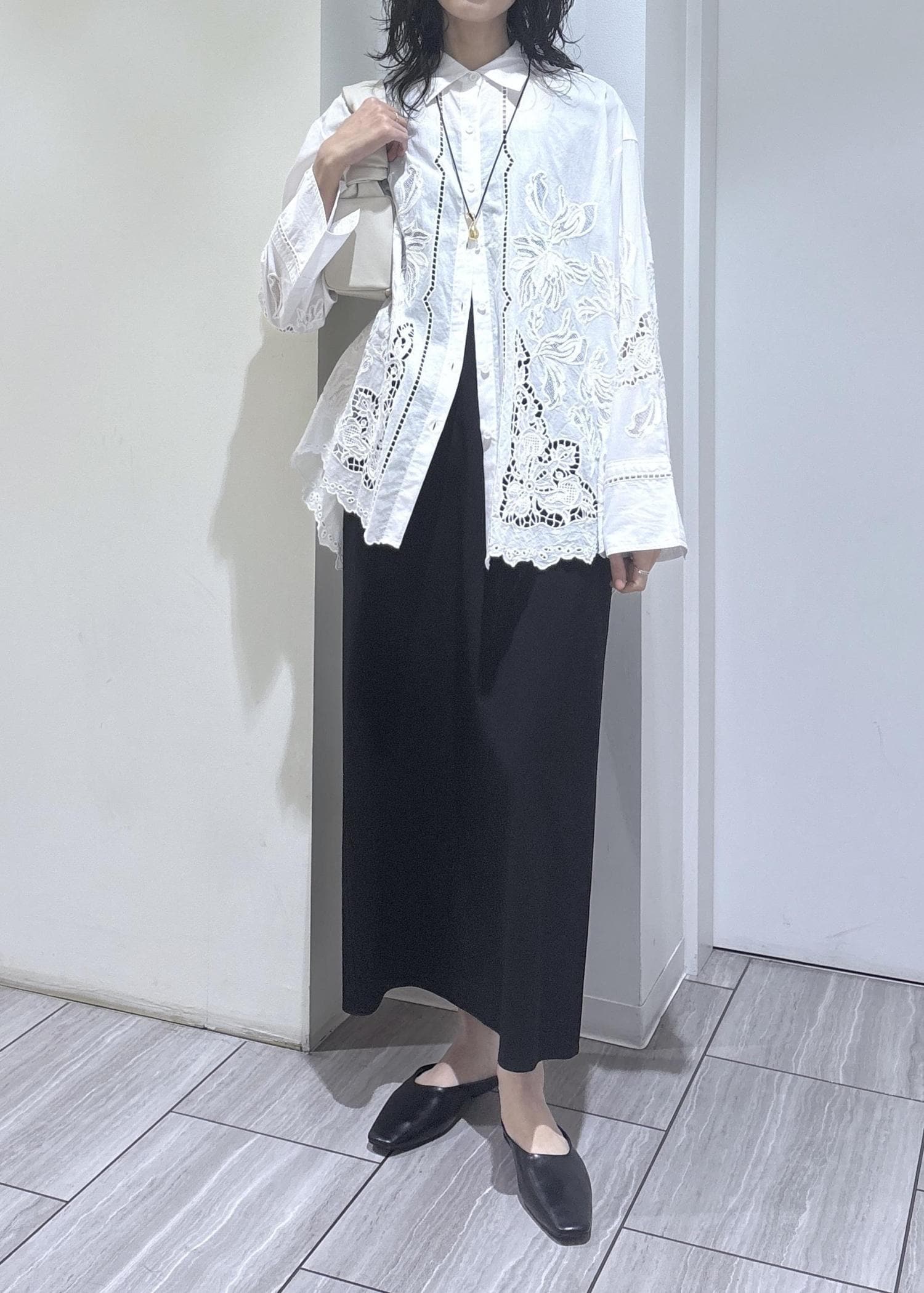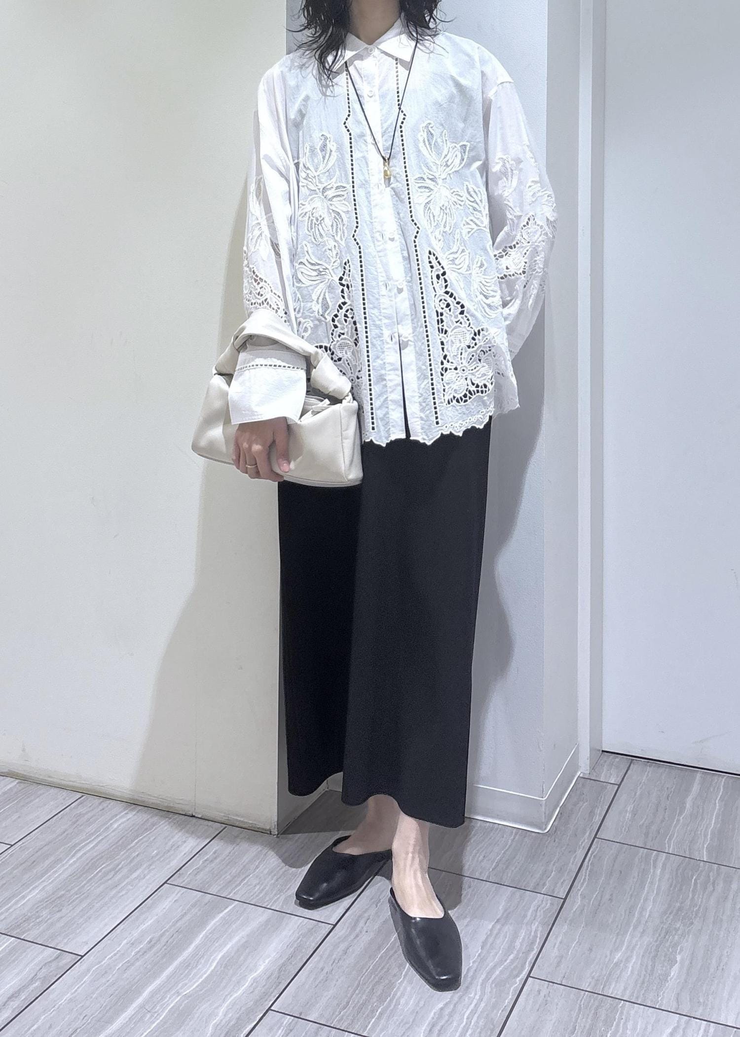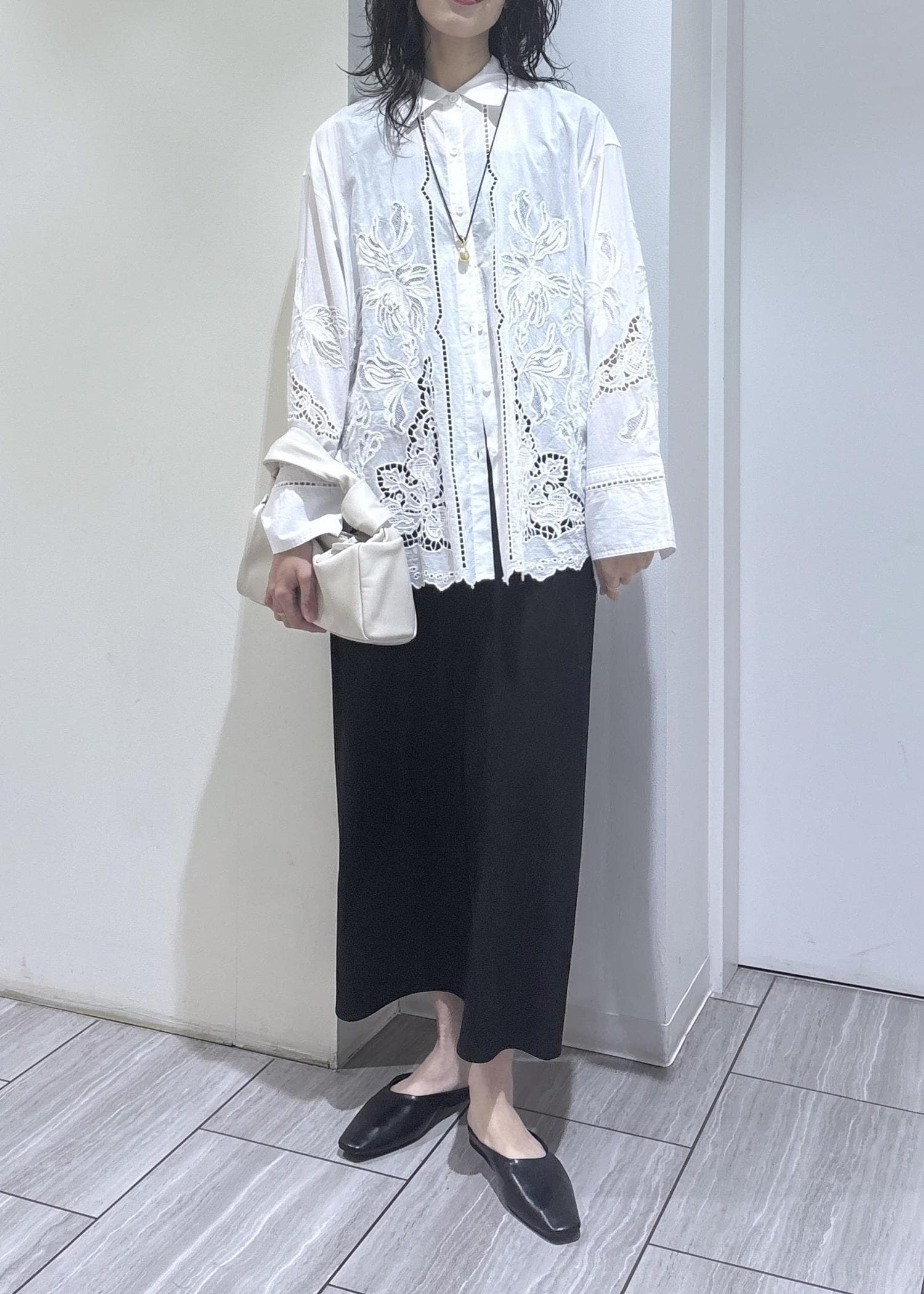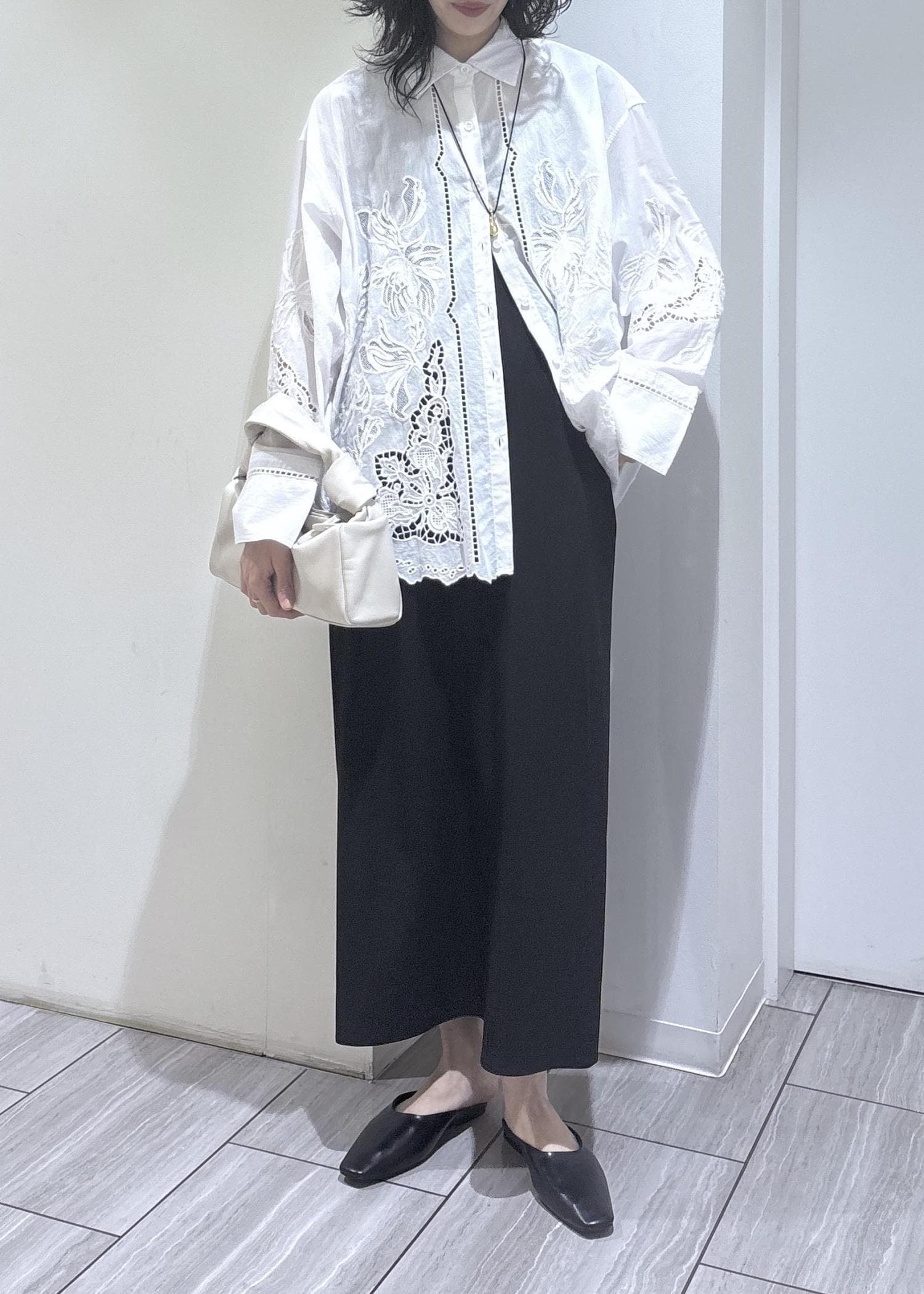 本日は【EMOELLE】のエンブロイダリーシャツを着用したモノトーンコーデのご紹介です。