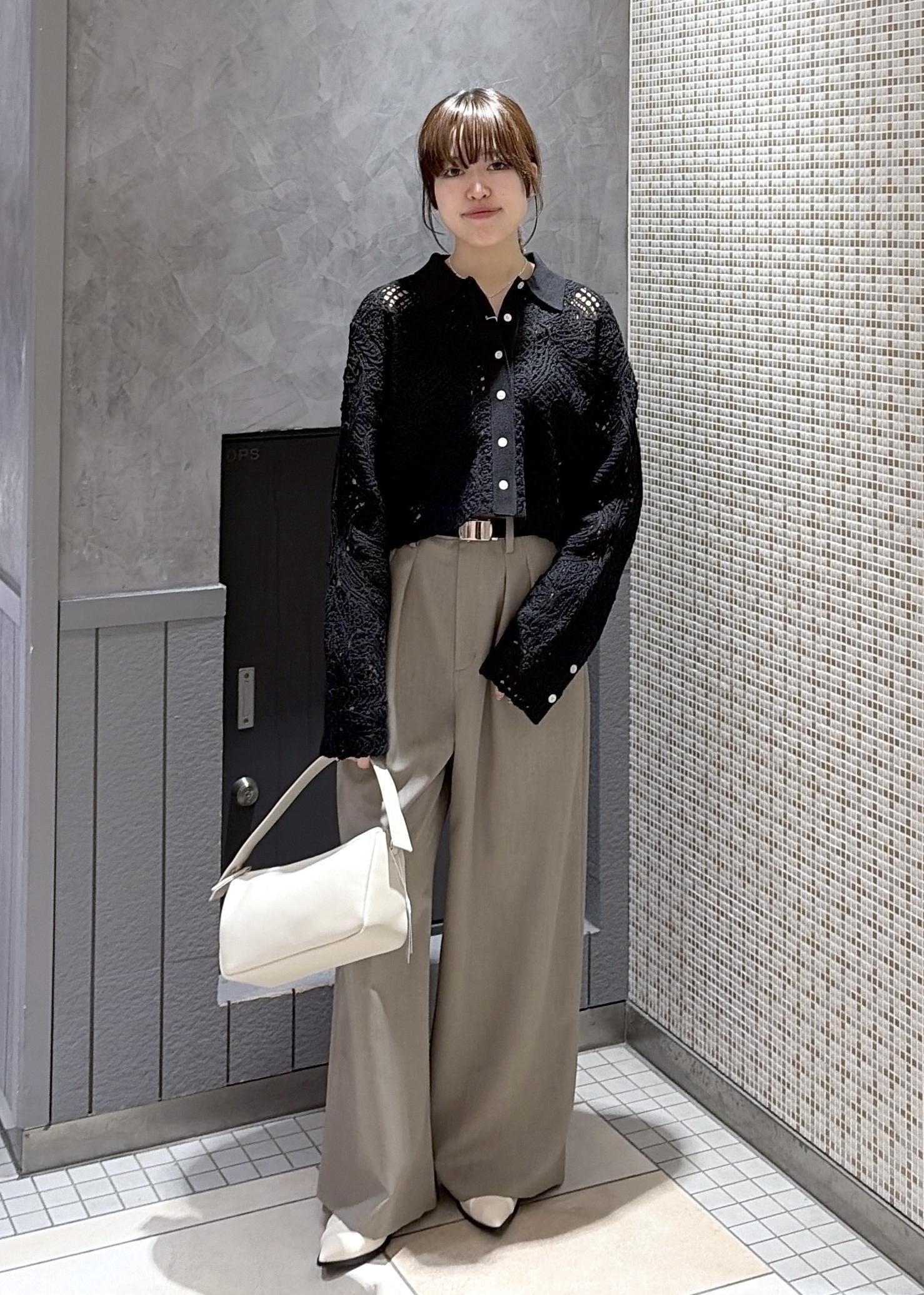 今回はコードレースパターンニットシャツを使ったコーディネート。フロントを閉めてシャツとして着用しました。