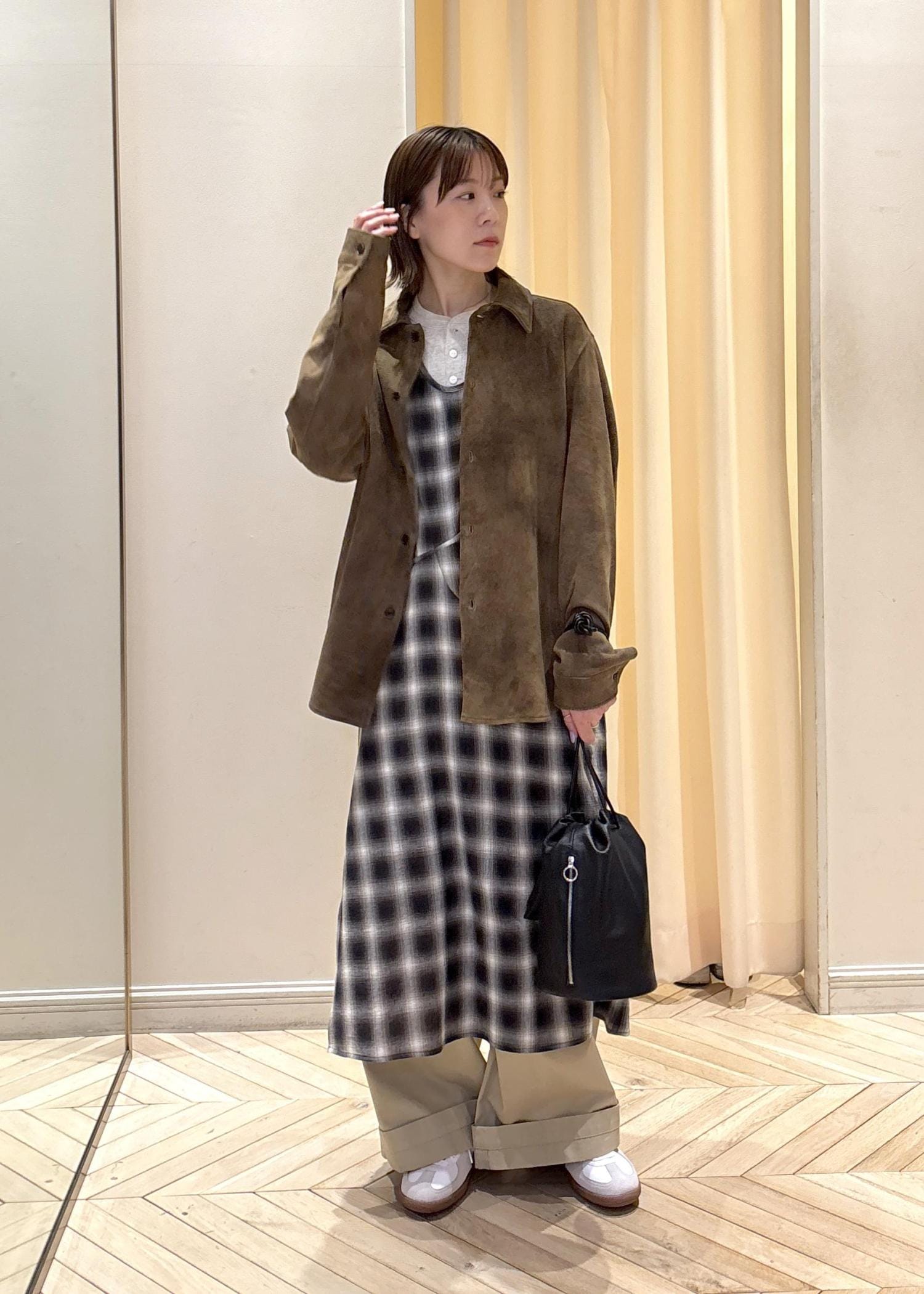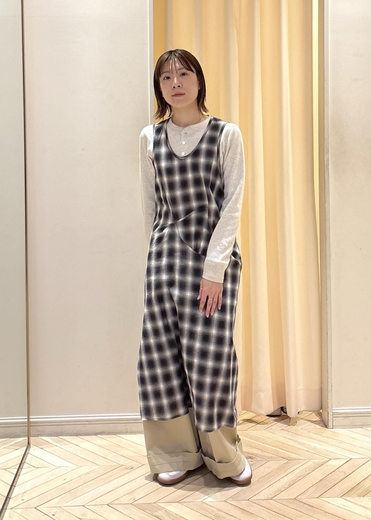 チェックのワンピで少し華やかさを出しつつ、ベージュパンツと合わせて、色味をまとめてみました♪(๑ᴖ◡ᴖ๑)♪