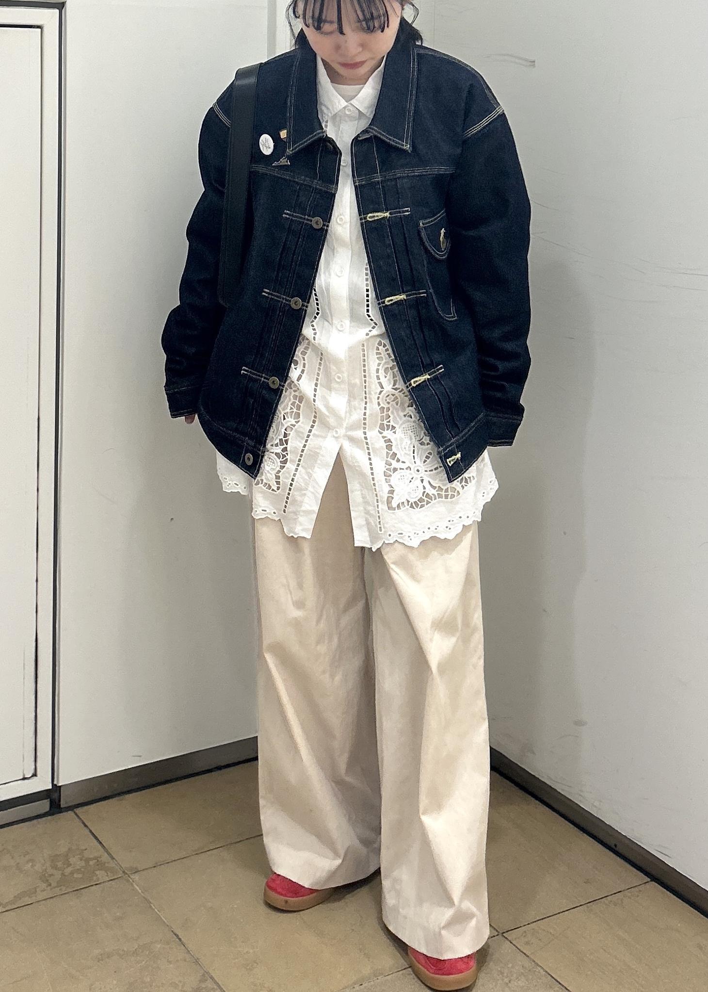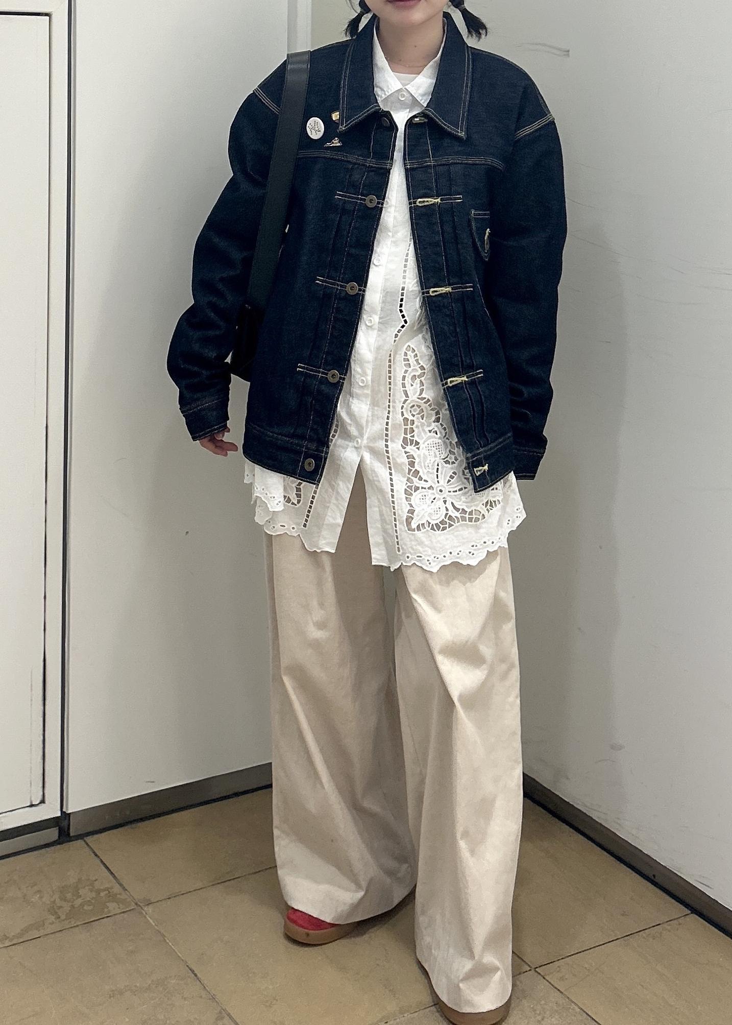 リアルバイしたデニムジャケットに、流行りのバッチやピンをいくつかつけて、ワンポイントに