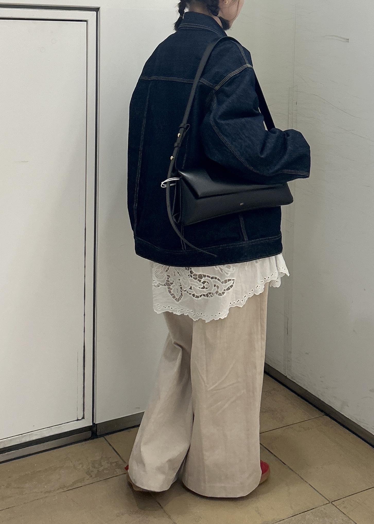財布、携帯等貴重品が入るサイズ感。荷物少なめの方や小さめバックをお探しの方におすすめです。