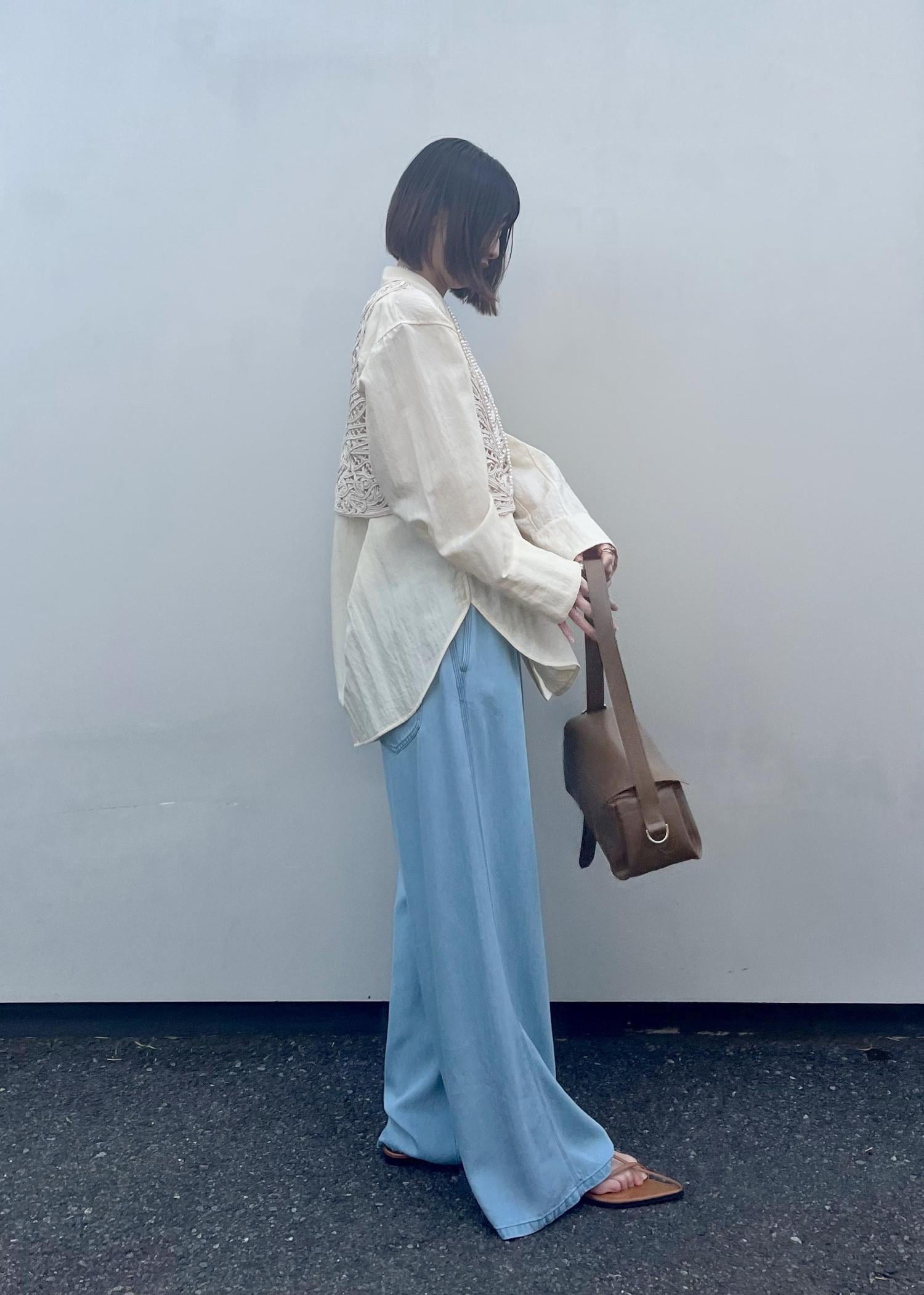 ボトムスで着用している『ライトデニムイージーパンツ』は昨年も大人気だったアイテムで、新カラーが出ました!