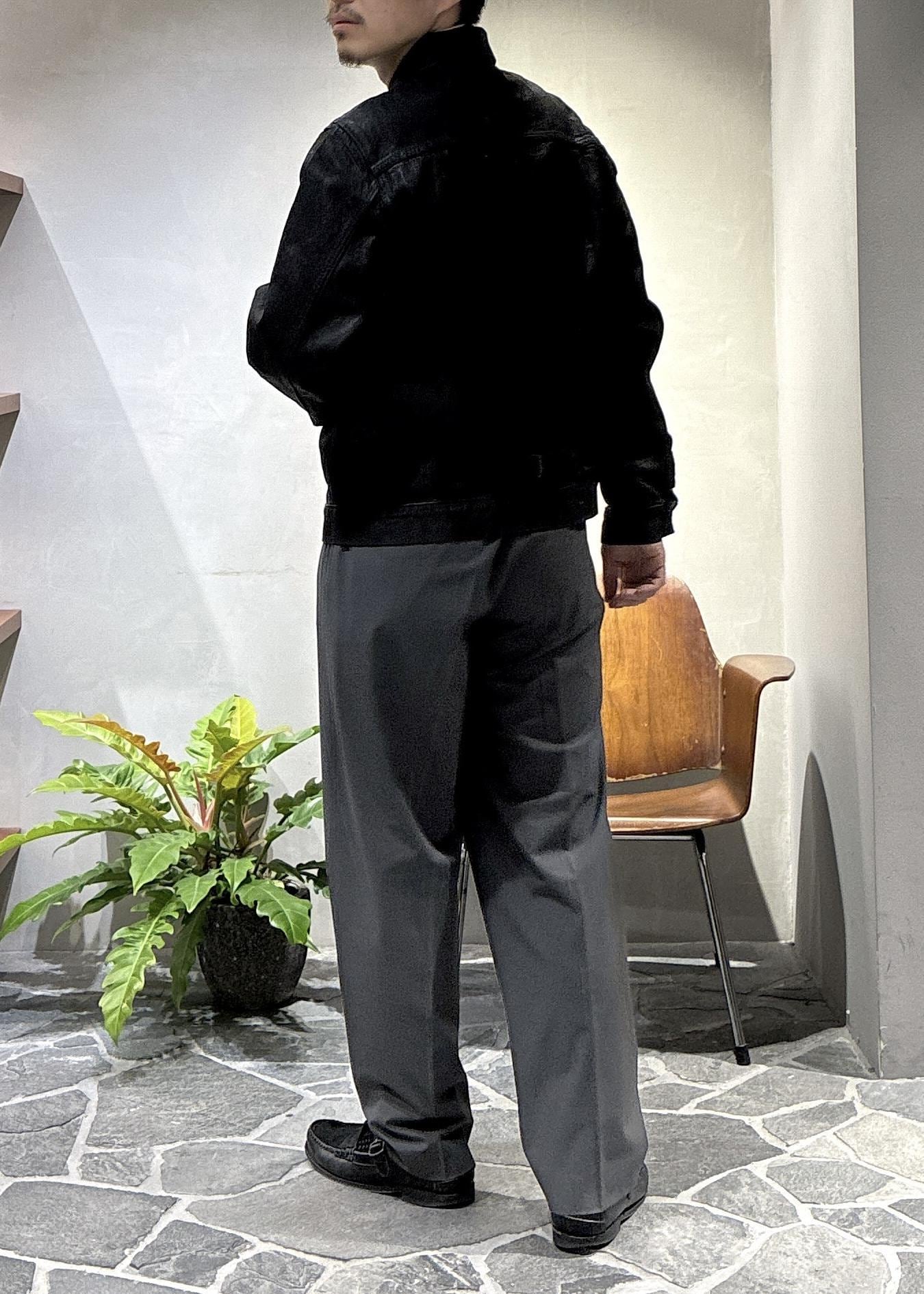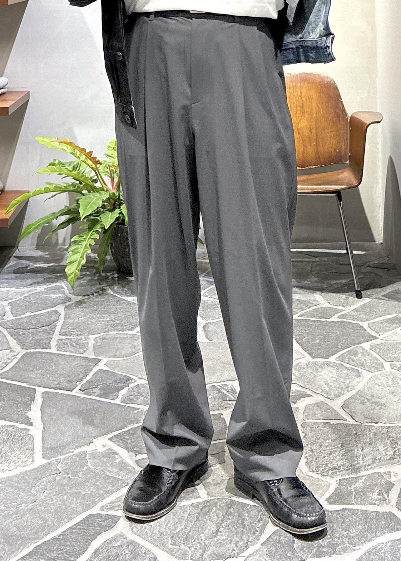 太もも周りはタックが入っていて余裕があり、テーパードがかかった綺麗なシルエットで、セットアップでの着用以外でも単品でもかなり汎用性の高いパンツです。