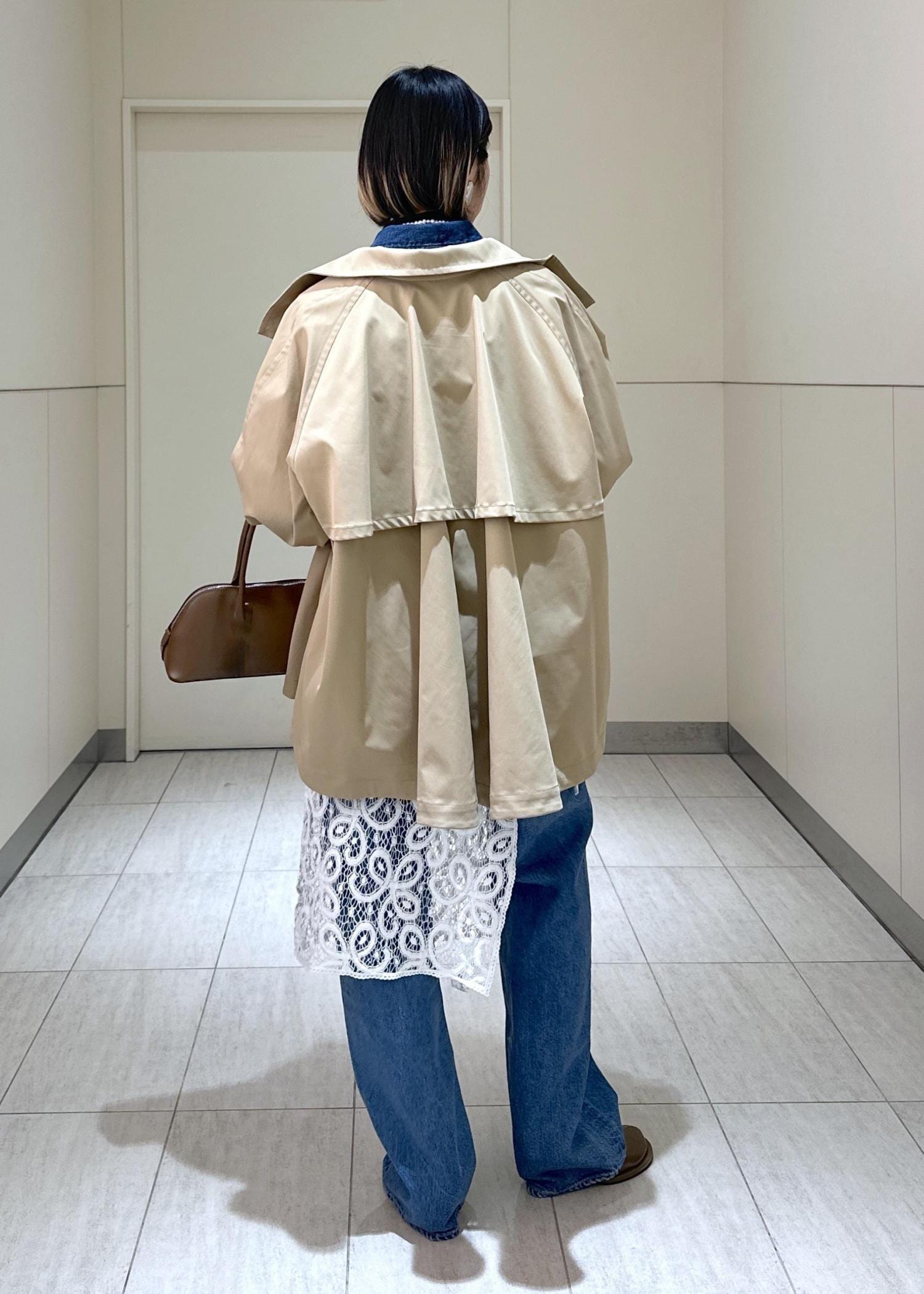 ADAM ET ROPÉ FEMMEフレアーミドルトレンチコートベージュ / F¥33,000レビューアームがゆったりとしていて、中に着込んだりしてその日の気温に合わせて調節出来る仕様。ミドル丈なので脱ぎ着してもかさばらず、座ってもシワにならないちょうどいい着丈です◎