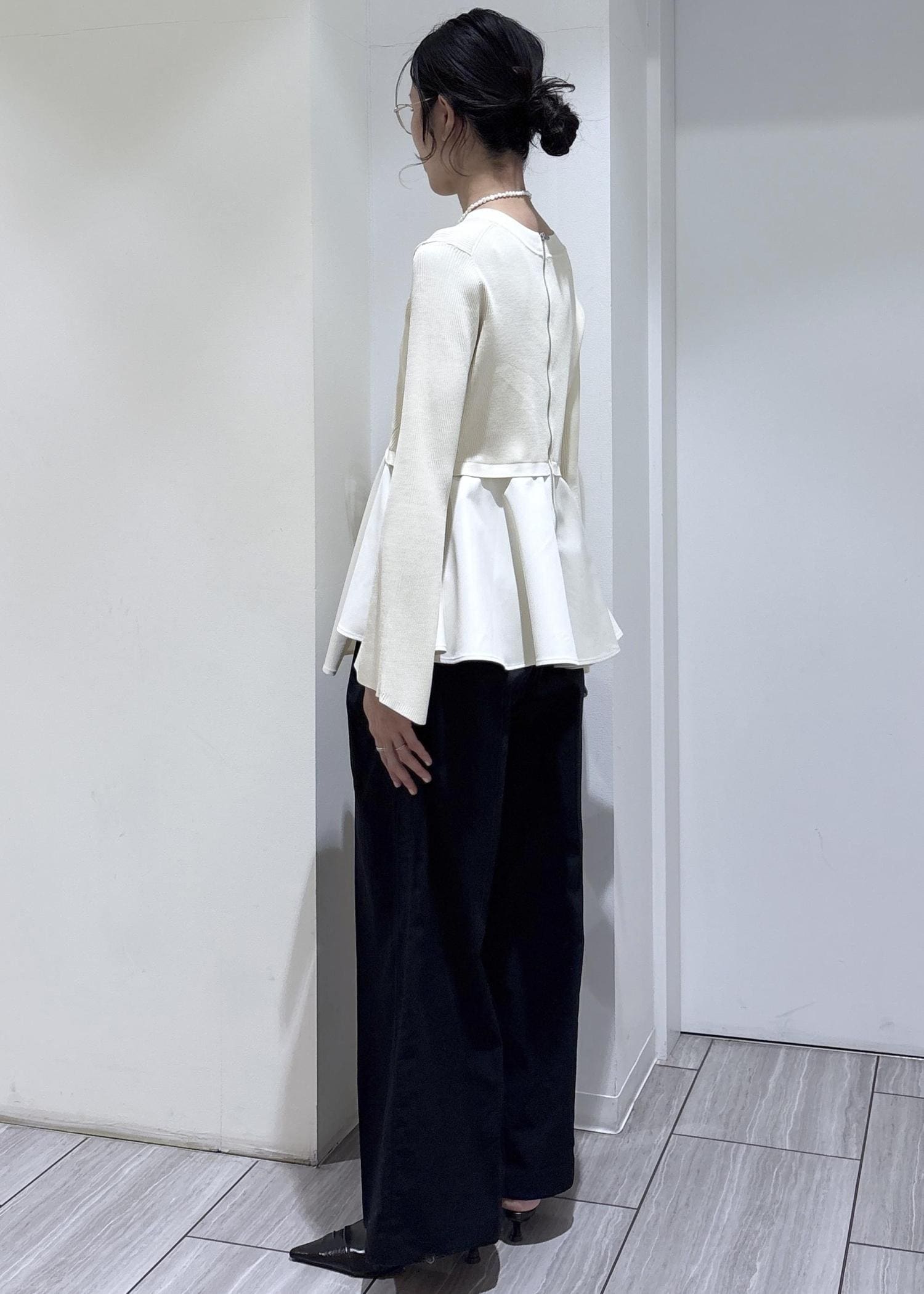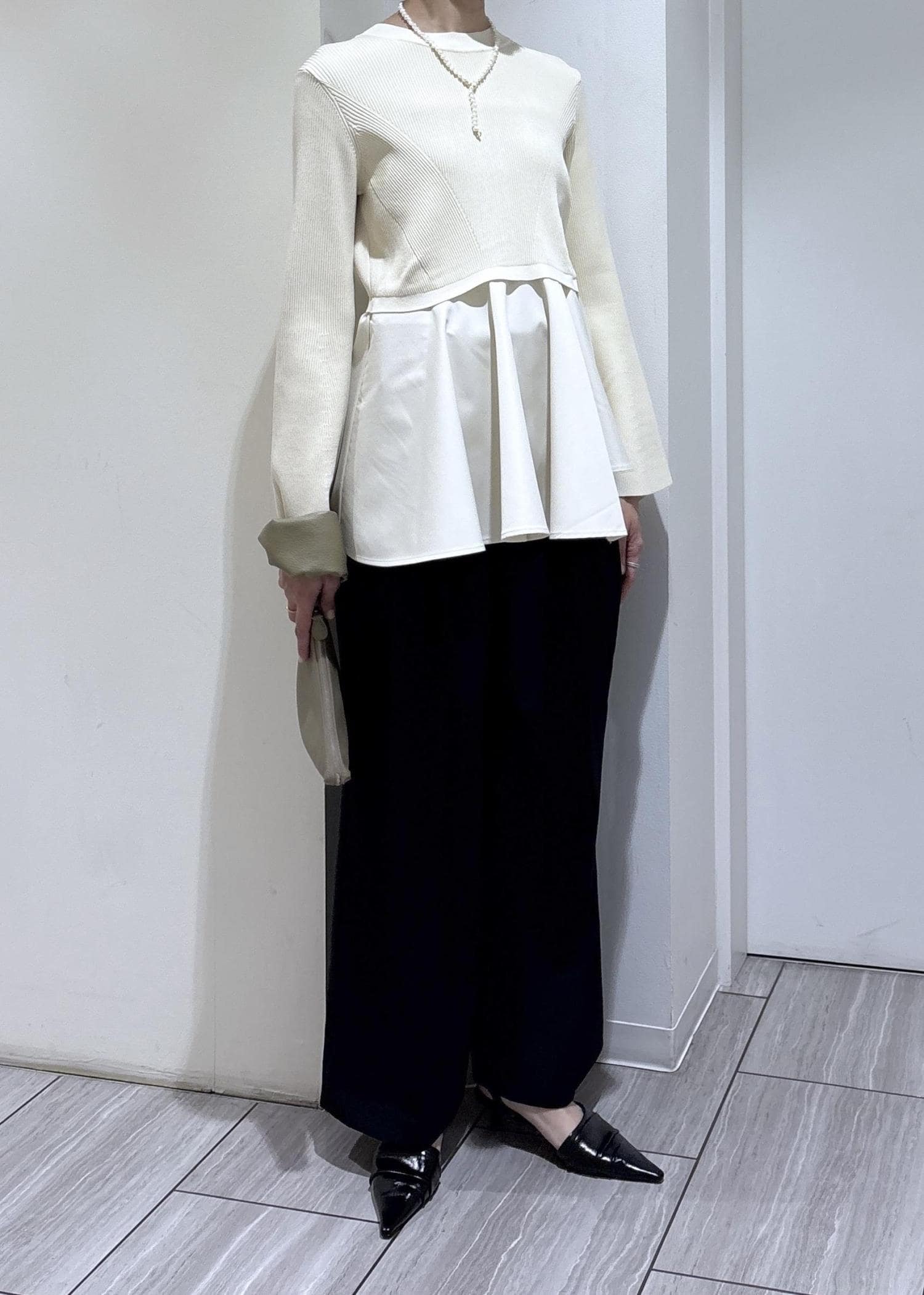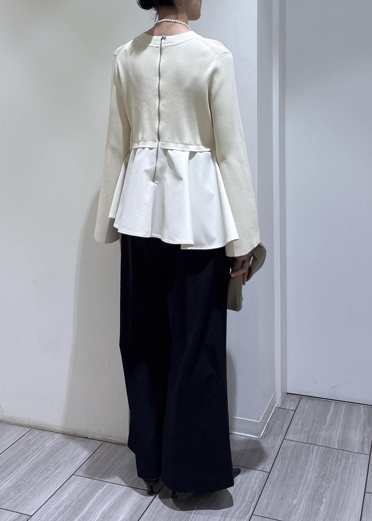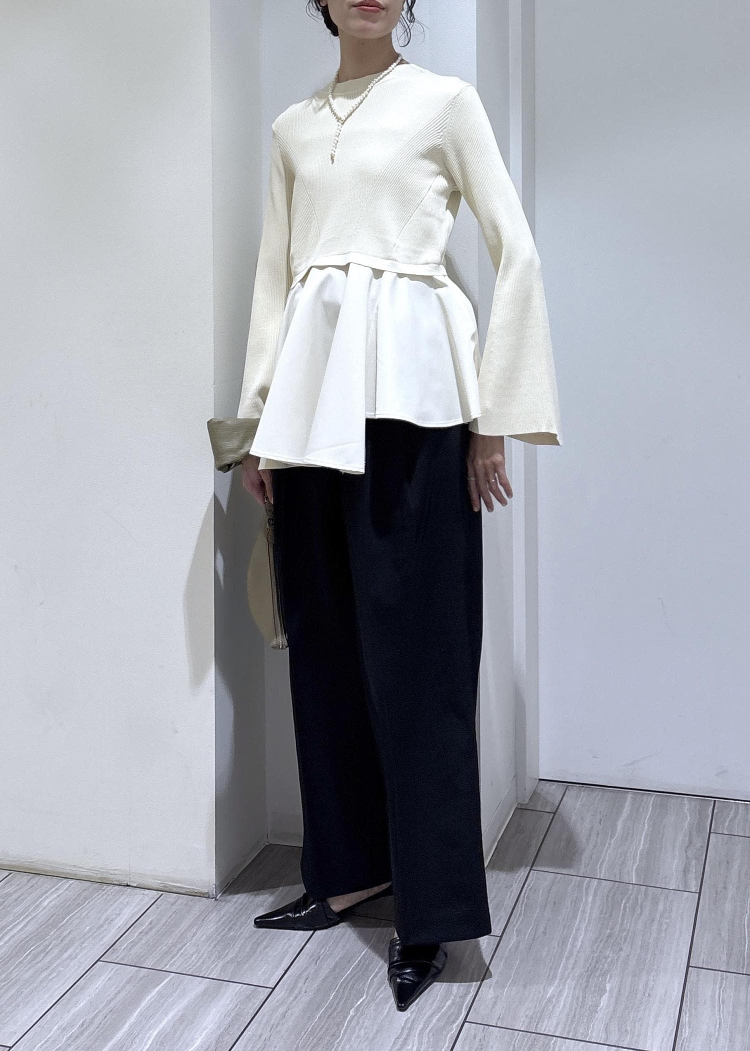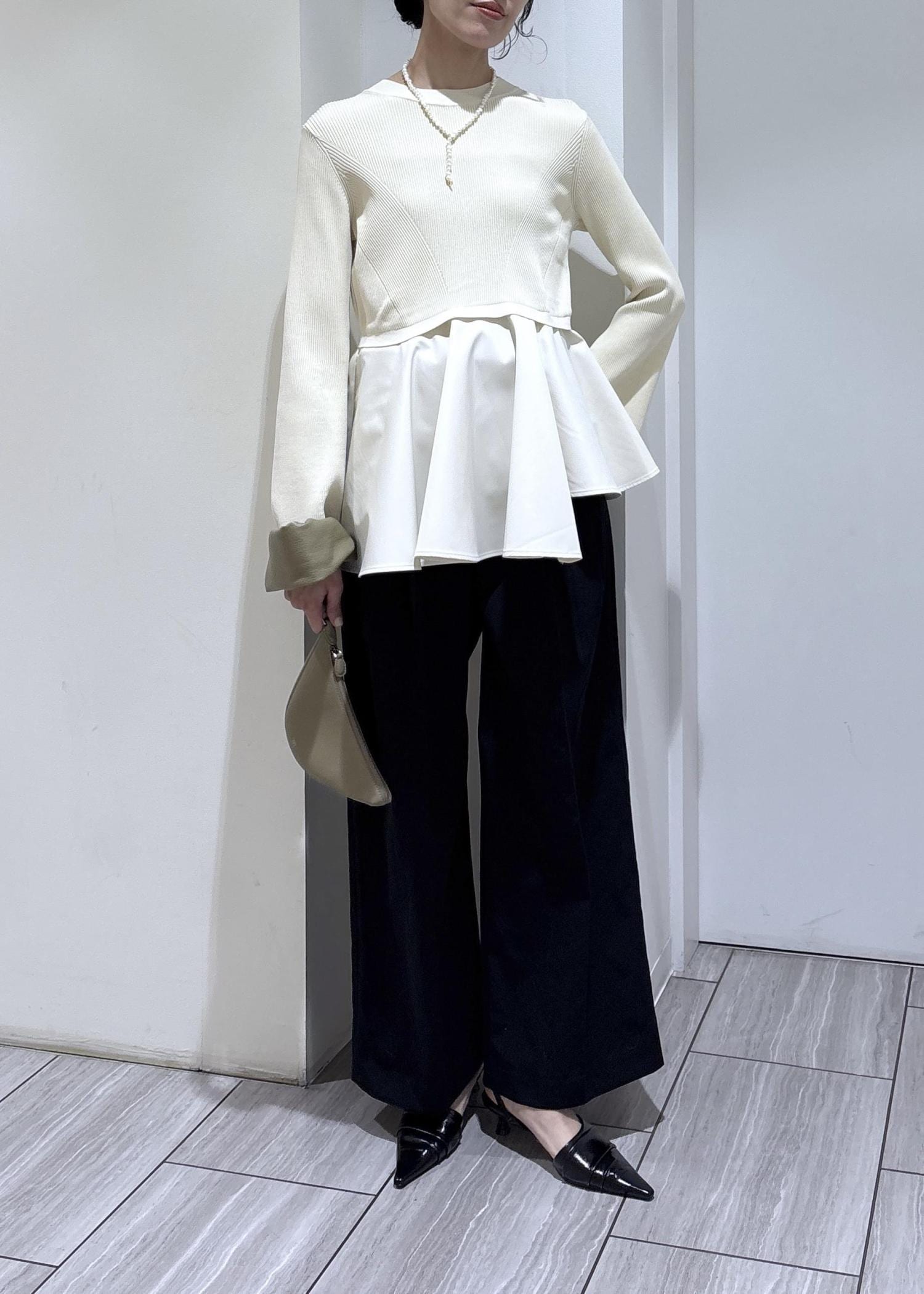 本日はペプラムニットとワイドパンツの綺麗めスタイリングのご紹介です。