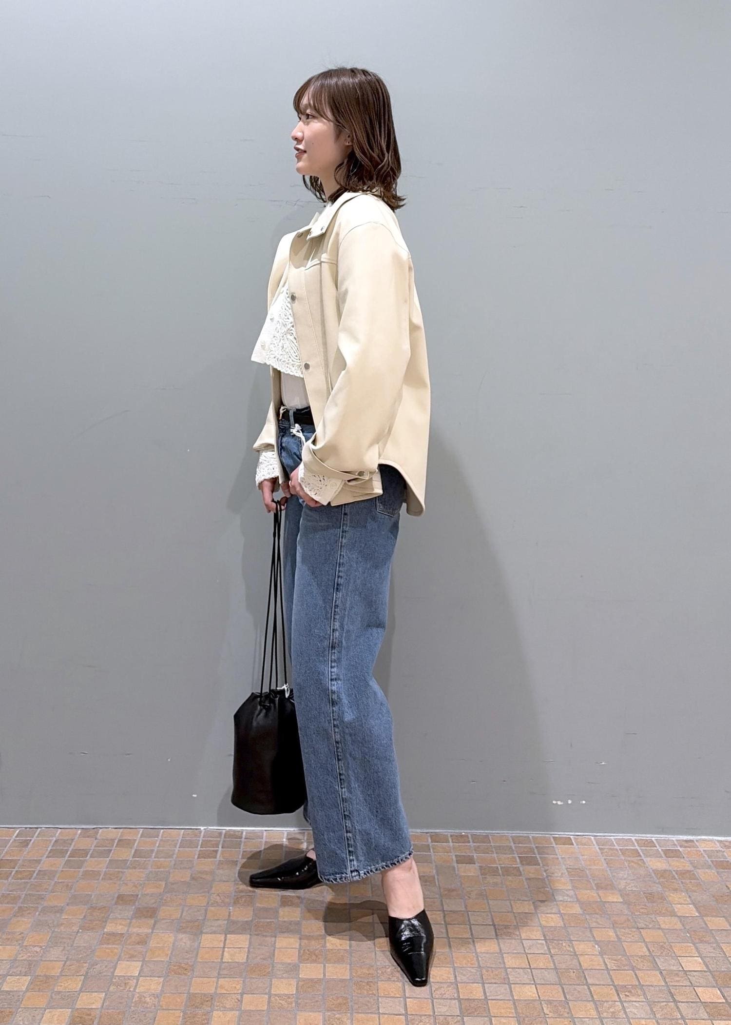 デニムに柔らかみのあるキナリのジャケットとホワイトのシャツを合わせることで明るいイメージになり、春らしさを感じられます♡