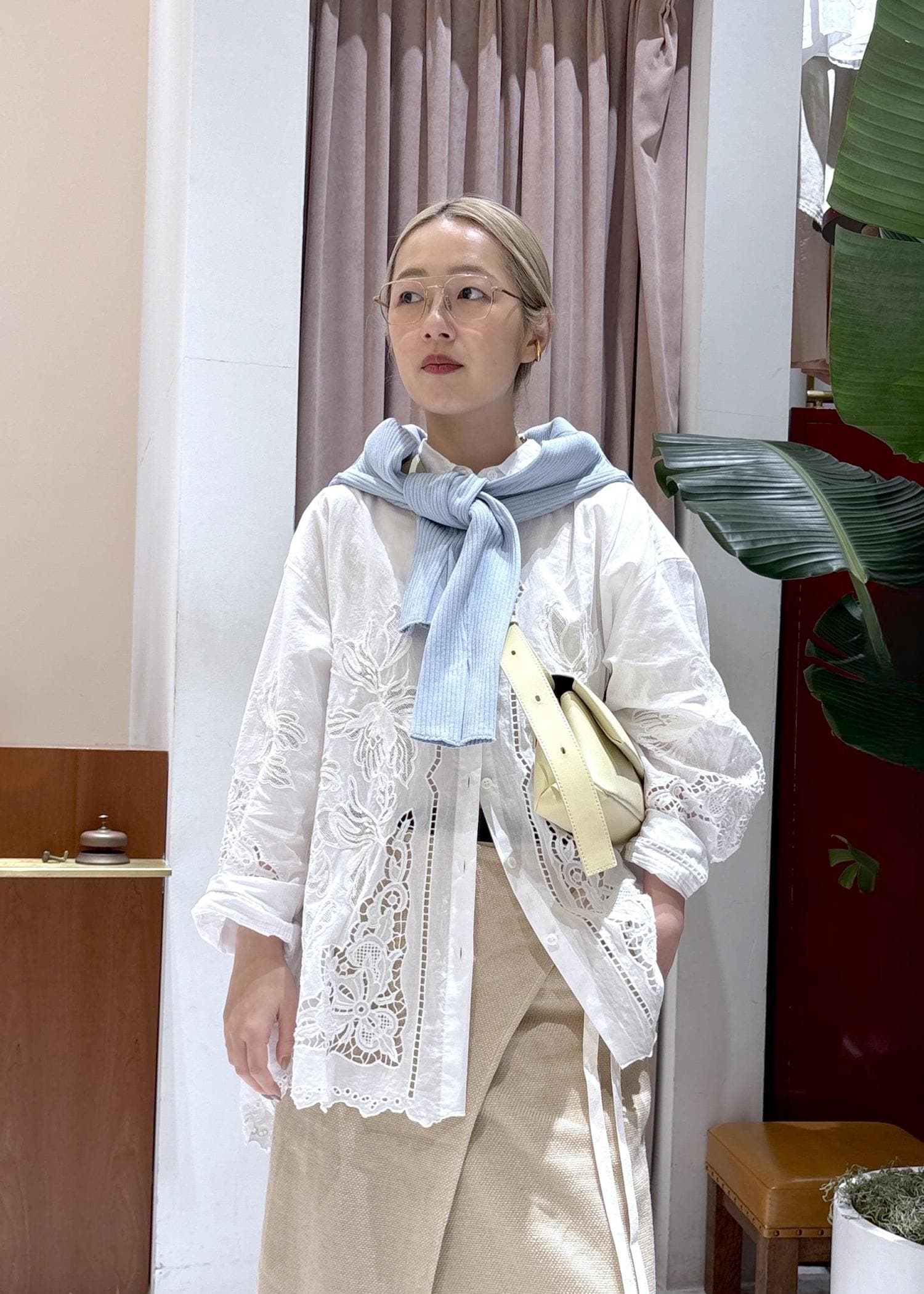 レースのブラウスに、淡いブルーの差し色をプラス。