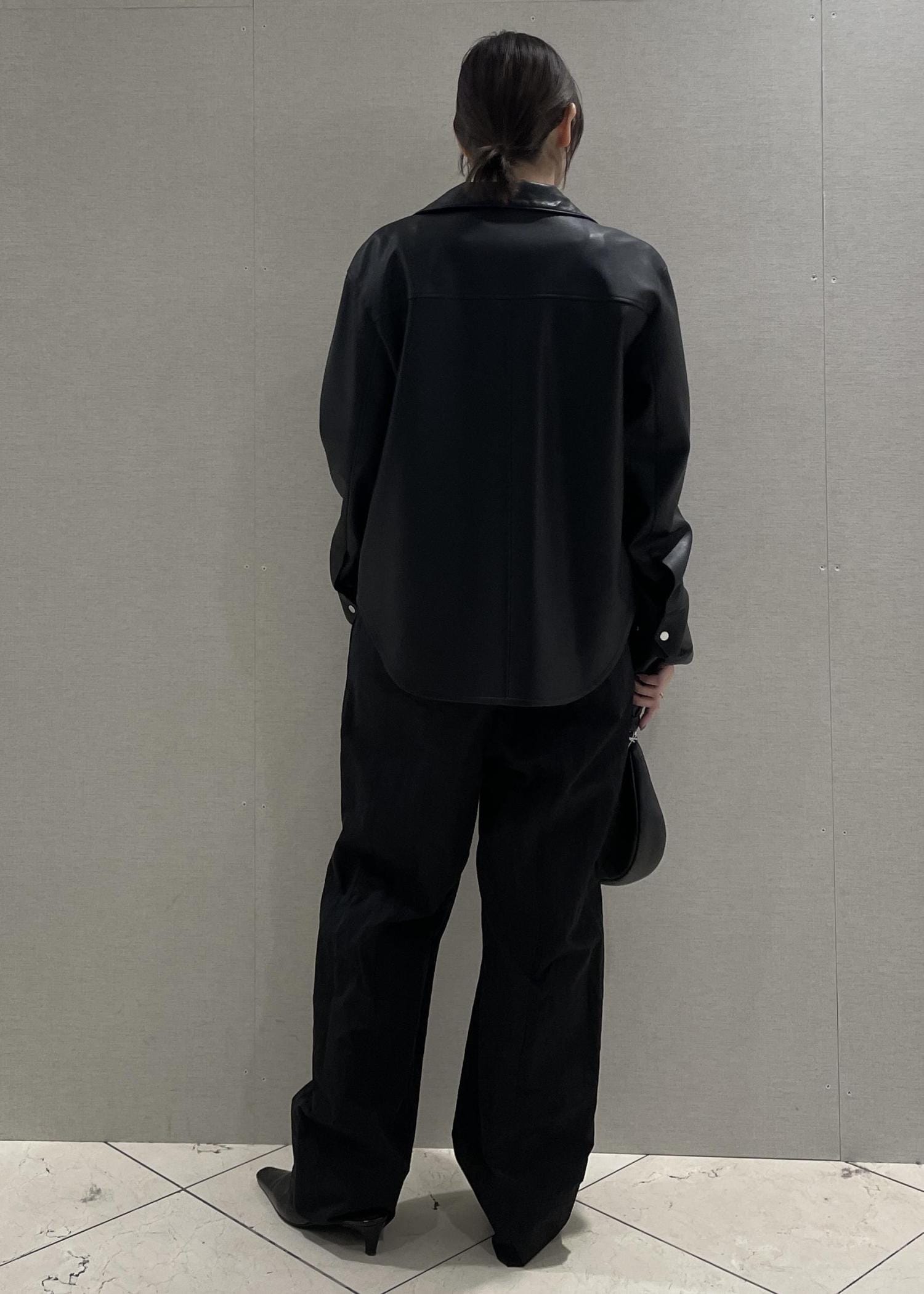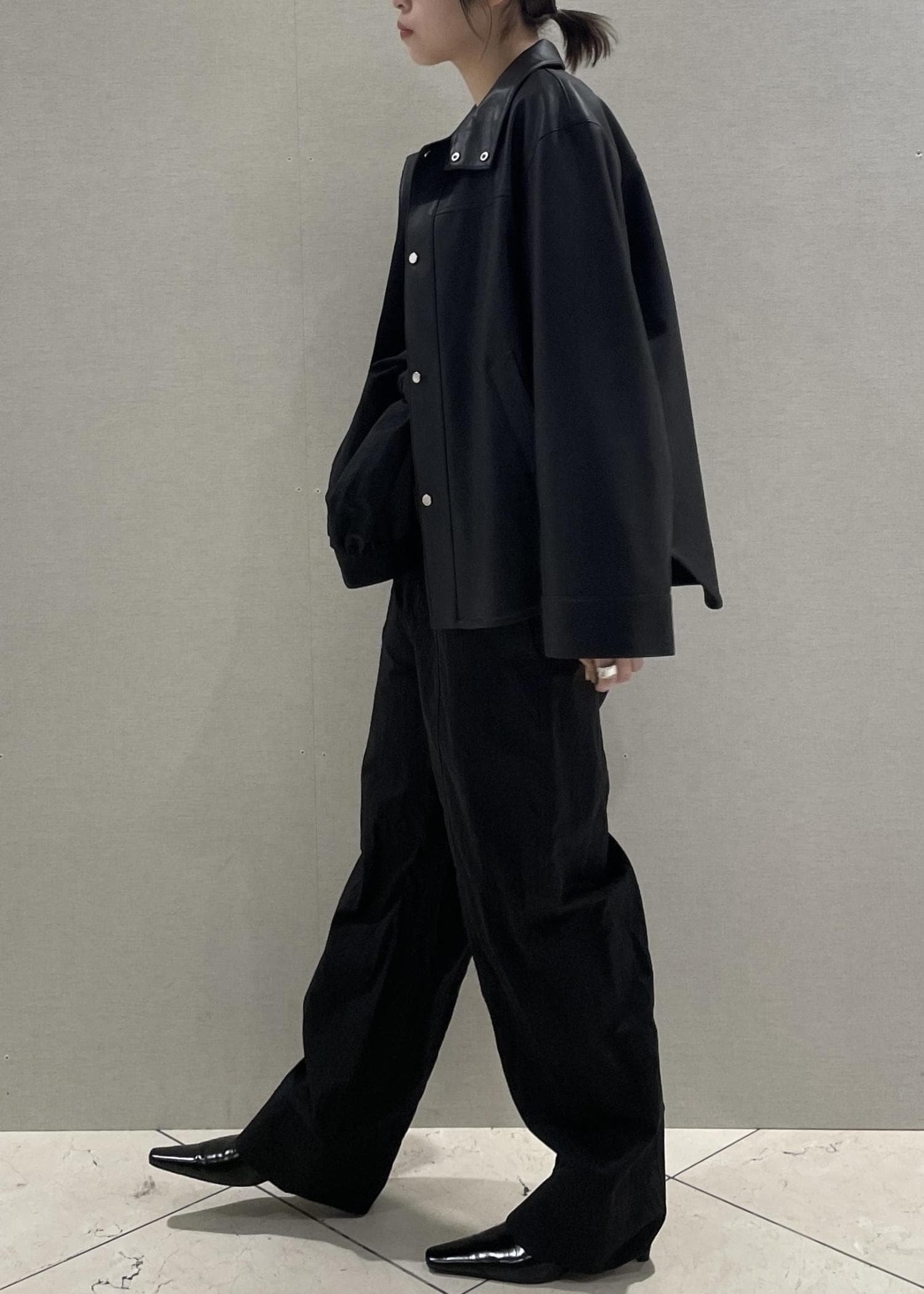 本日はシンセティックレザースタンドブルゾンと、ロンパースを使ってブラックコーデを組んでみました!