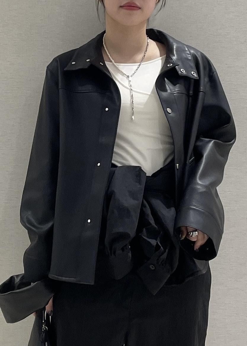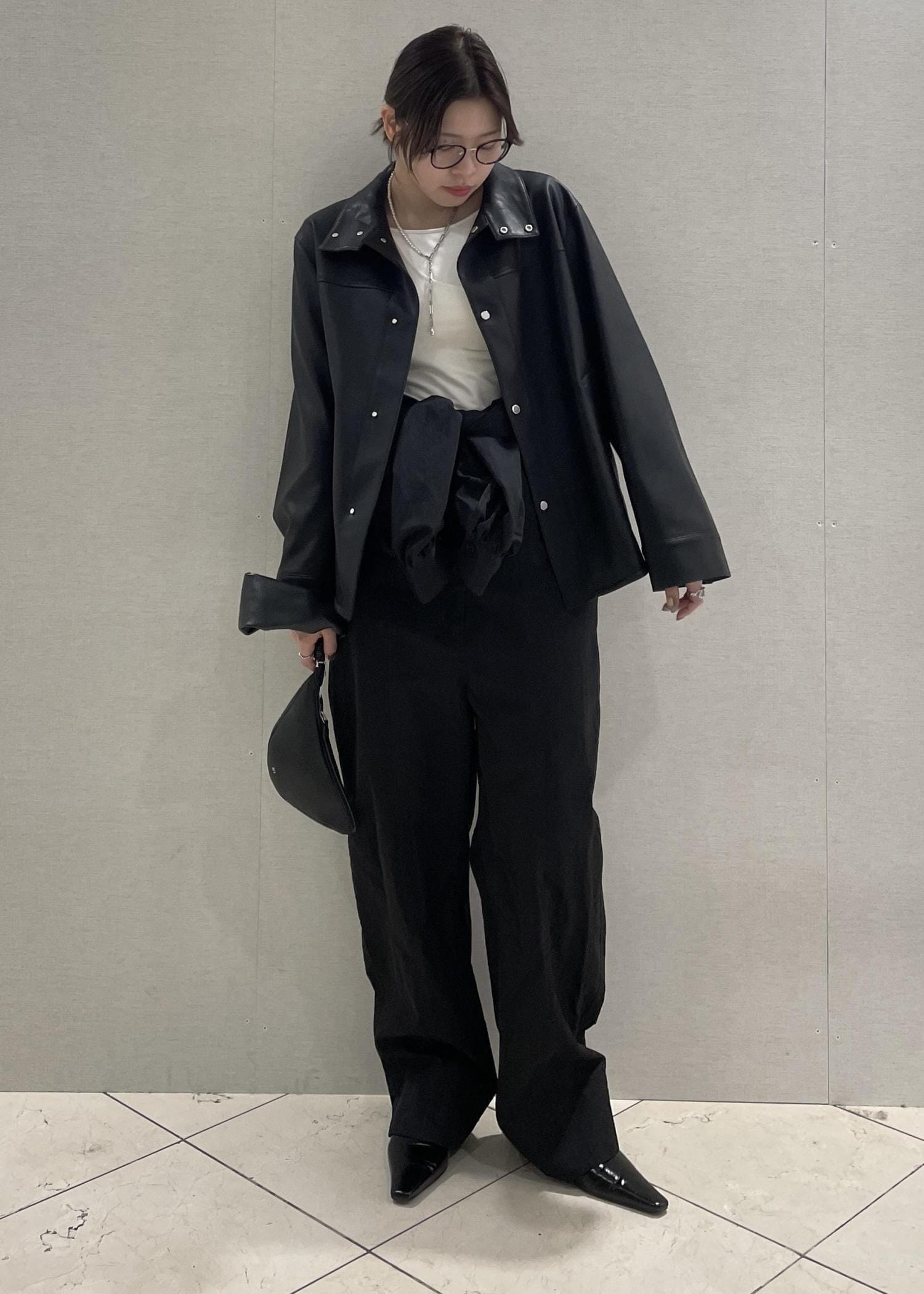 レザー調のお洋服を使ったブラックコーデは重くなりやすいので、インナーには首元の空いた真っ白なトップスをチョイス!
