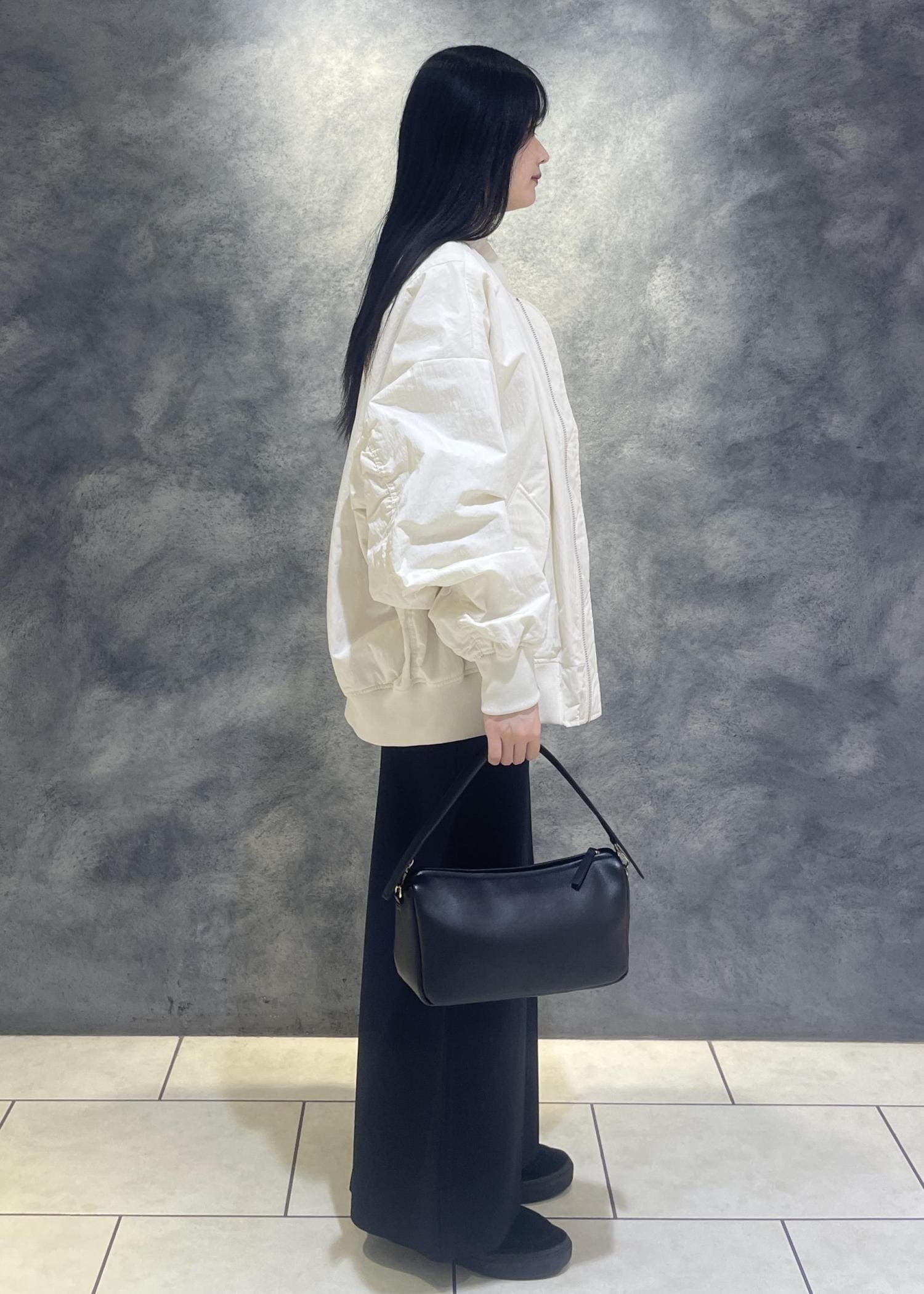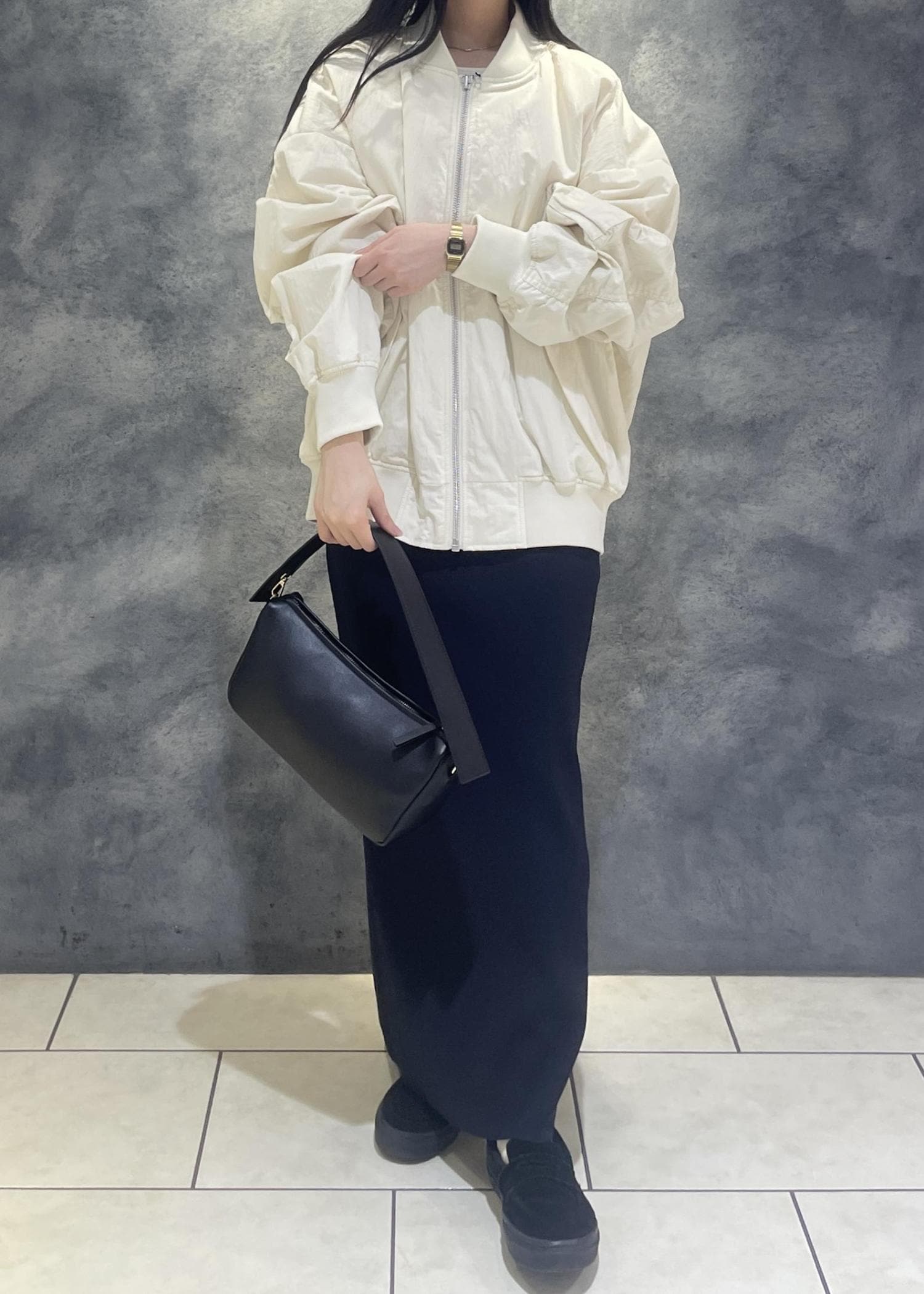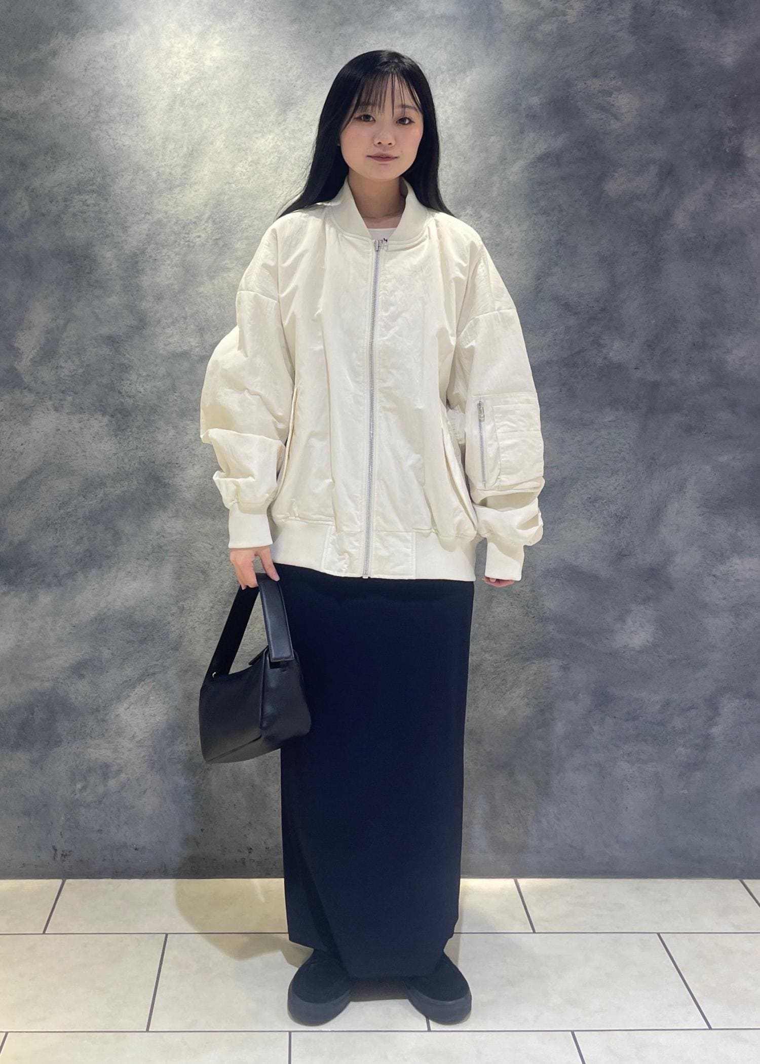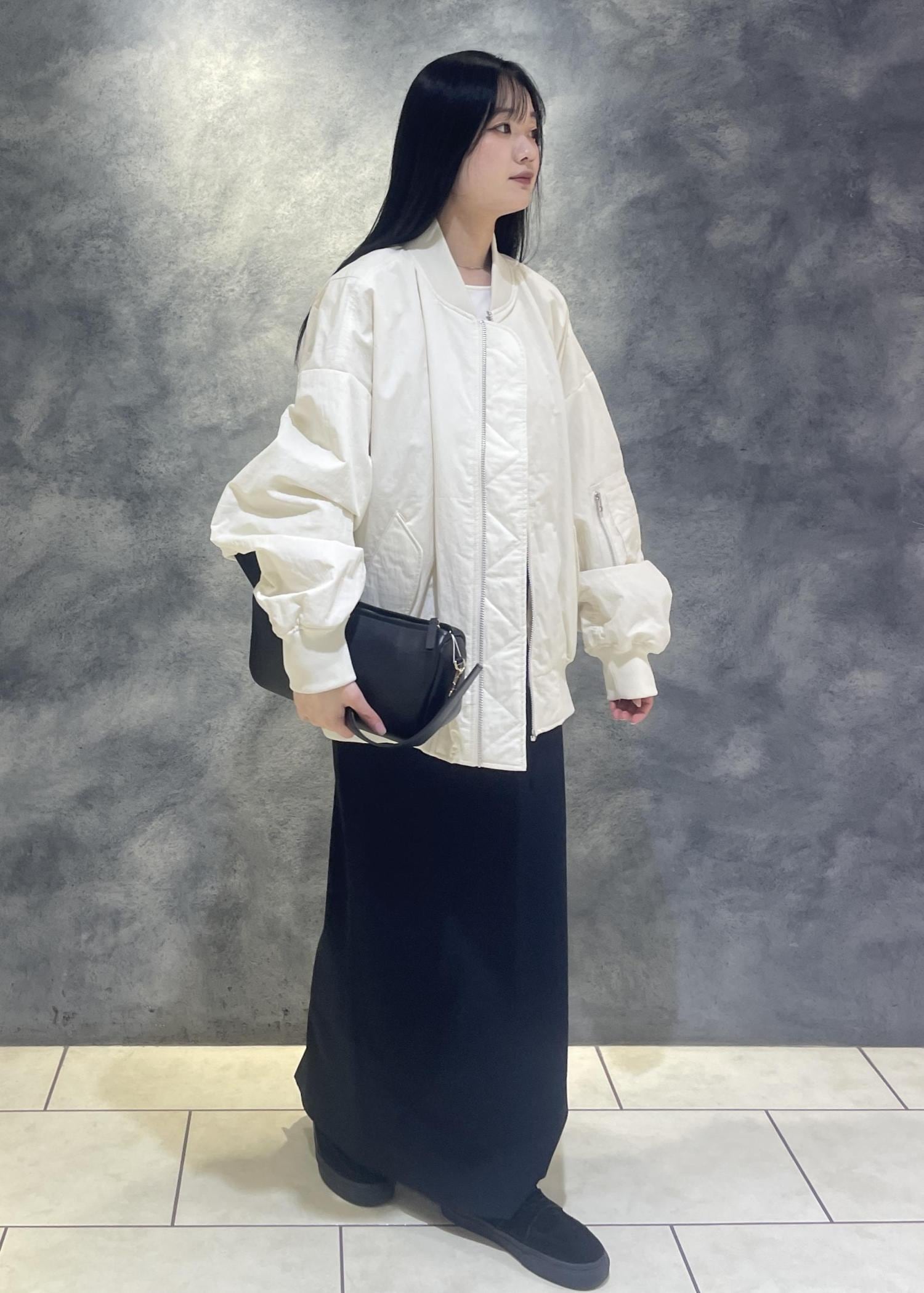ボリューミーなシルエットなので、ストンと落ち感のあるスカートやスラックスと合わせたり、セミワイドなデニムと合わせても素敵です˚✧₊
