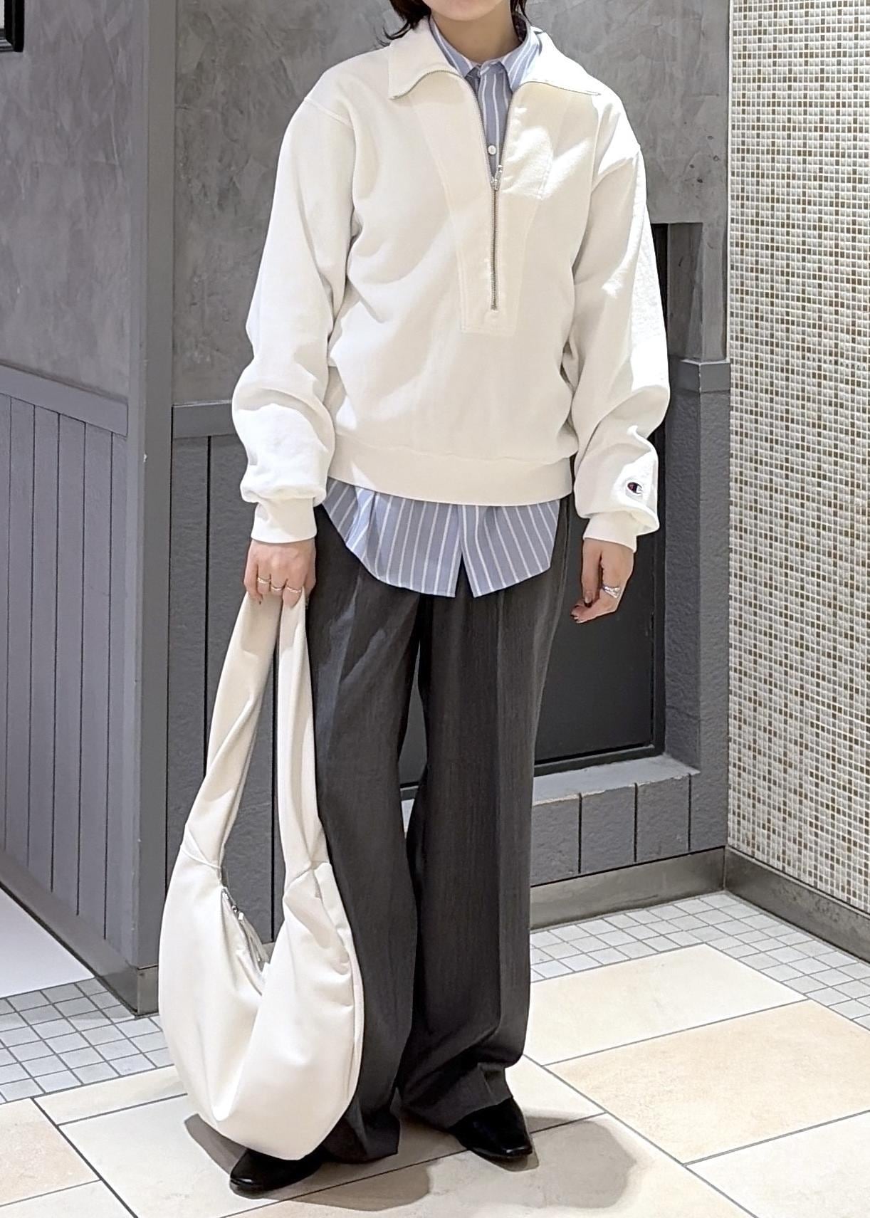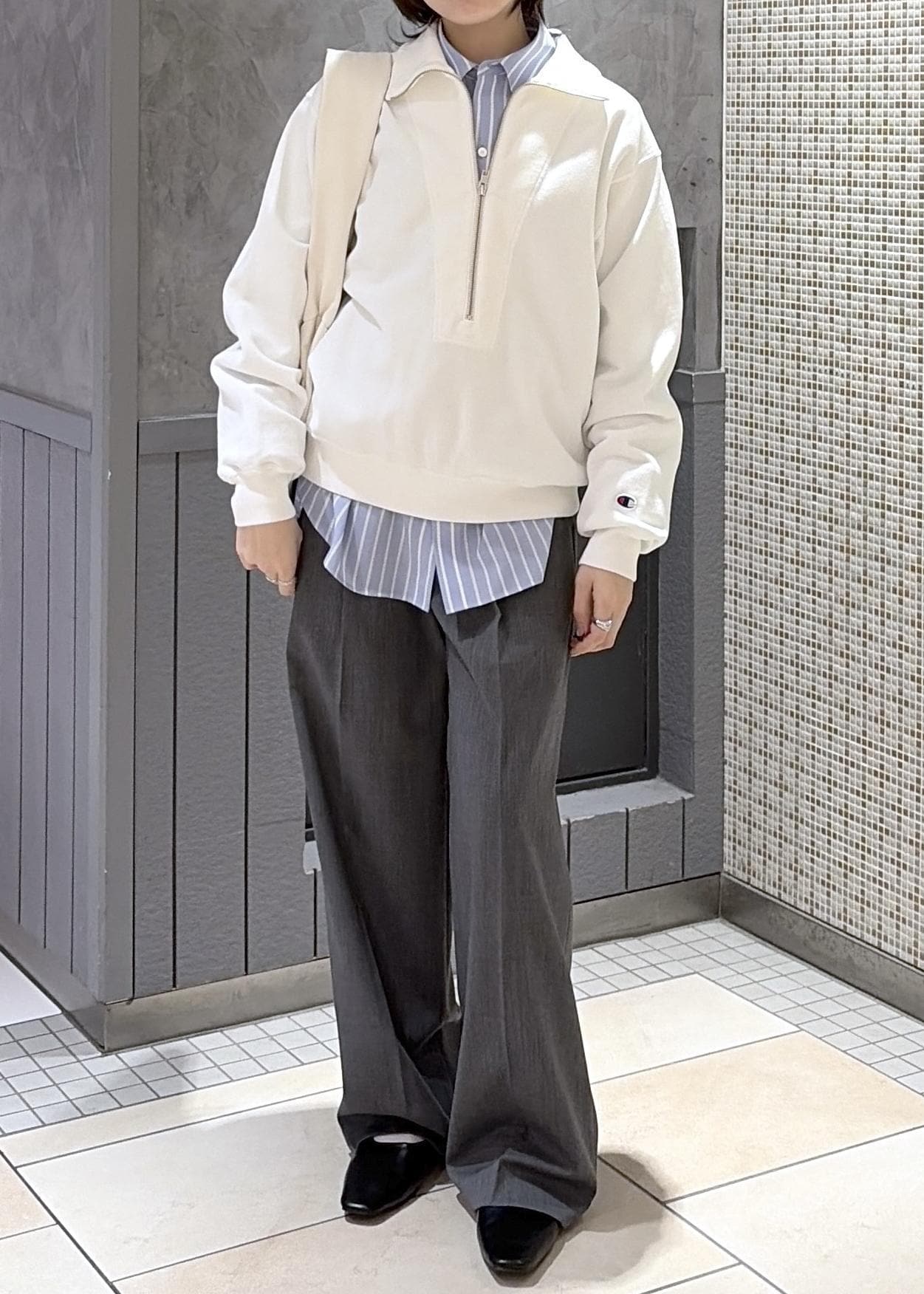 今回は【Champion for ADAM ET ROPE'】別注 SWEAT HALF ZIPを着用してみました。ジップが深いのでレイヤードも楽しめます◎
