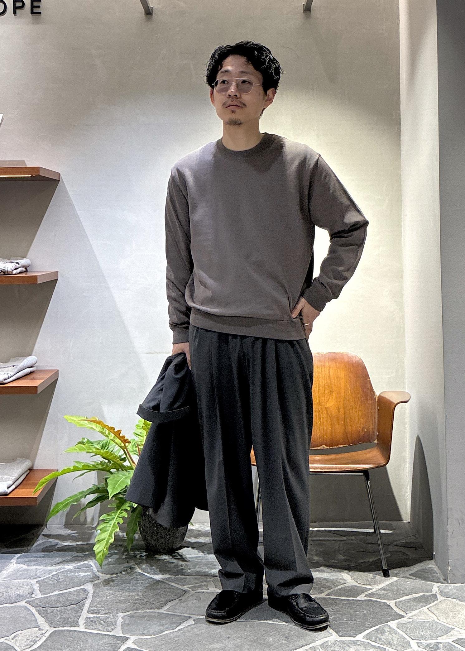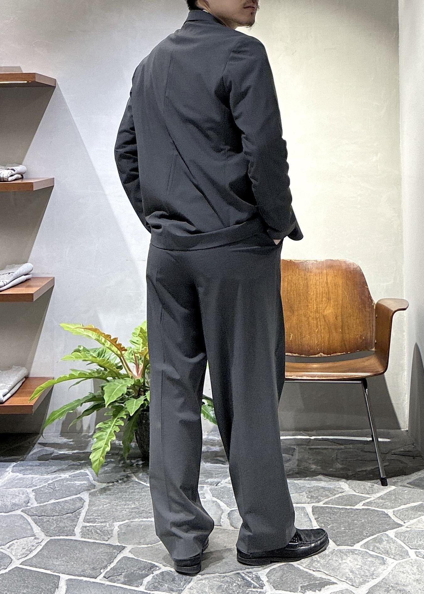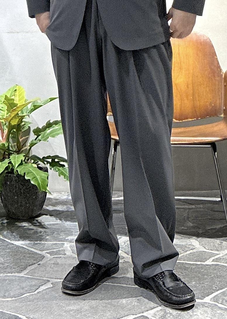 太もも周りはタックが入っていて余裕があり、テーパードがかかった綺麗なシルエットで、セットアップでの着用以外でも単品でもかなり汎用性の高いパンツです。 -