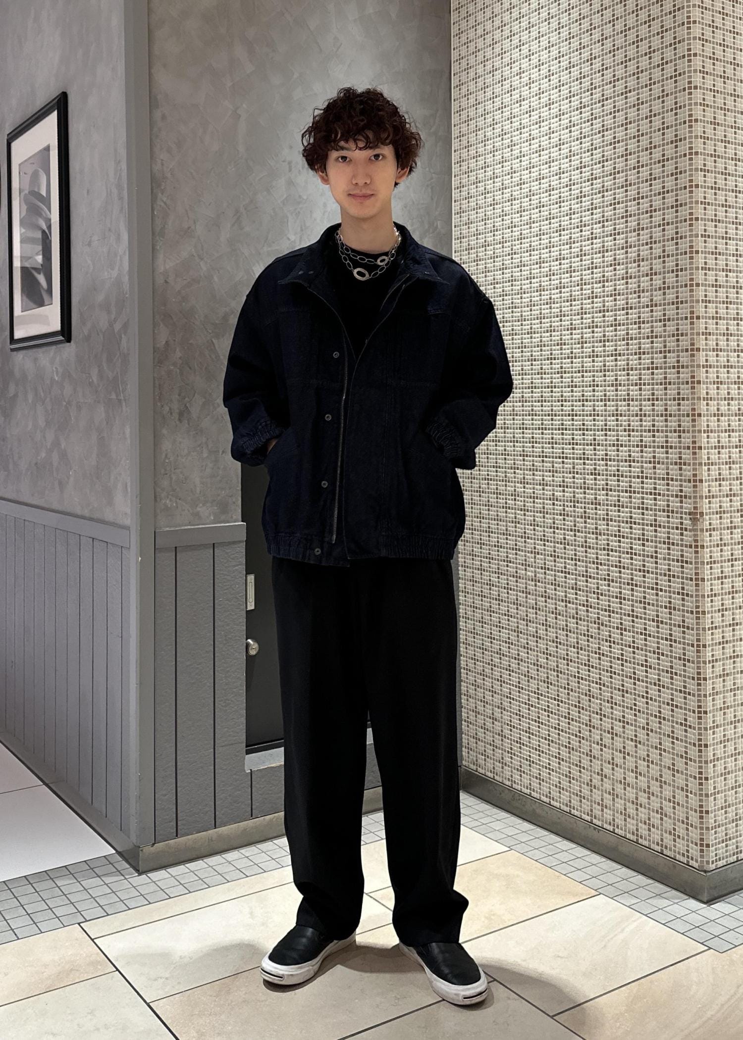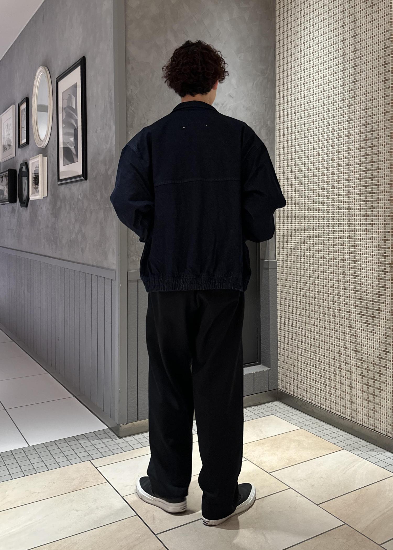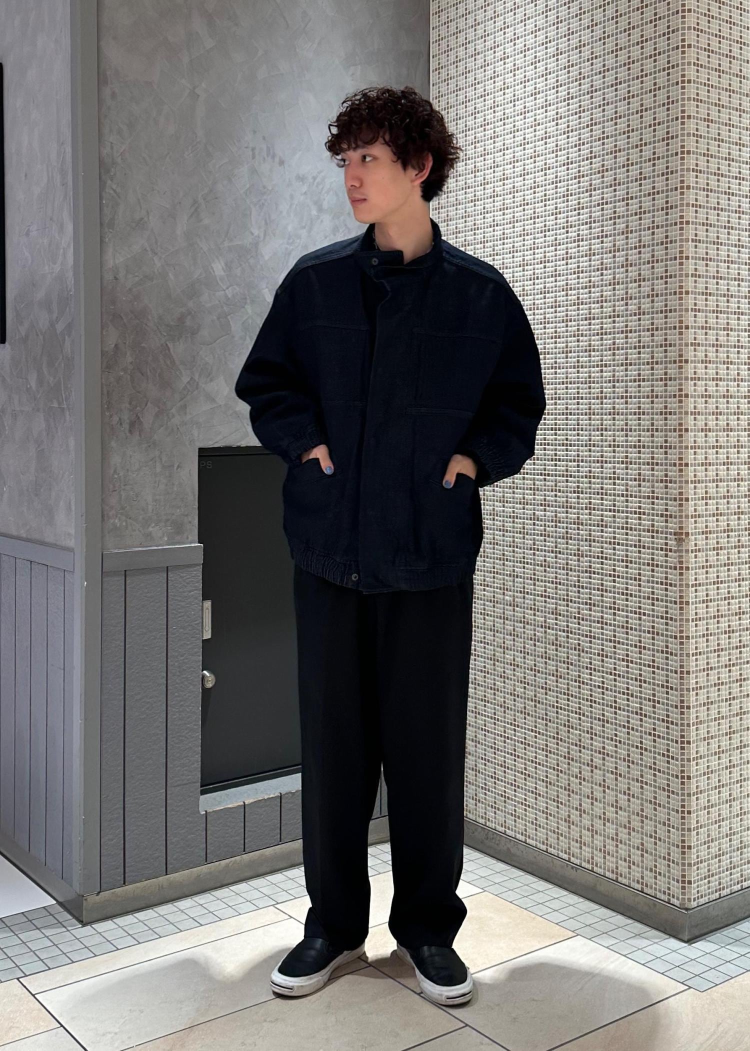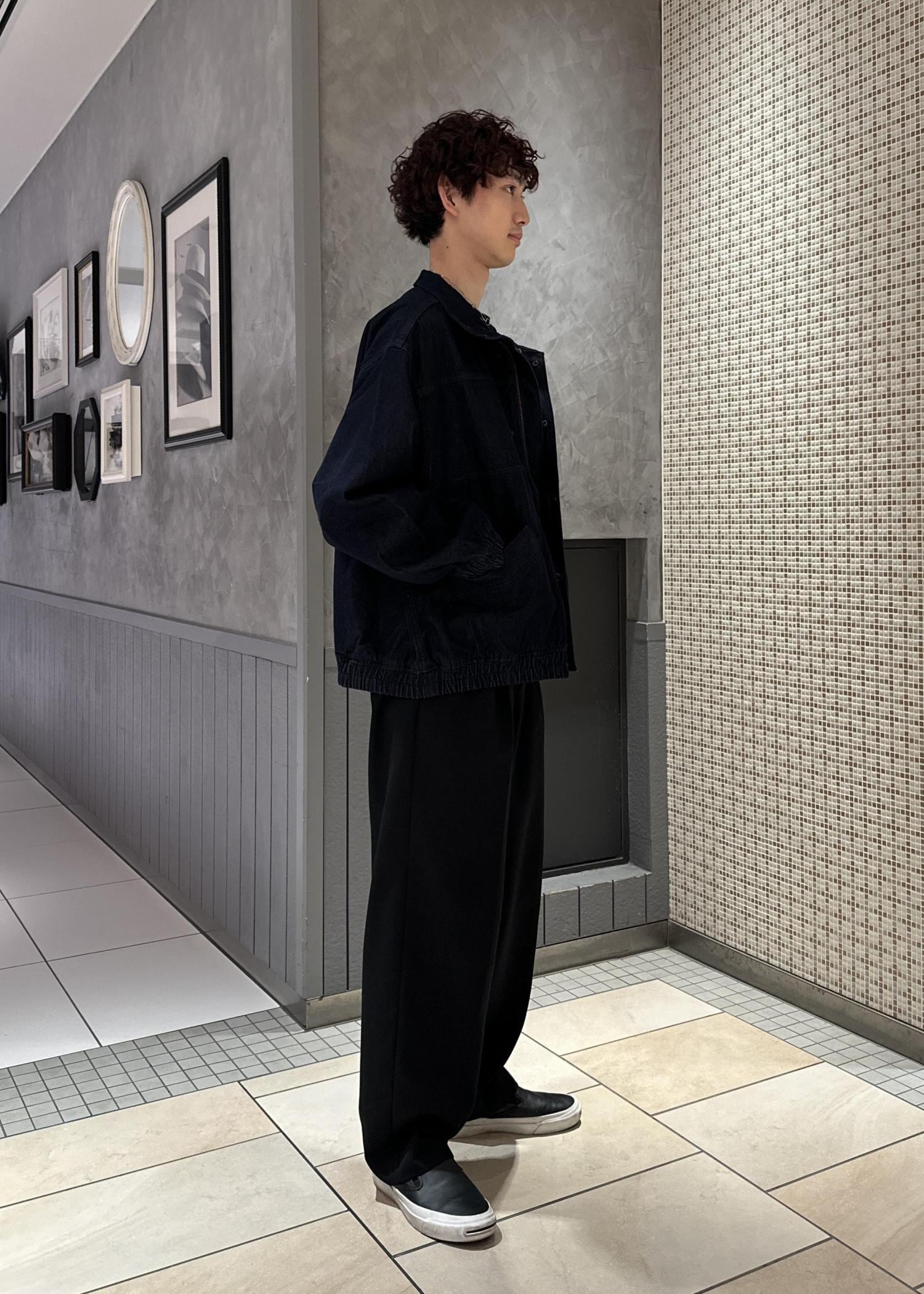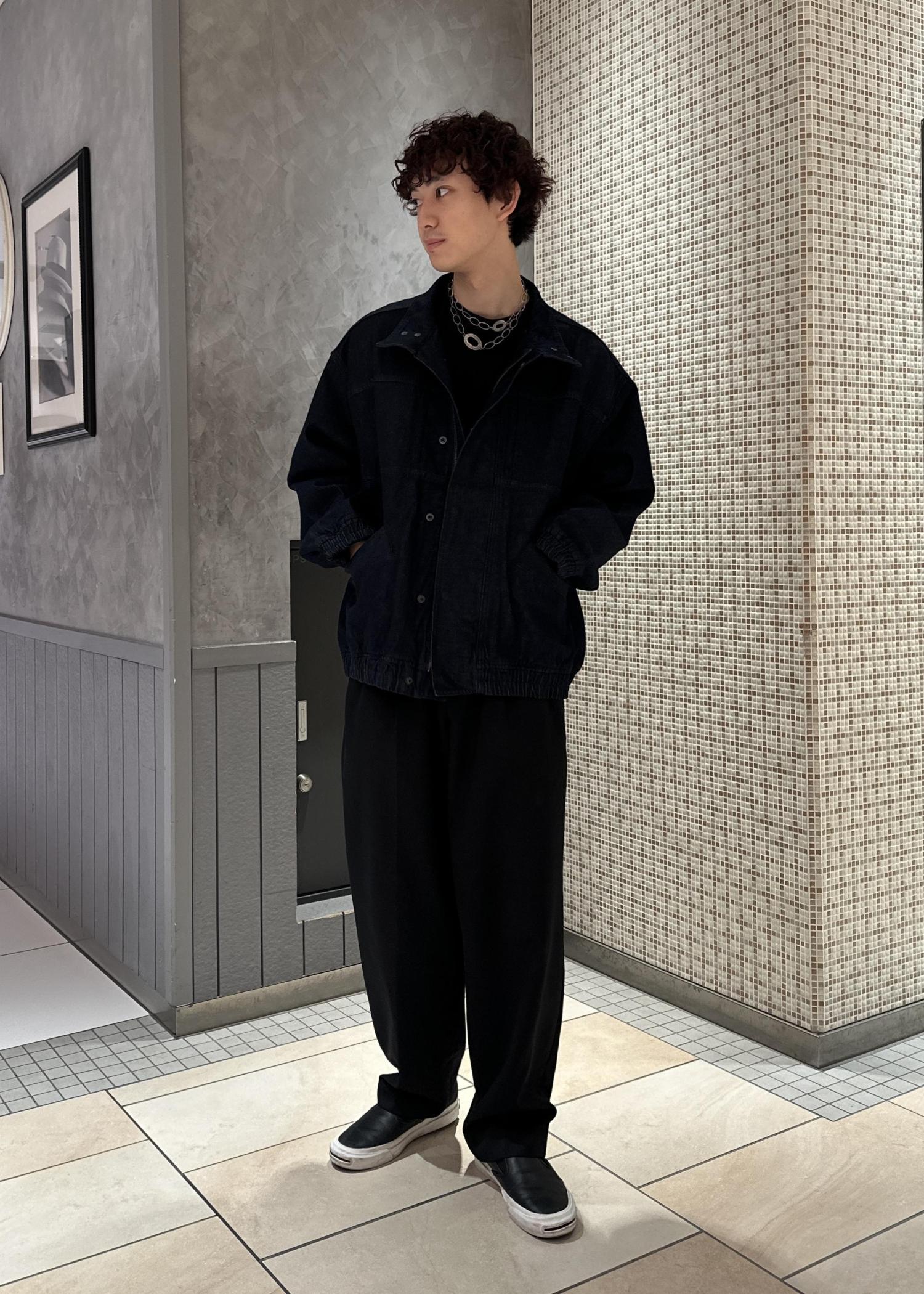 ブラックデニムのボマージャケットに黒スラックスを合わせたシンプルなオールブラックコーデです。デニム自体、柔らかくて整ったシルエットなので、キレイめなコーデにも相性良いのでスラックスと合わせてみました。デニムの風合いに合わせてトロトロ感のない、ウール混のスラックスを合わせました。