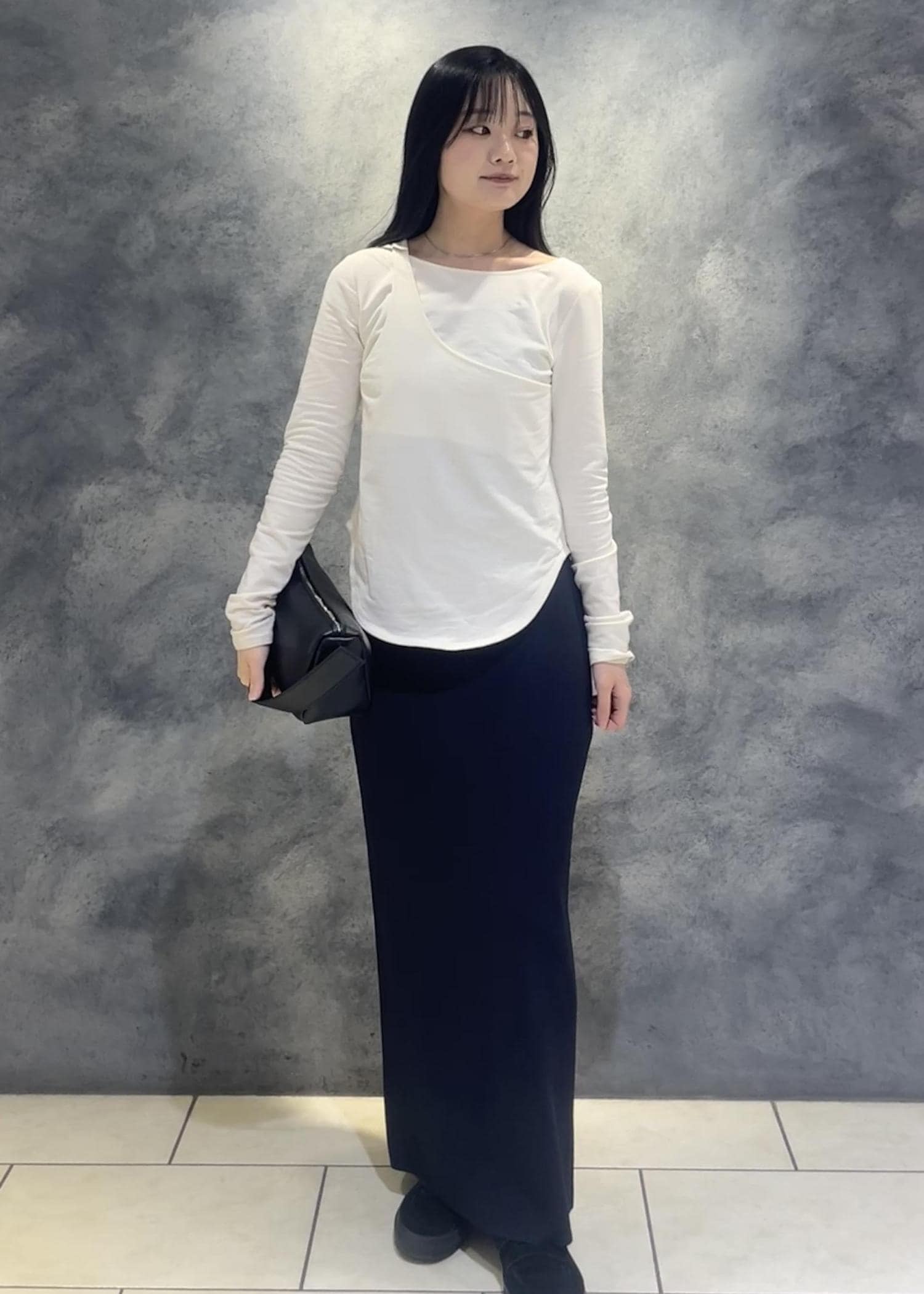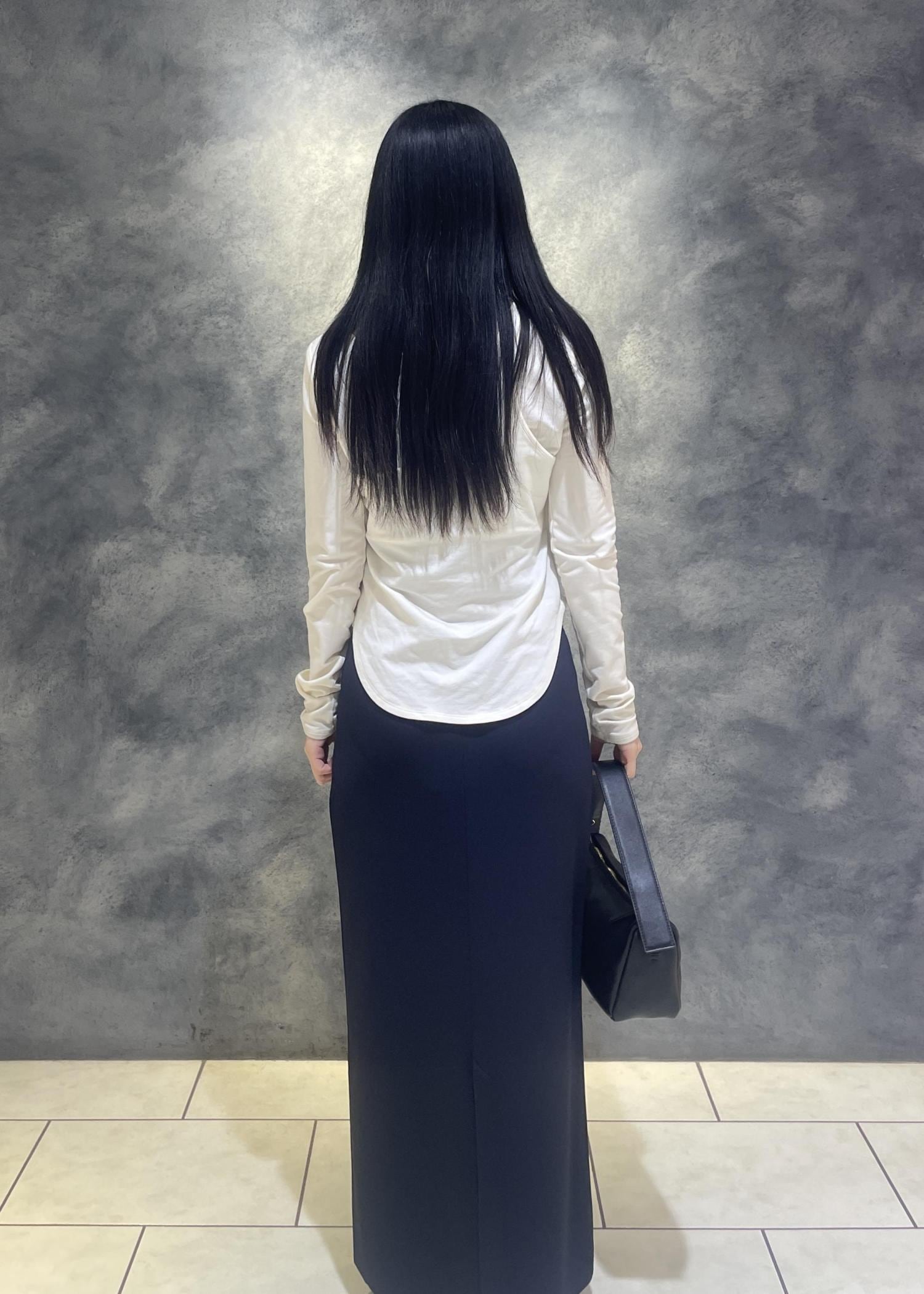 ネイビーのタイトスカートと合わせて全体的にストンとさせ、ヘルシーな雰囲気にしてみました˚✧₊