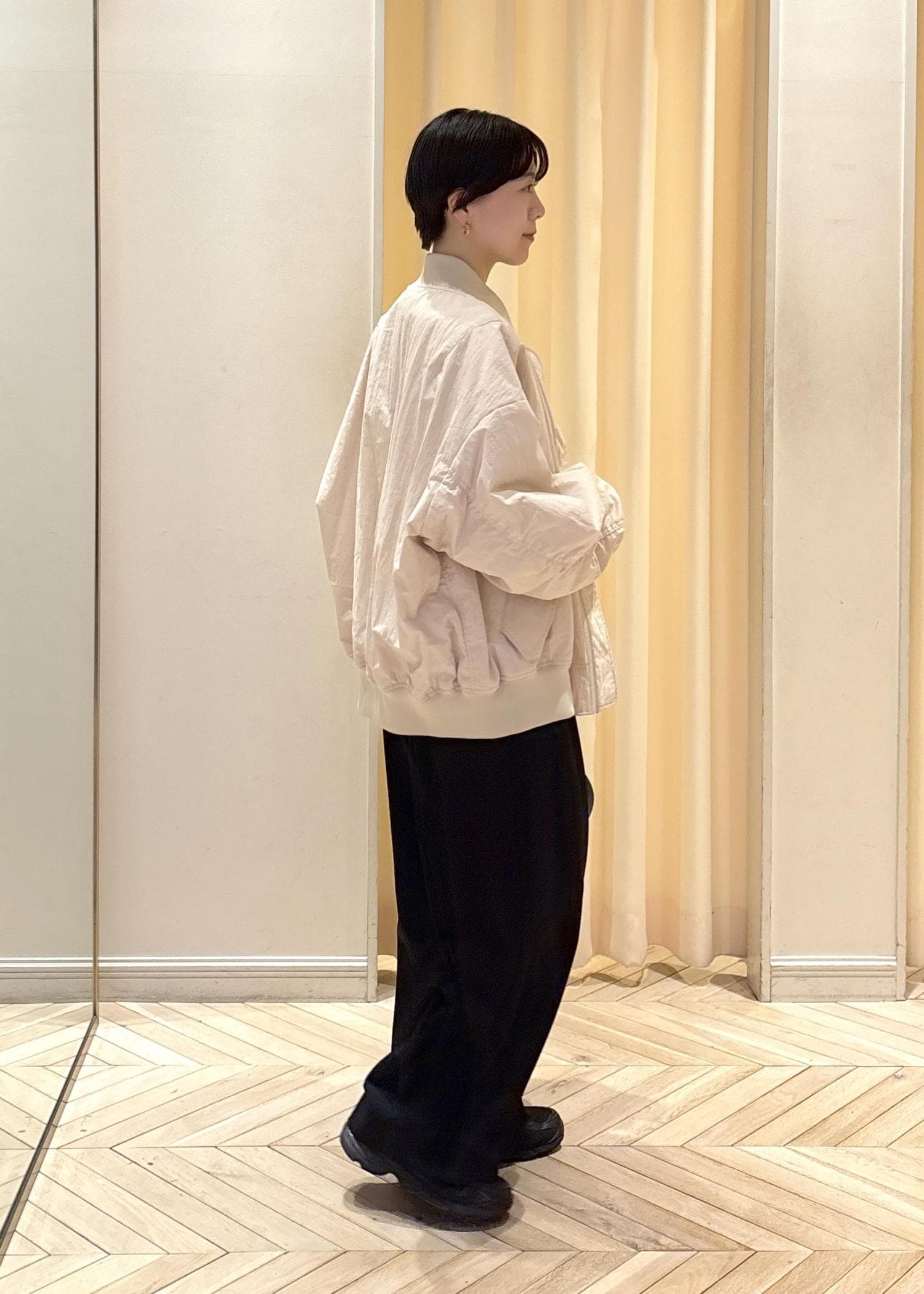 ゆったりめなので中に着込めるのと、生地がマットな質感なのでカジュアル過ぎずに1枚でおしゃれ見えします♡ -