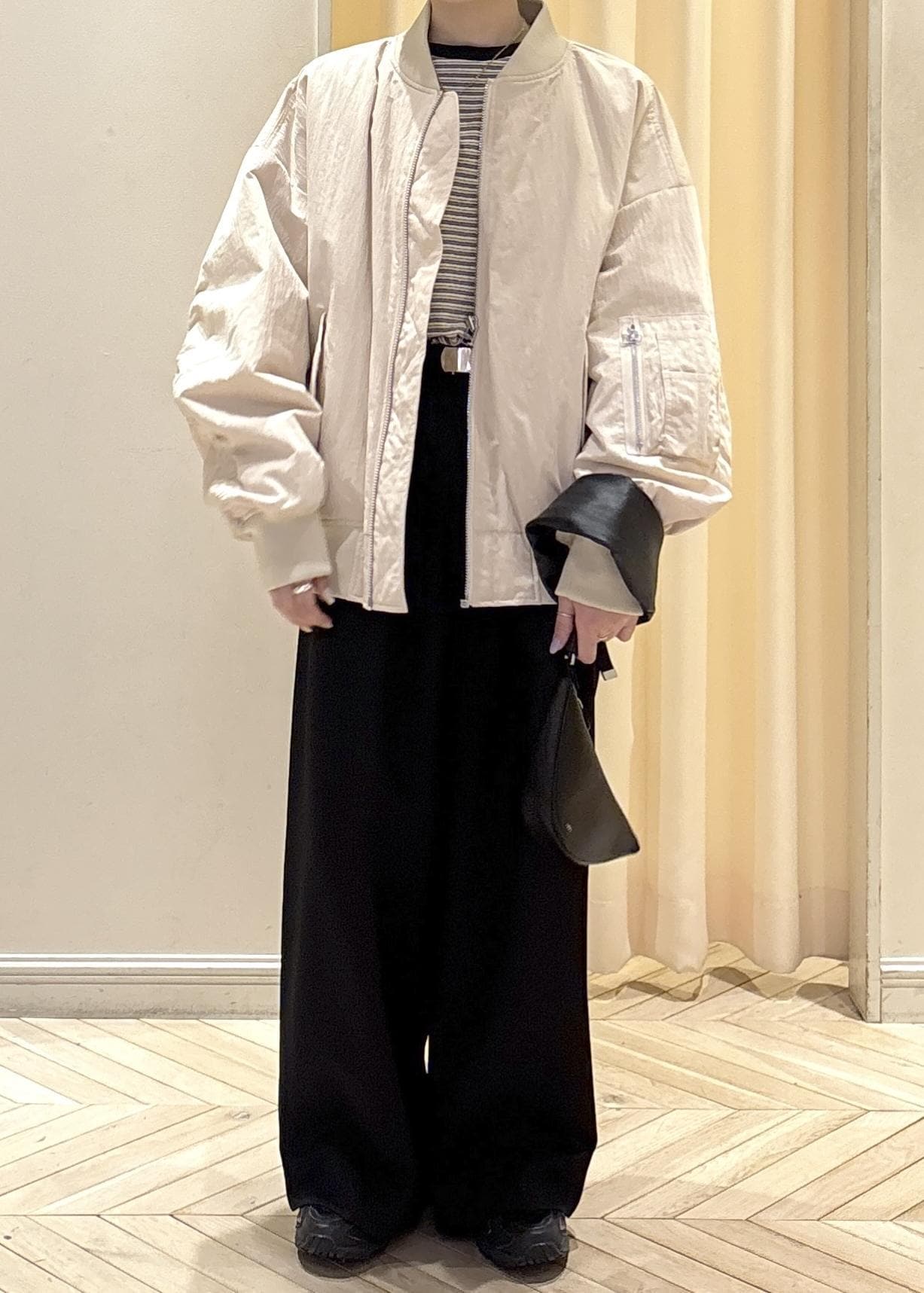 私はカジュアルなスタイリングが好きなので、ボーダーにスニーカー、ガチャベルトのスラックス合わせでボーイッシュにスタイリングしてみました!
