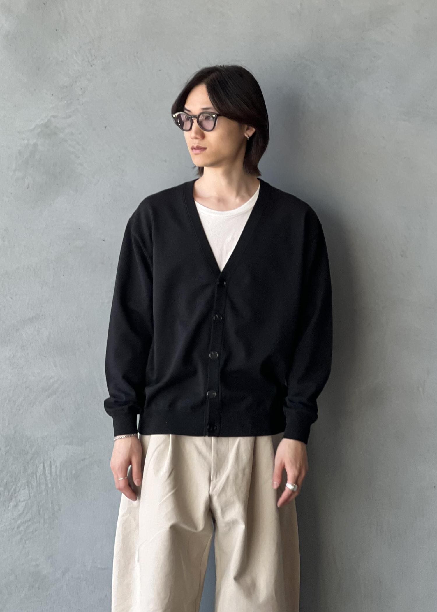 ADAM ET ROPÉ HOMME強撚プレーティングニットカーディガンブラック / M¥14,300レビューゆとりはありますが着丈は長くなく比較的すっきりとした印象のサイズ感です。ハイゲージでやや薄手です。