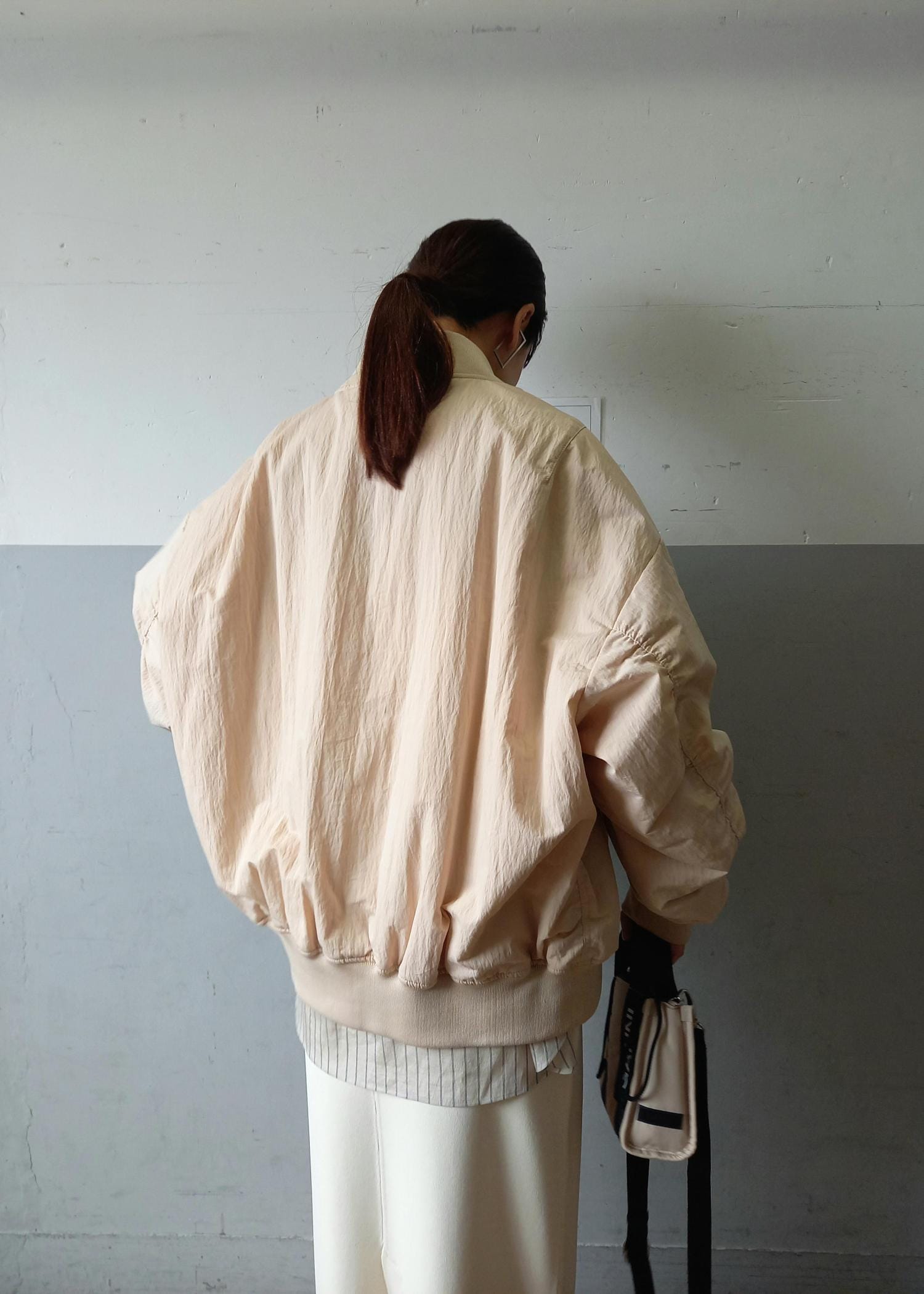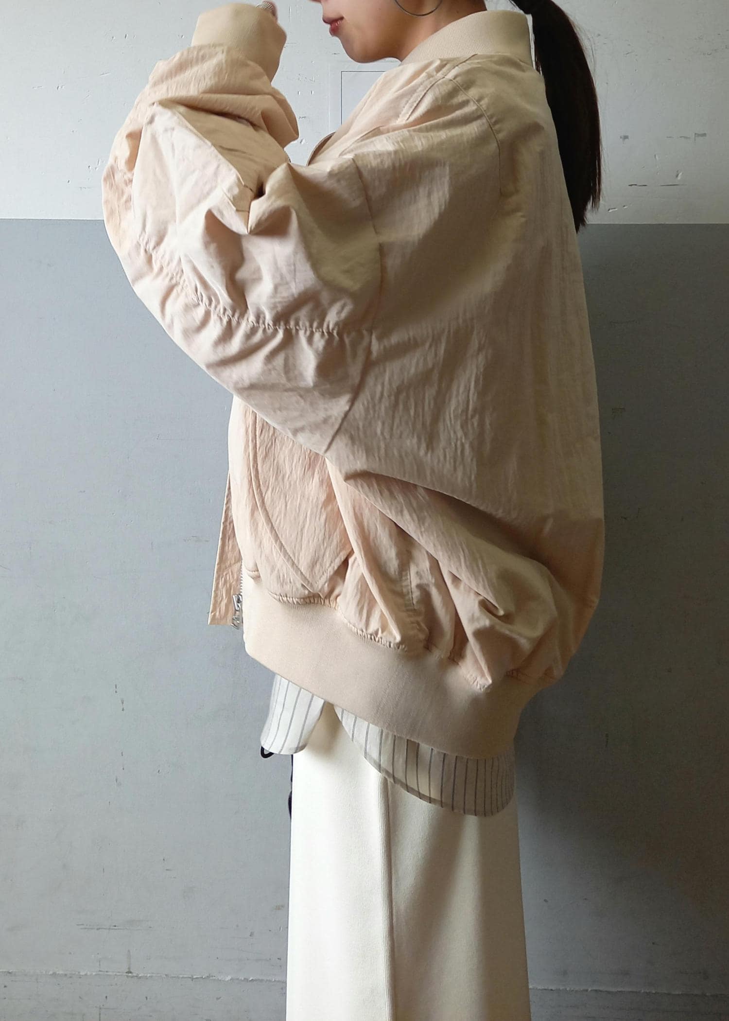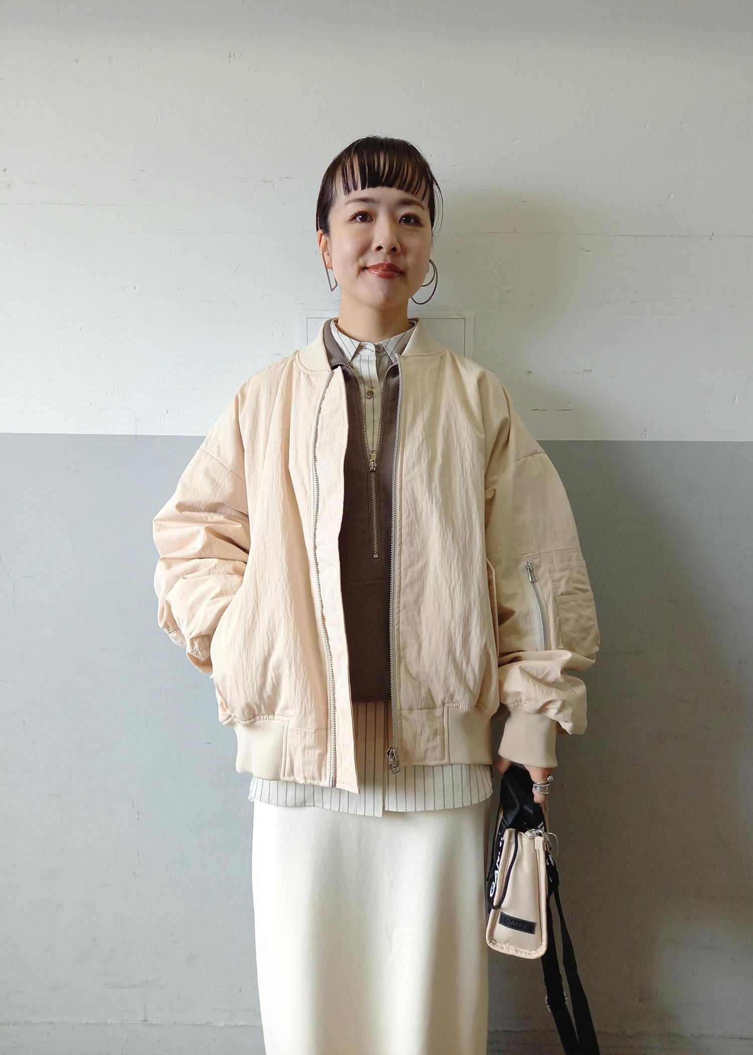 ADAM ET ROPÉ FEMME【PROVOKE for ADAM ET ROPE' 】別注 MA-1ベージュ系 / F¥28,600レビュー158㎝でフリーサイズ着用。素材に適度なハリもありたっぷりとしたビッグシルエットのMA-1。ゆるりと覆い隠すルーズさが◎袖はたぷっとたまるシルエットが可愛いです♡
