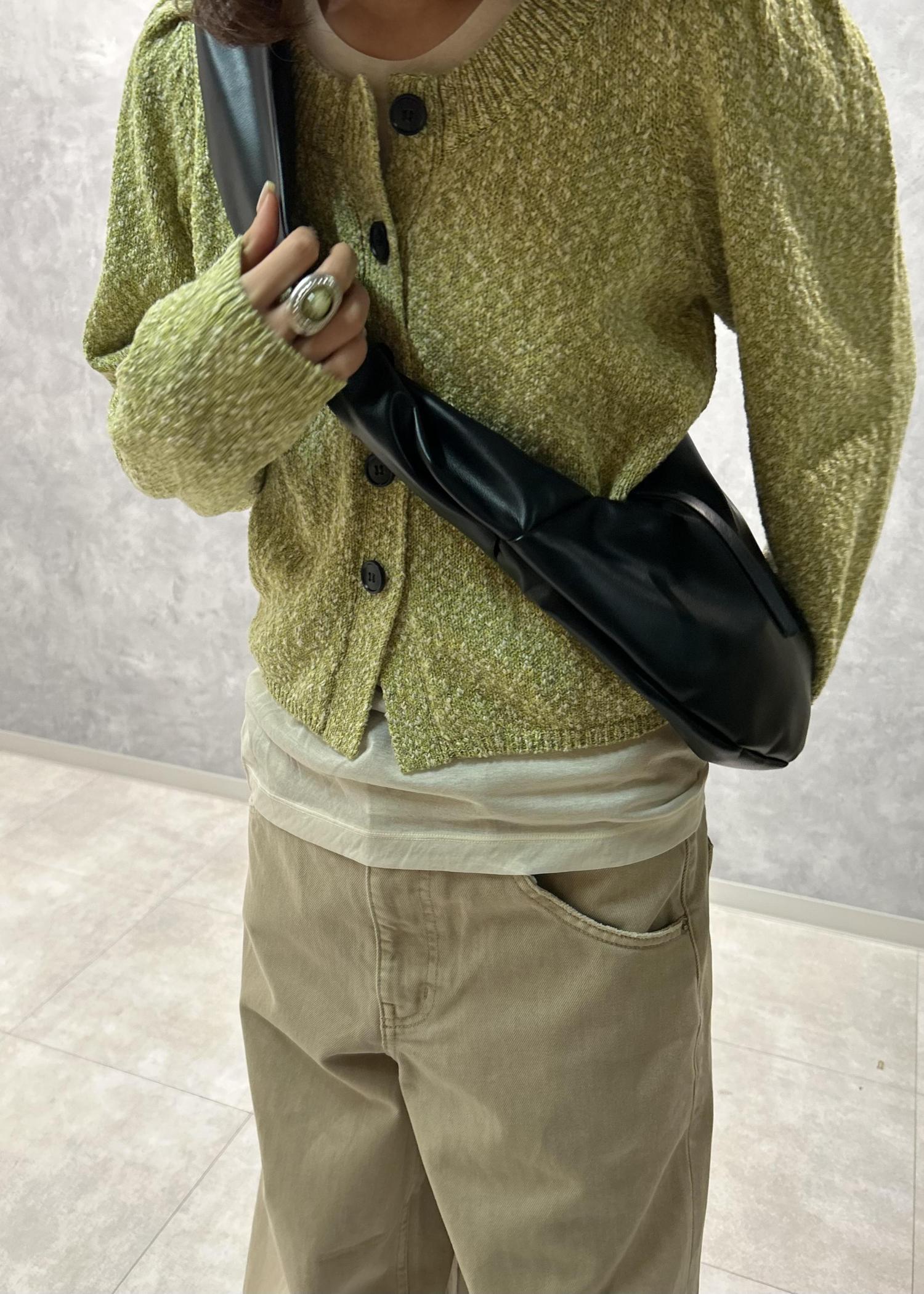 今回は春カラーが可愛い、カラーメランジパフスリーブカーディガンのご紹介です。