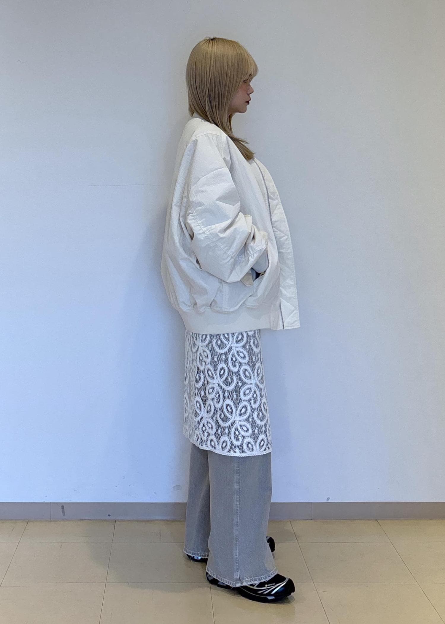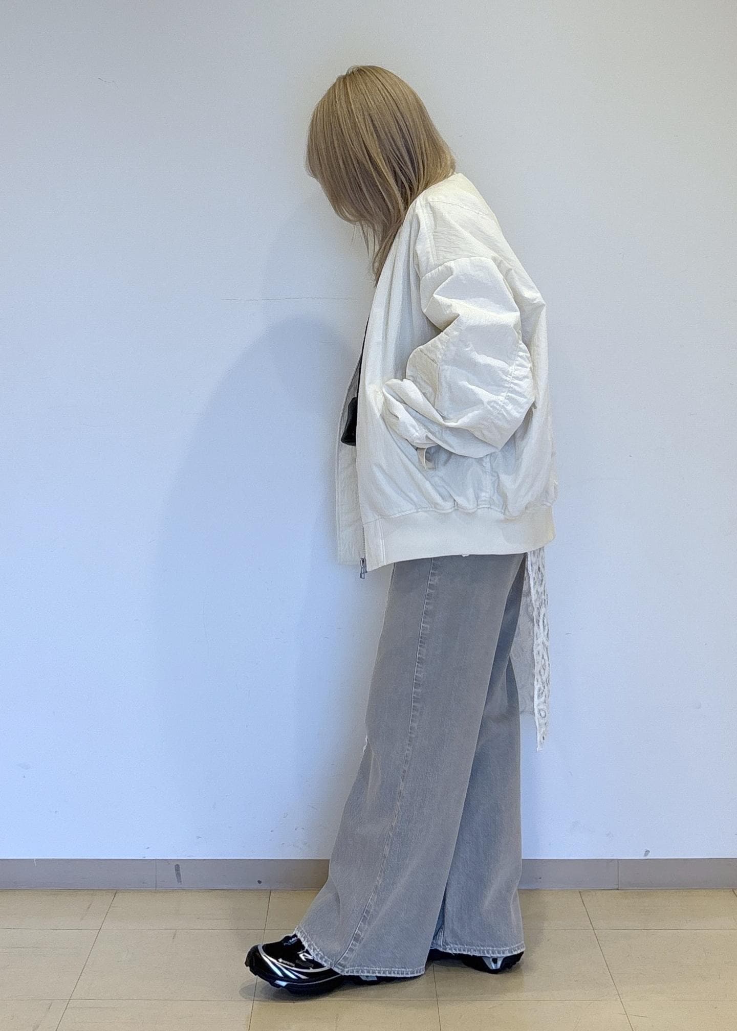 ADAM ET ROPÉ FEMME【PROVOKE for ADAM ET ROPE' 】別注 MA-1オフホワイト / F¥28,600レビュー160cm ヒップがちょうど隠れるくらいの着丈でドロップショルダーで程よいボリューム感で着膨れ感が出づらいです。カジュアルすぎない女性らしさがある素材感とシルエットです。