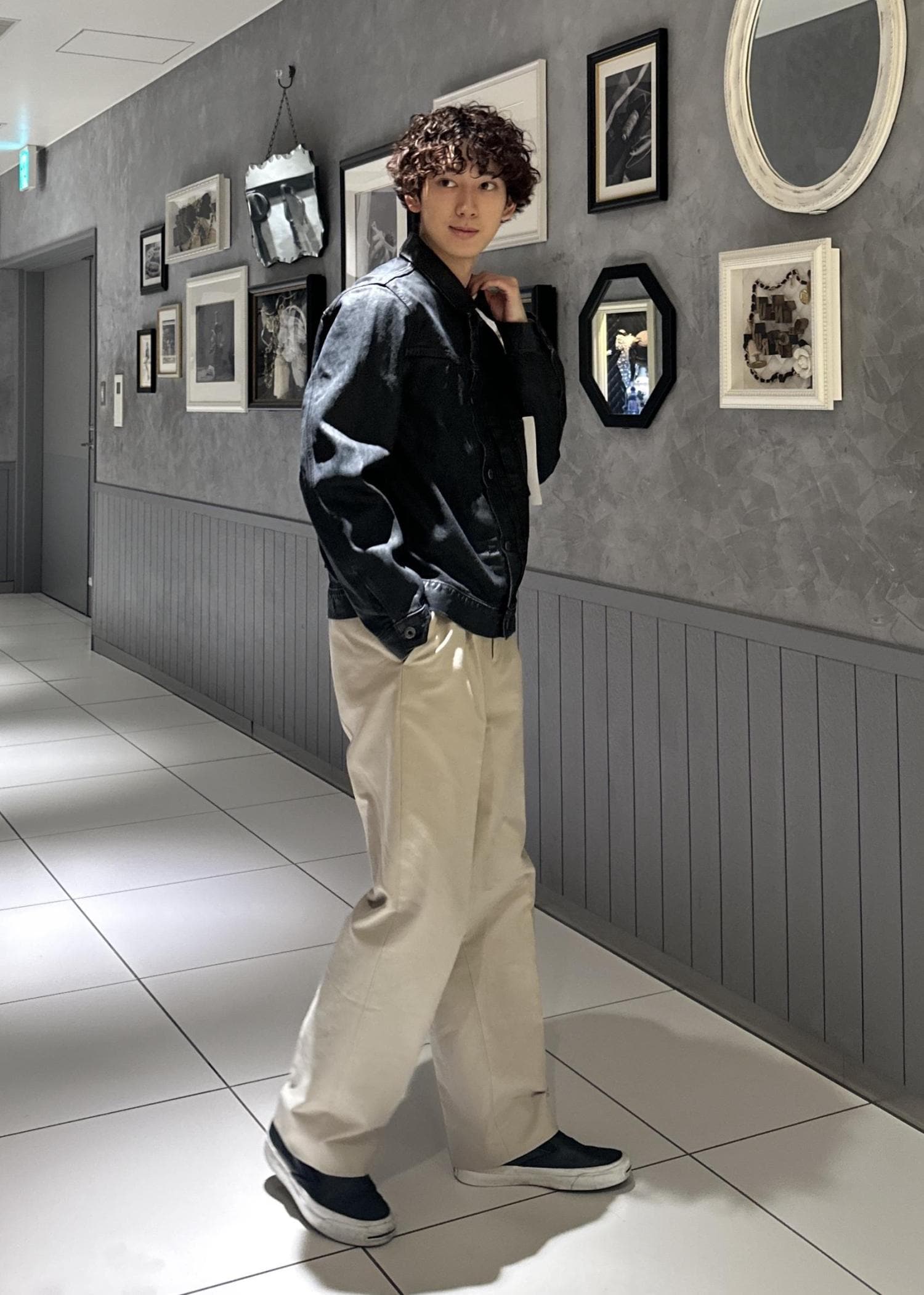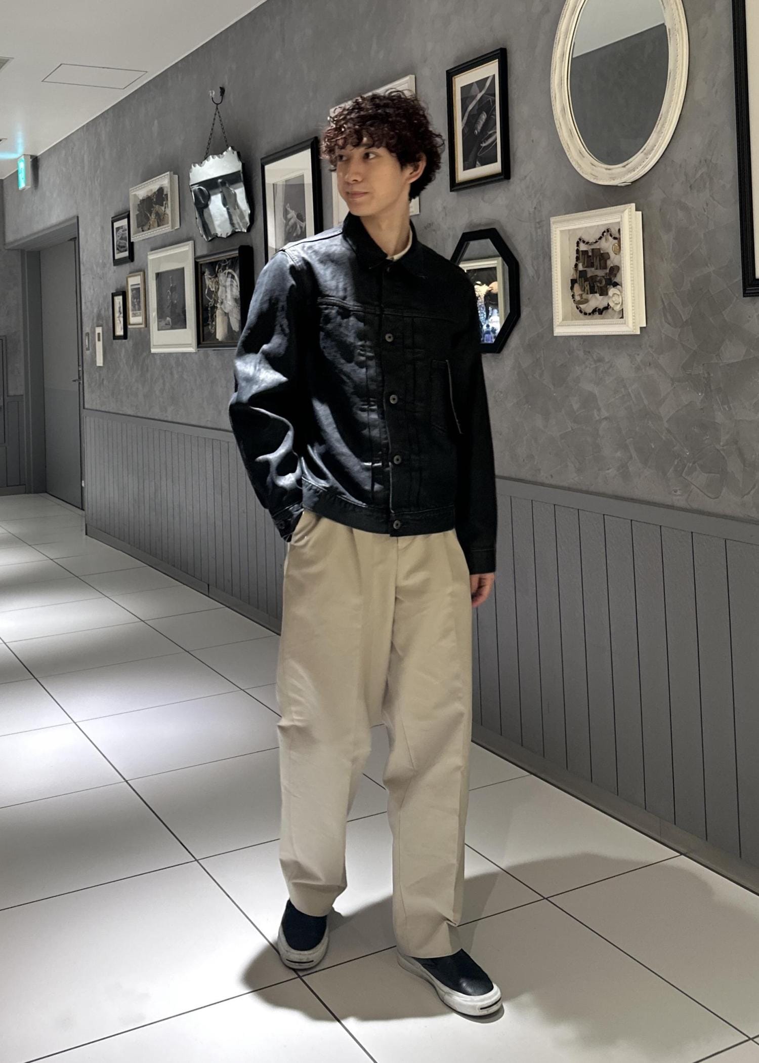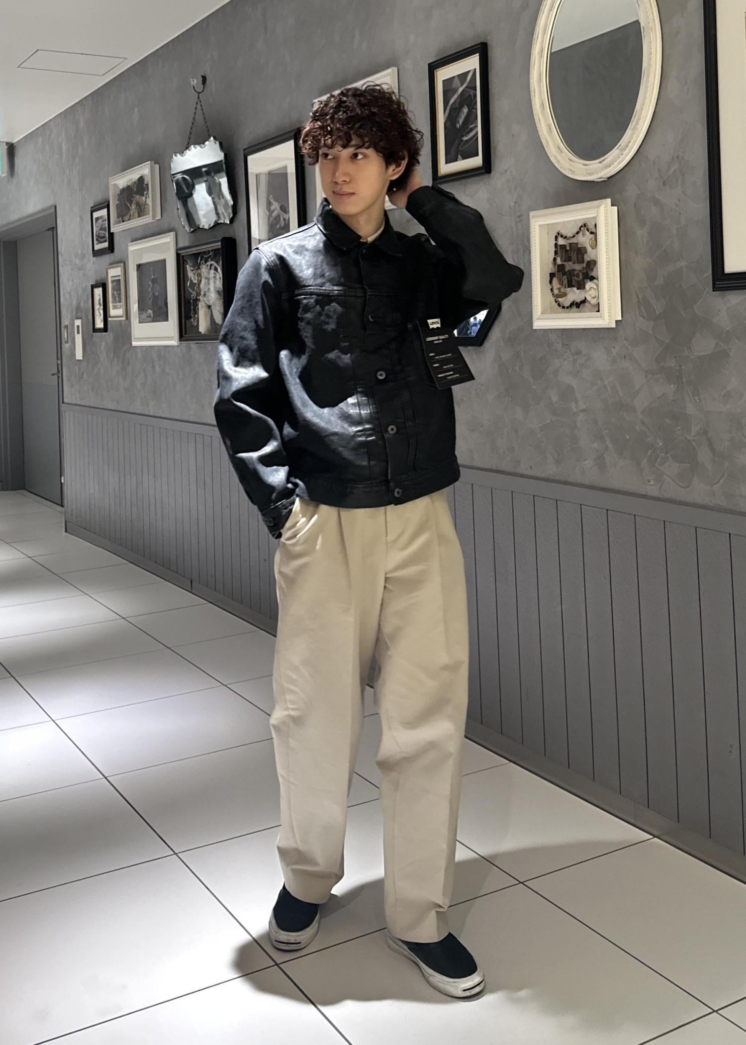デニムジャケットにコットン100%の白パンツを合わせたシンプルなコーデ。レザーっぽくも見える風合いのデニムジャケットを際立たせるため、オールブラックではなくあえて明るい白パンツを合わせました。デニムの硬めの素材感に負けないように、同じく硬めの素材のコットンのパンツをチョイスしました。