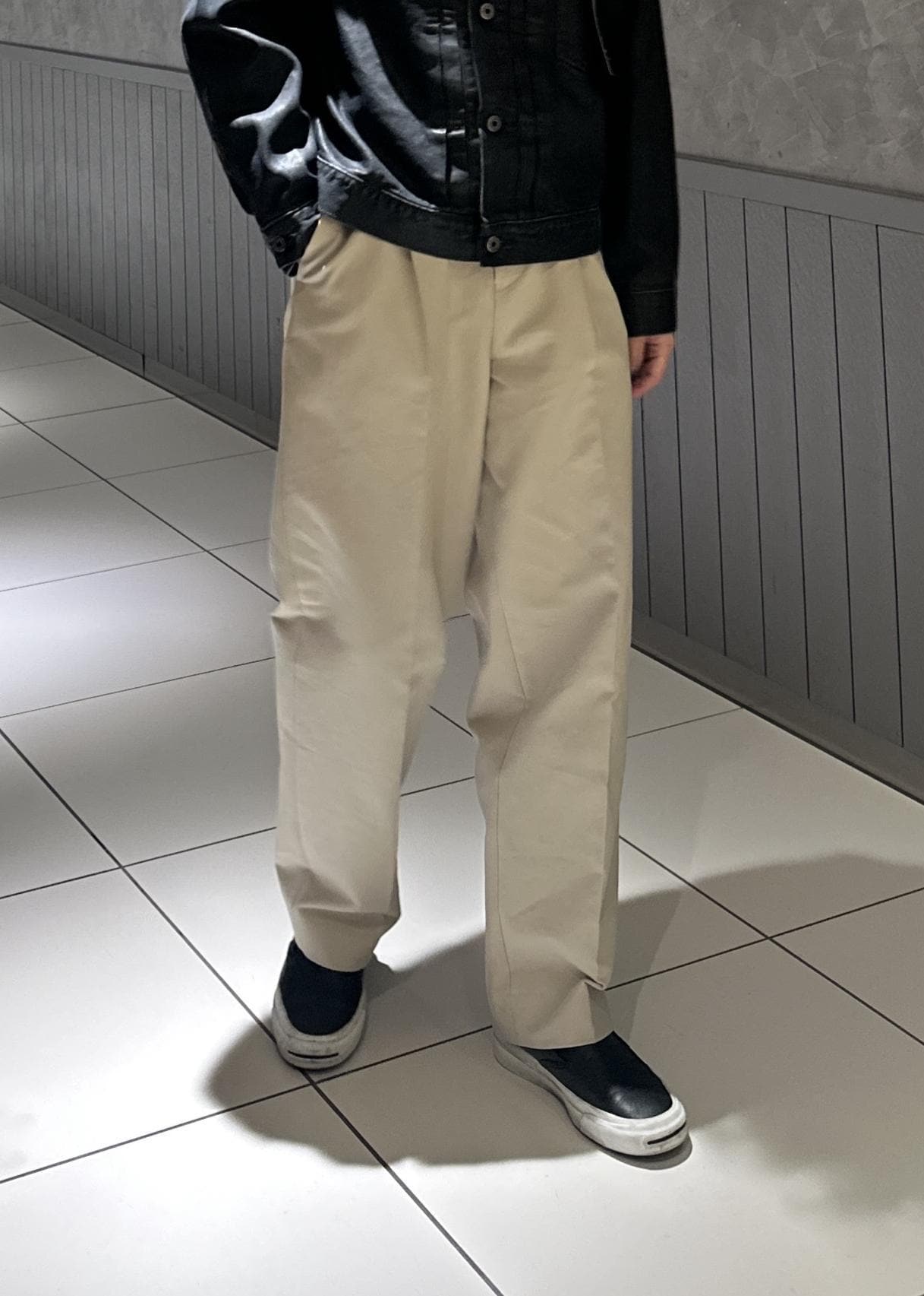 コットン100%の素材。スエードに近い触り心地です。ベルテッド付き。ややテーパードがかかっています。とにかくキレイなシルエットです。
