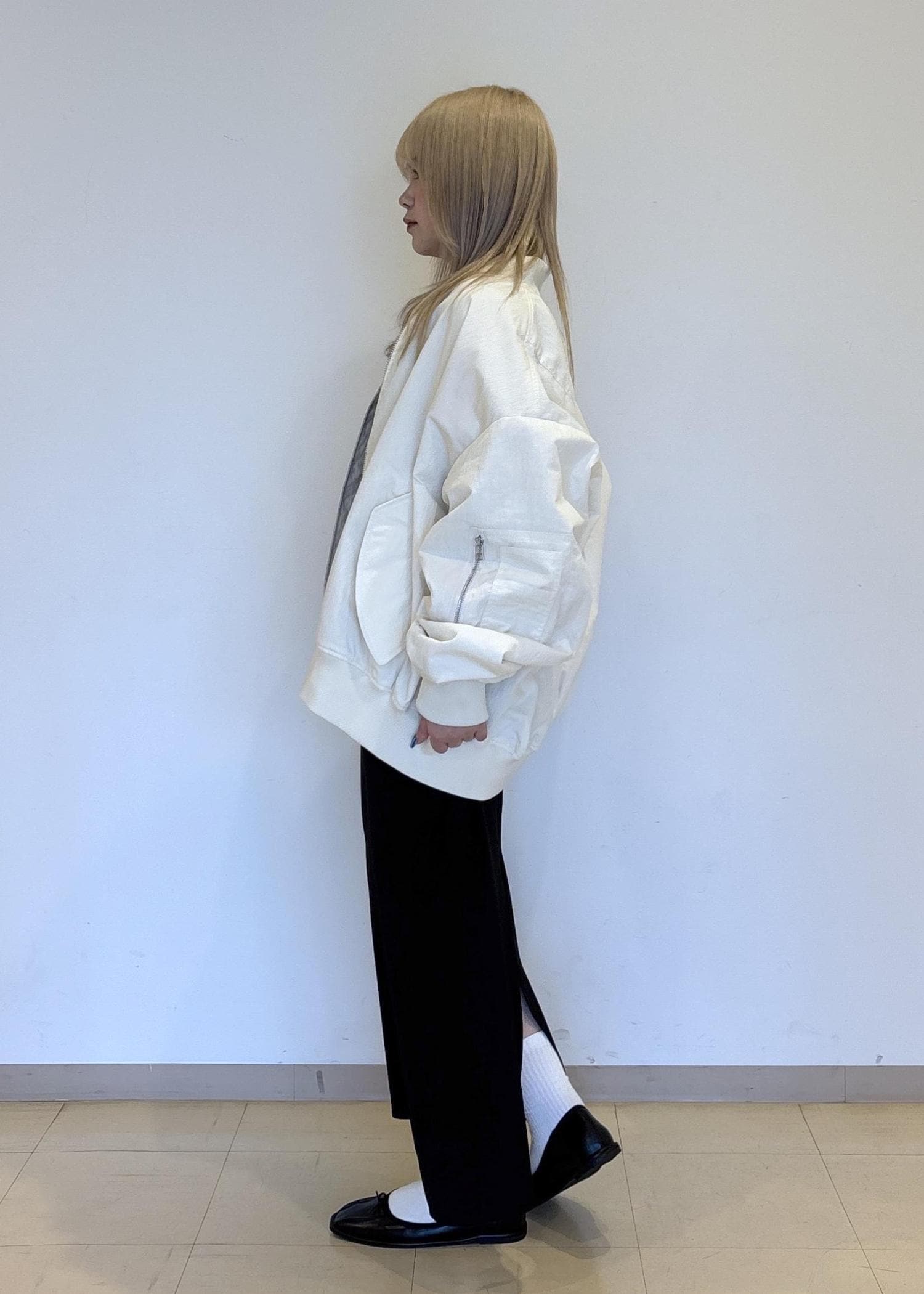 MA-1でボリューム感があるのですっきりめシルエットのワンピースと足元もバレエシューズでメンズぽくなりすぎない女性らしいコーディネートです。
