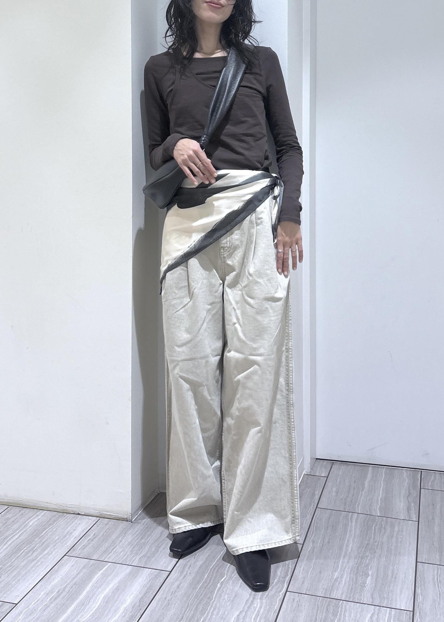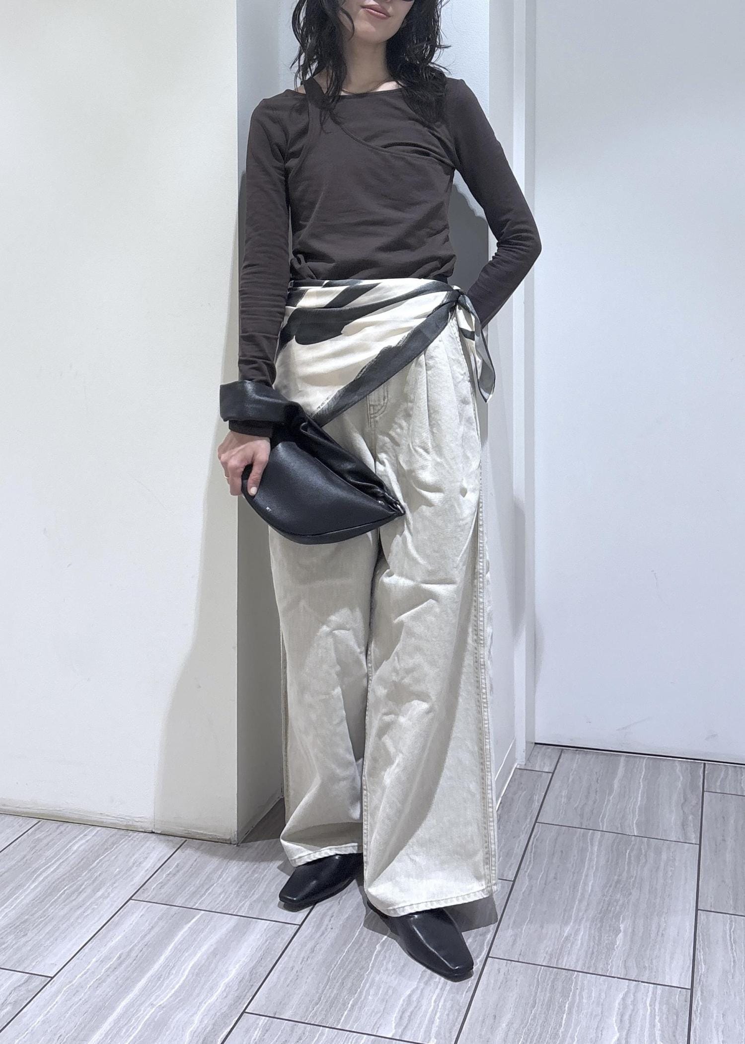 本日は、ワンショルダートップスとワイドデニムのシンプルなスタイリングに柄のスカーフをポイントに合わせてみました。