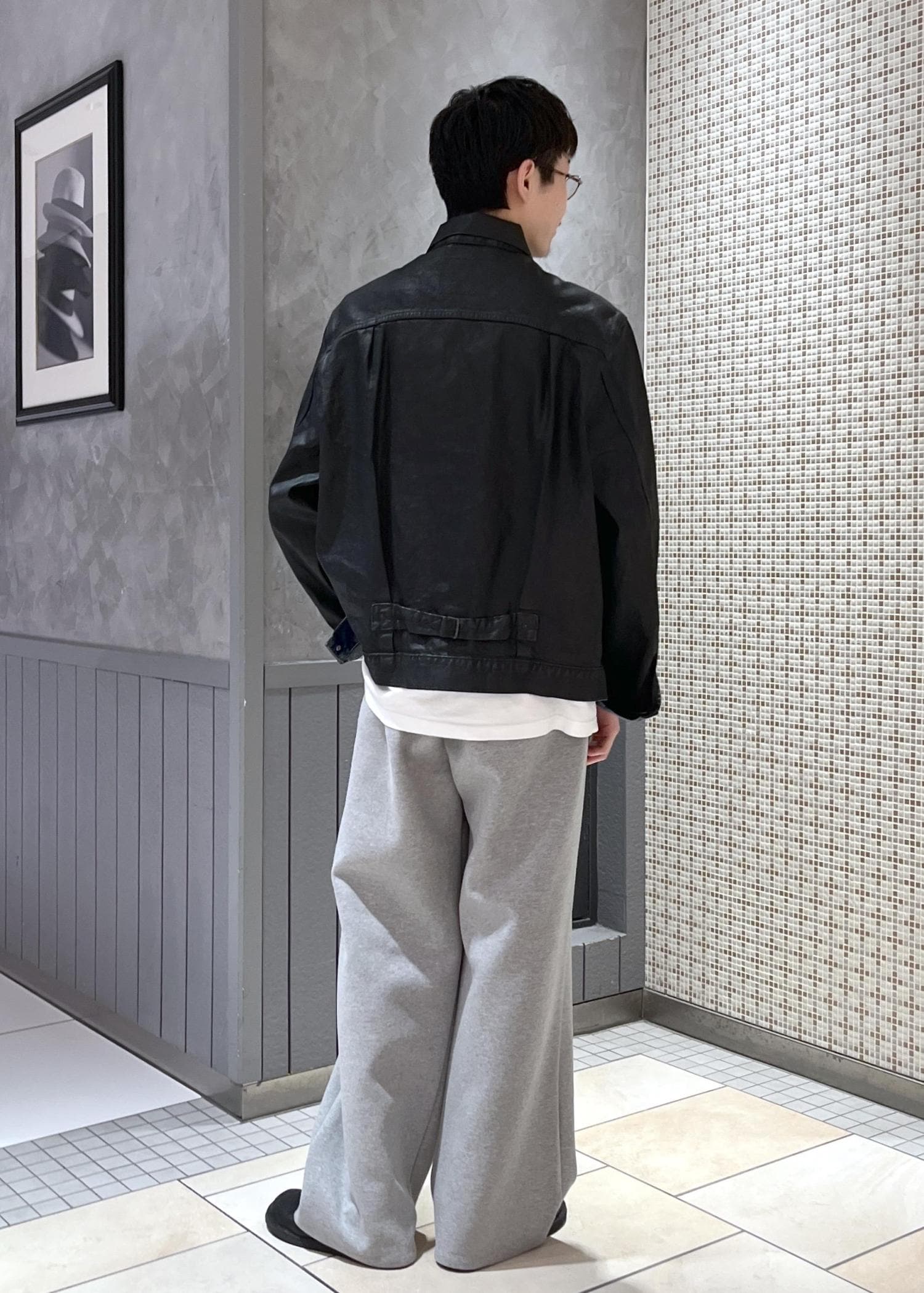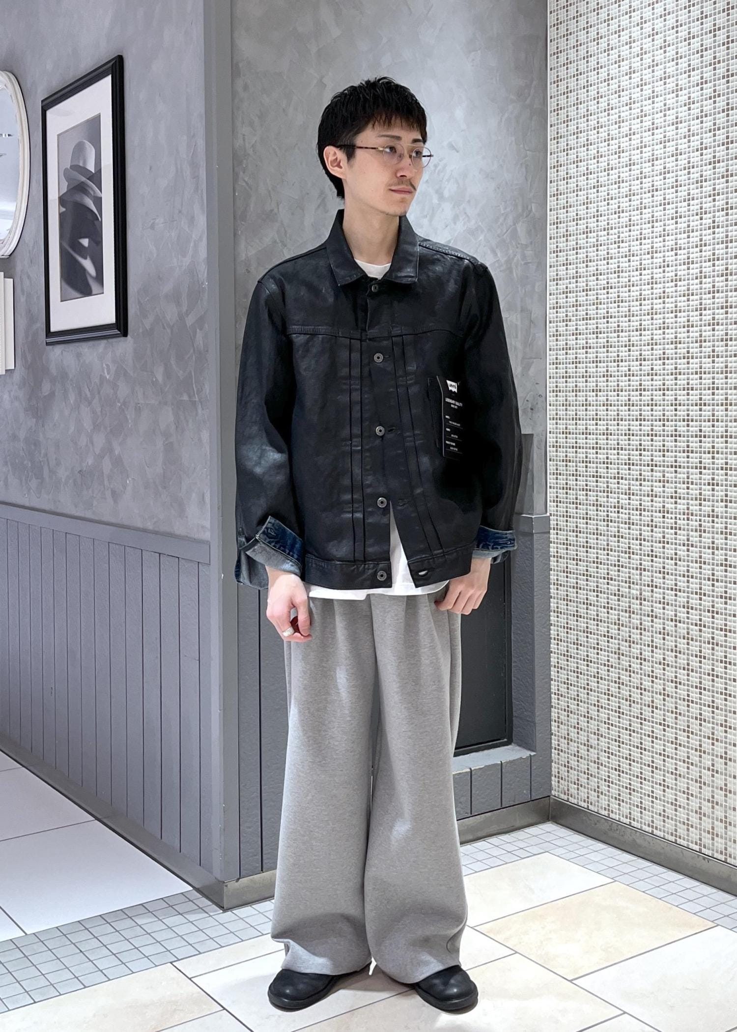 樹脂加工を加えたデニムジャケットは、無骨で大人の風合いながら上品さも感じられる1着に。