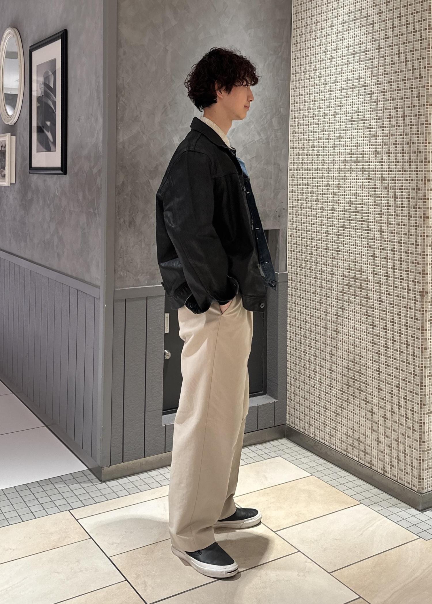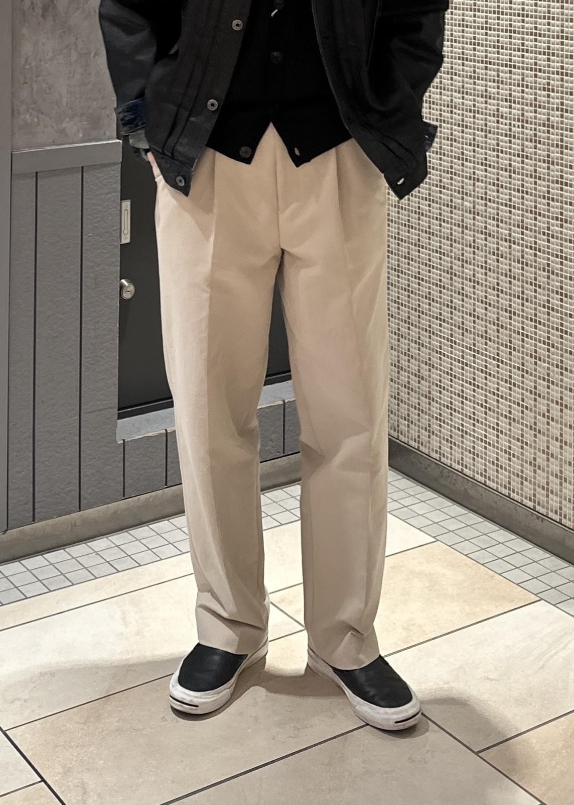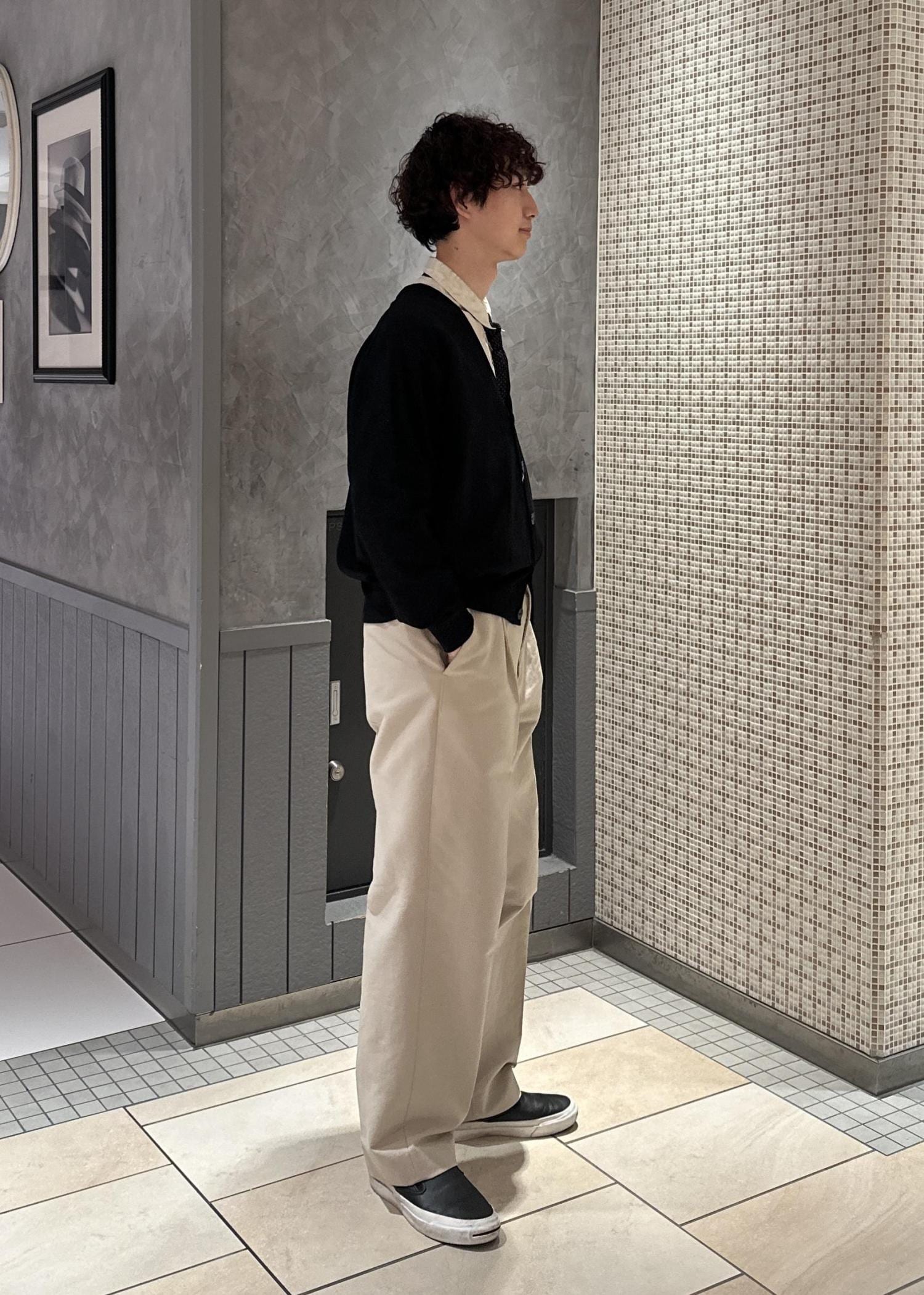 コットン100%の素材。スエードに近い触り心地です。ベルテッド付き。ややテーパードがかかっています。とにかくキレイなシルエットです。 -