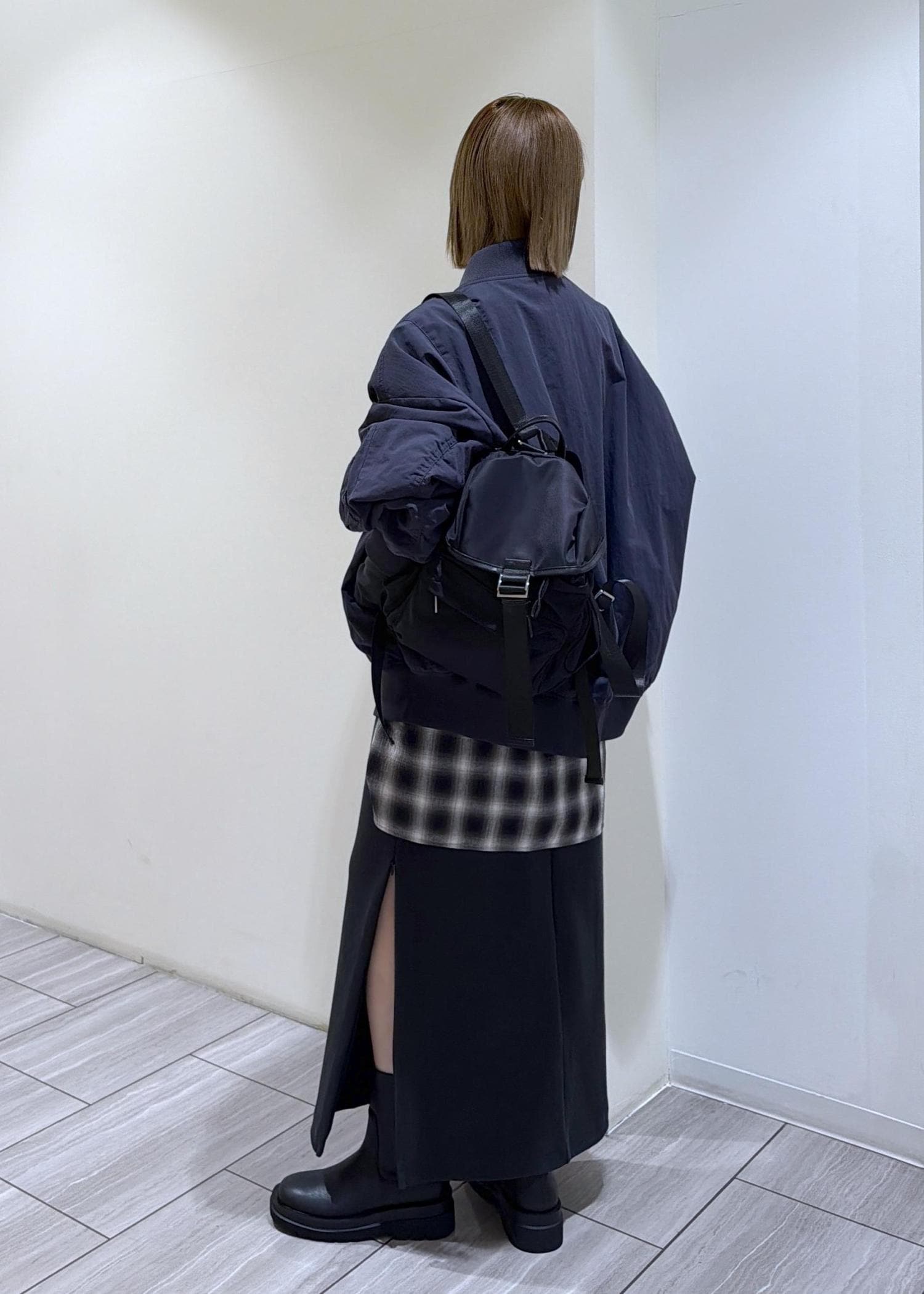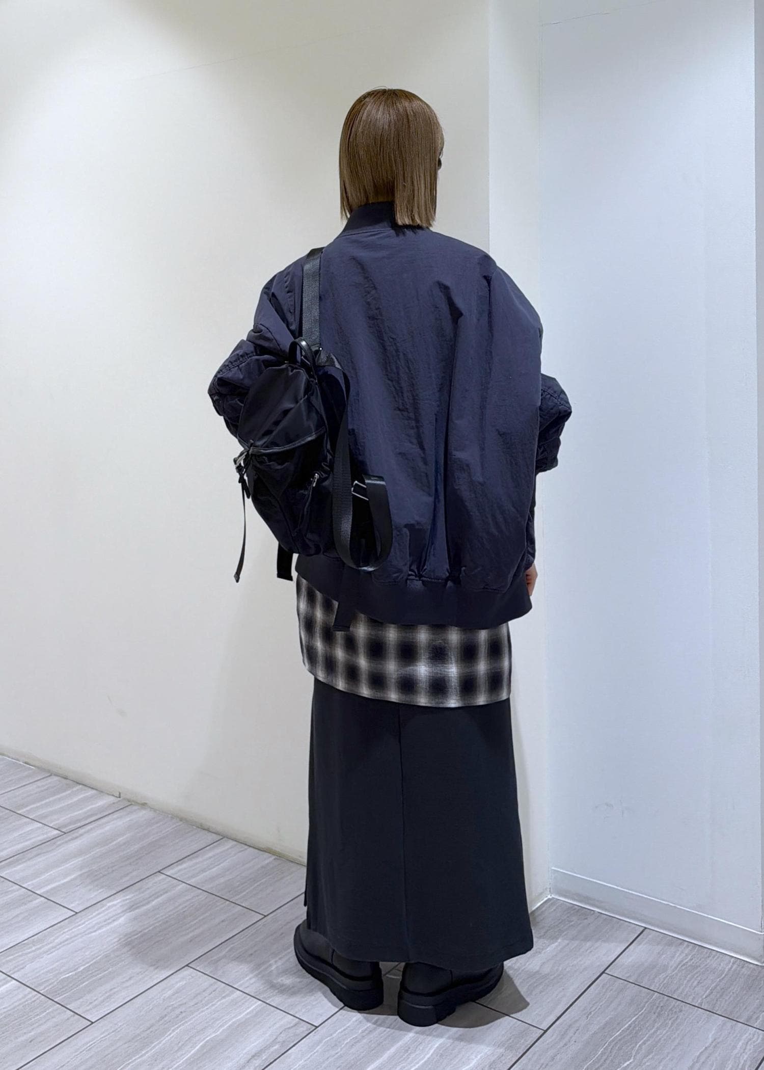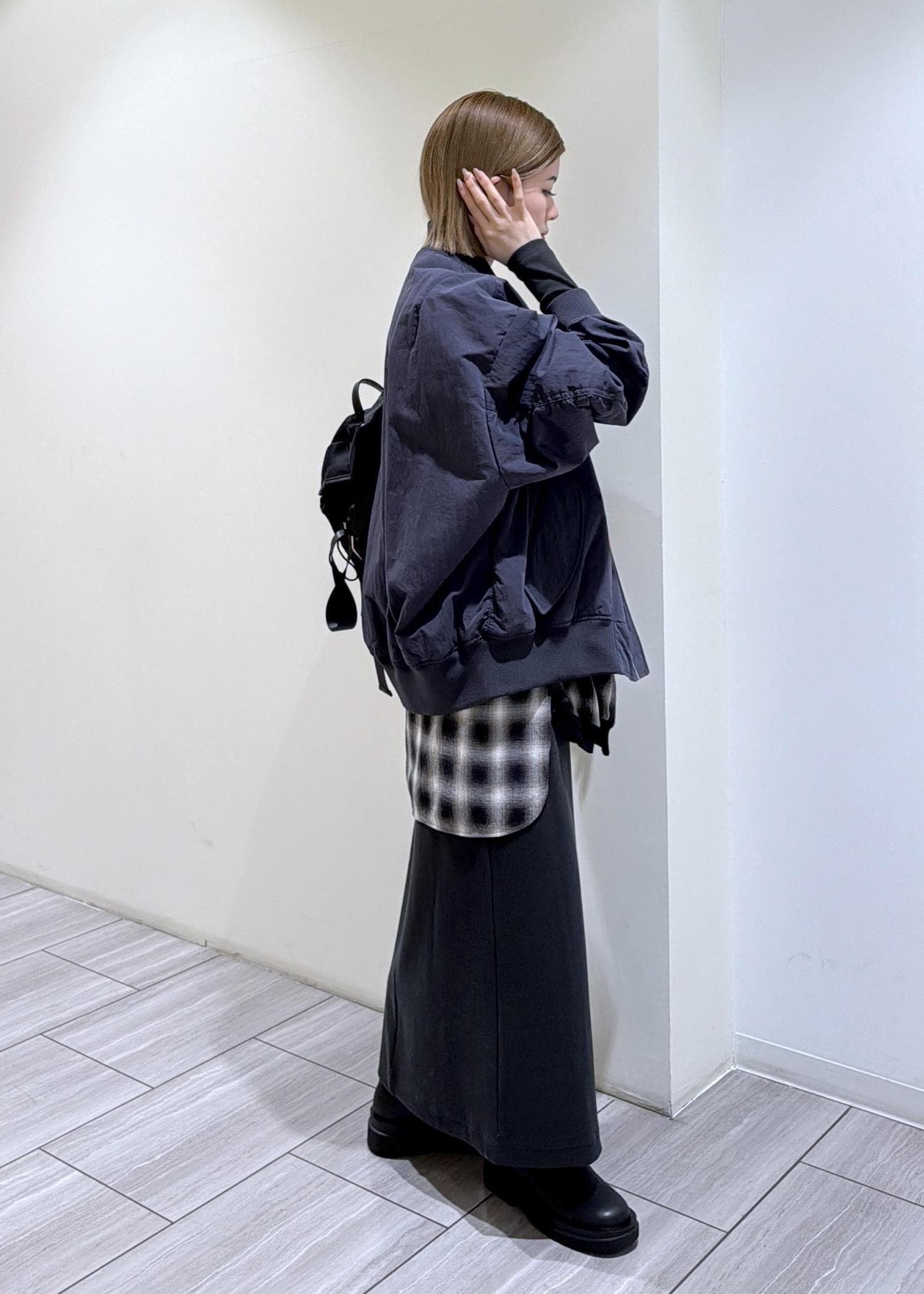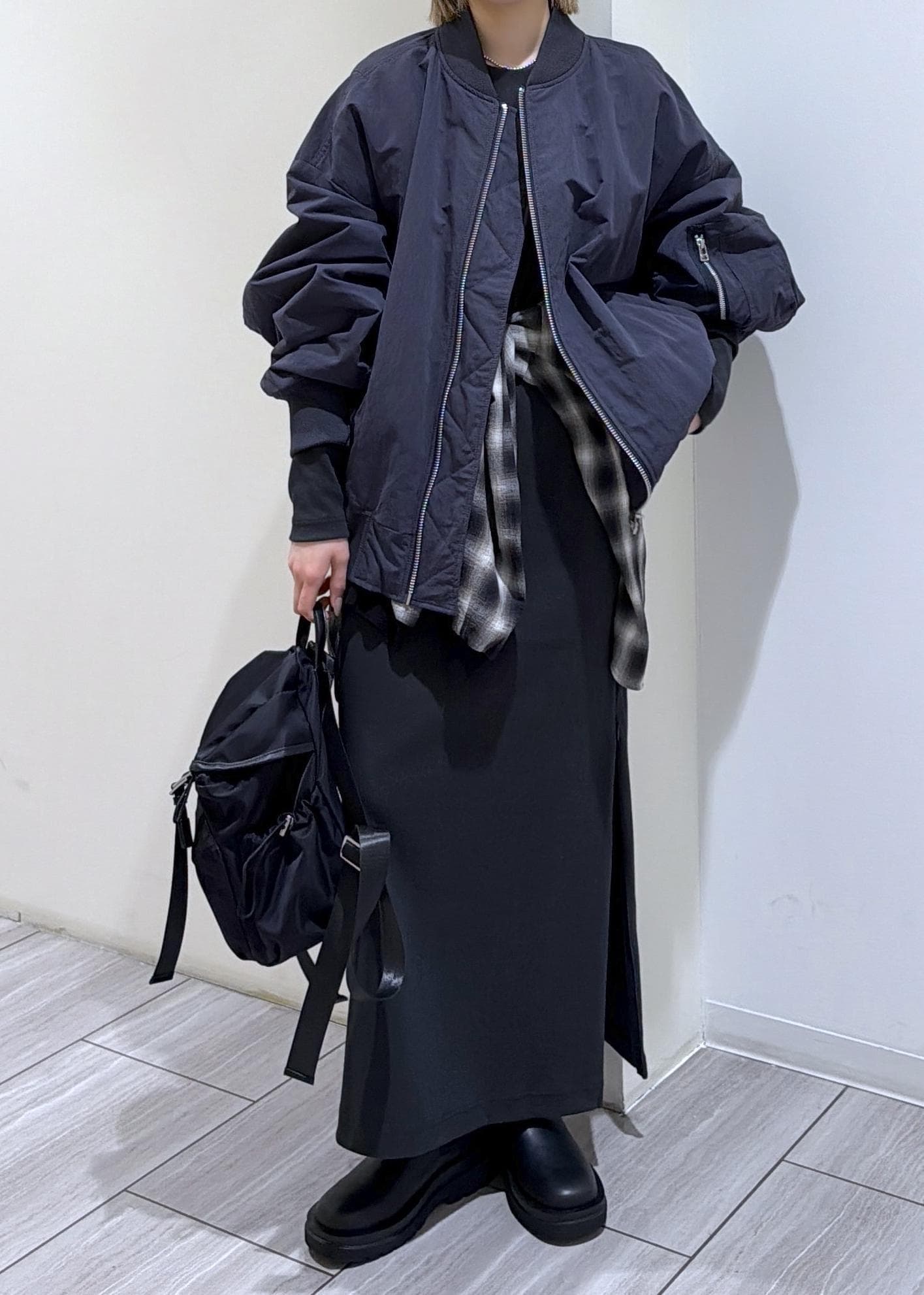 カジュアルなイメージですがコンパクトで合わせやすく、光沢のある生地なのできれいめスタイリングにあえて合わせるのもおすすめです◯