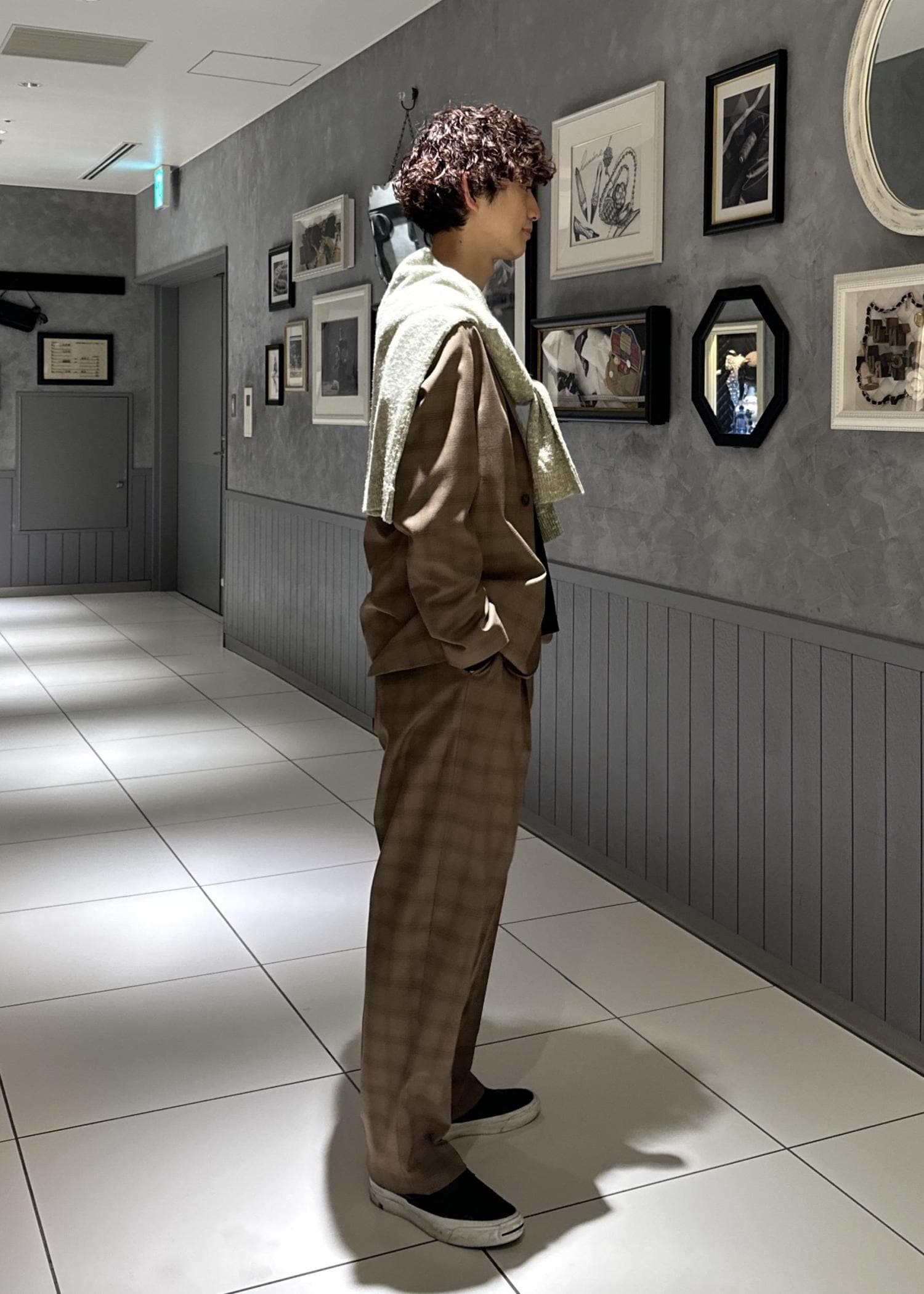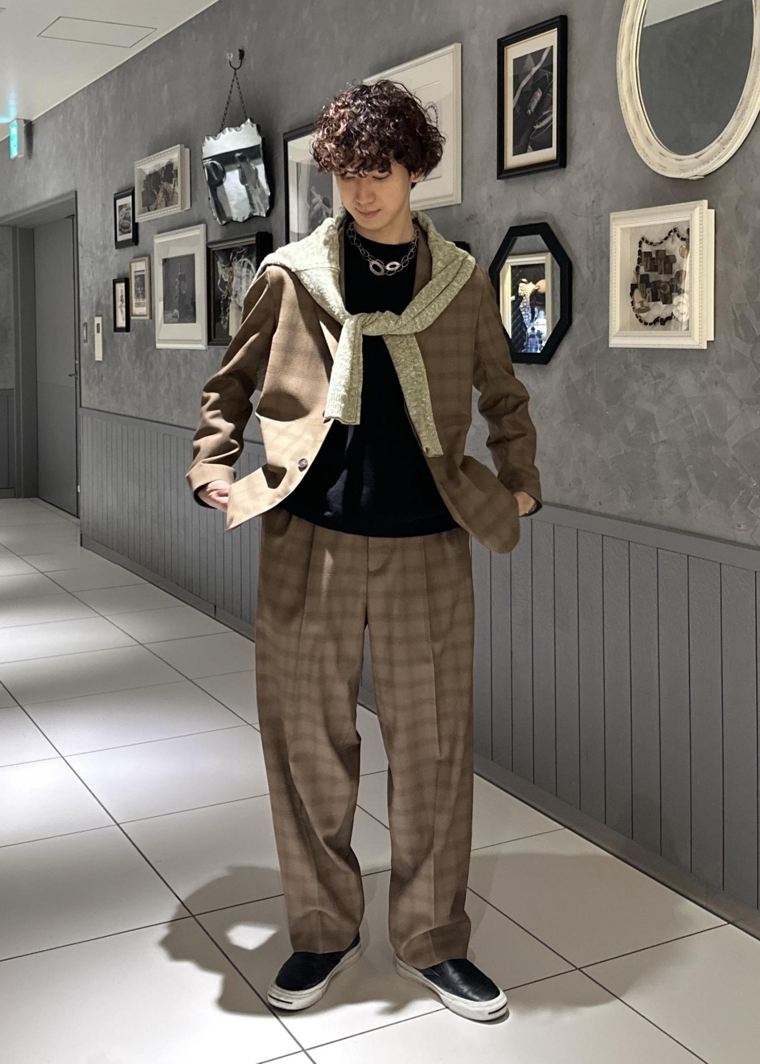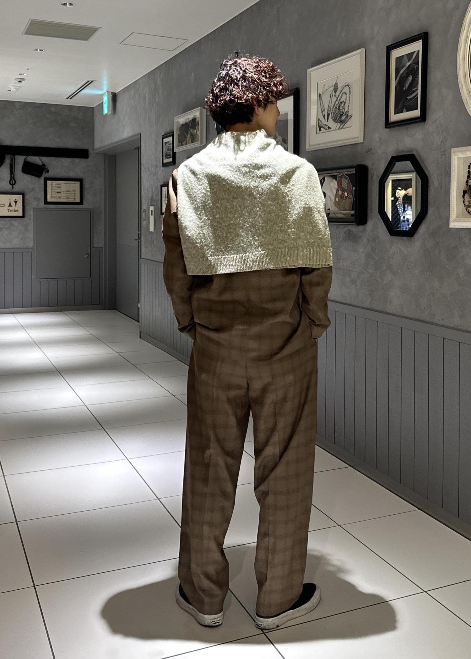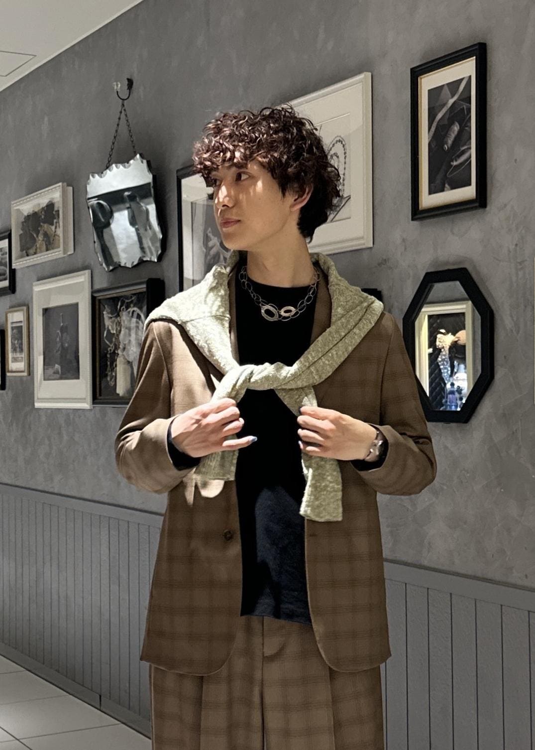 チェック柄のセットアップに、リネンニットを肩掛けしたコーデです。肩掛けすることで抜け感を出し、一気にオシャレに。セットアップ特有のカチッと感も軽減しています。リネンの入ったニットなので軽やかな風合い。暖かくなる春らしい素材をチョイス。抜け感のある大人っぽいセットアップコーデに仕上げました。