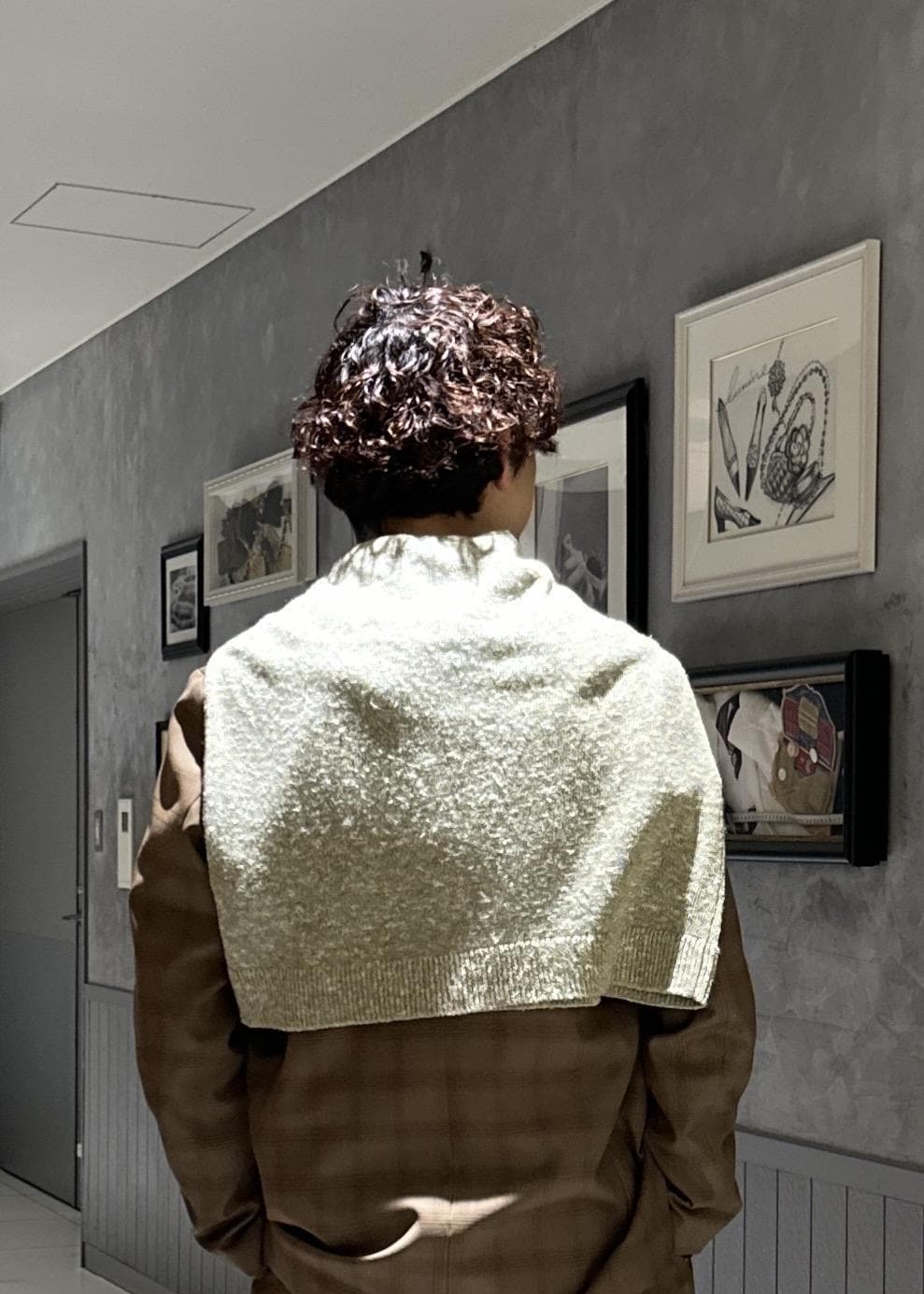 リネンが入った春夏仕様のニット。風通しがよく涼しいです。ゆったりなサイズ感でリラックス感のあるシルエットです。優しい色味で、色物なのに落ち着いた印象で、大人っぽい雰囲気です。 -