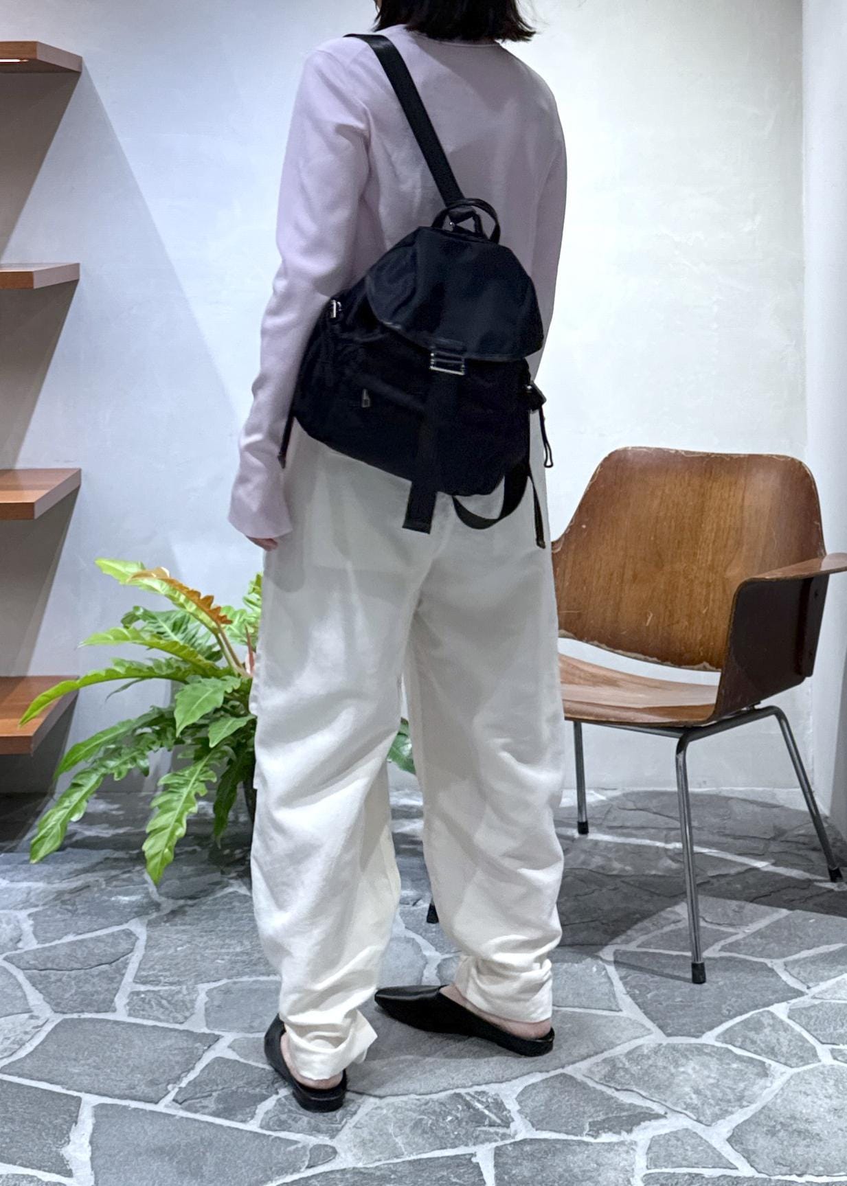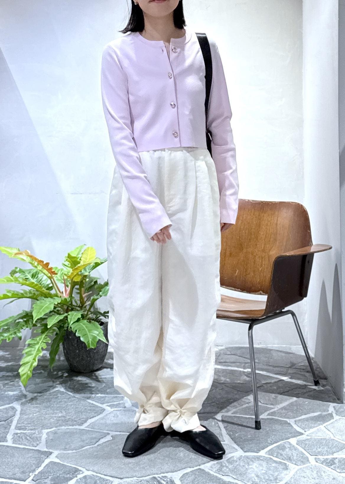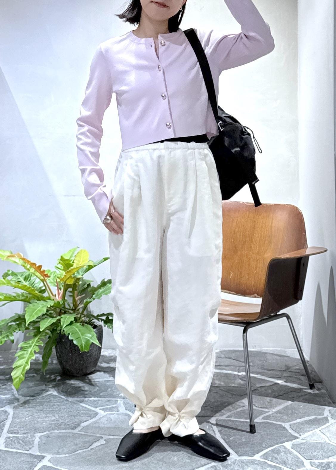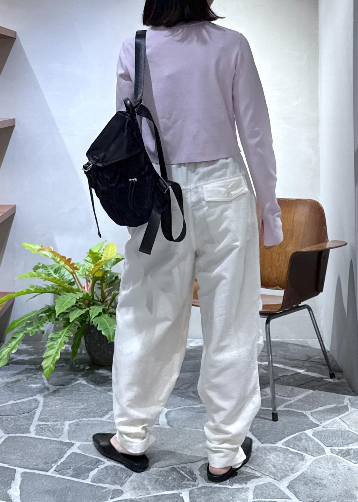 前回ご紹介させていただいた、クルーネックカーディガンをパラシュートパンツと合わせてカジュアルにスタイリングしました。