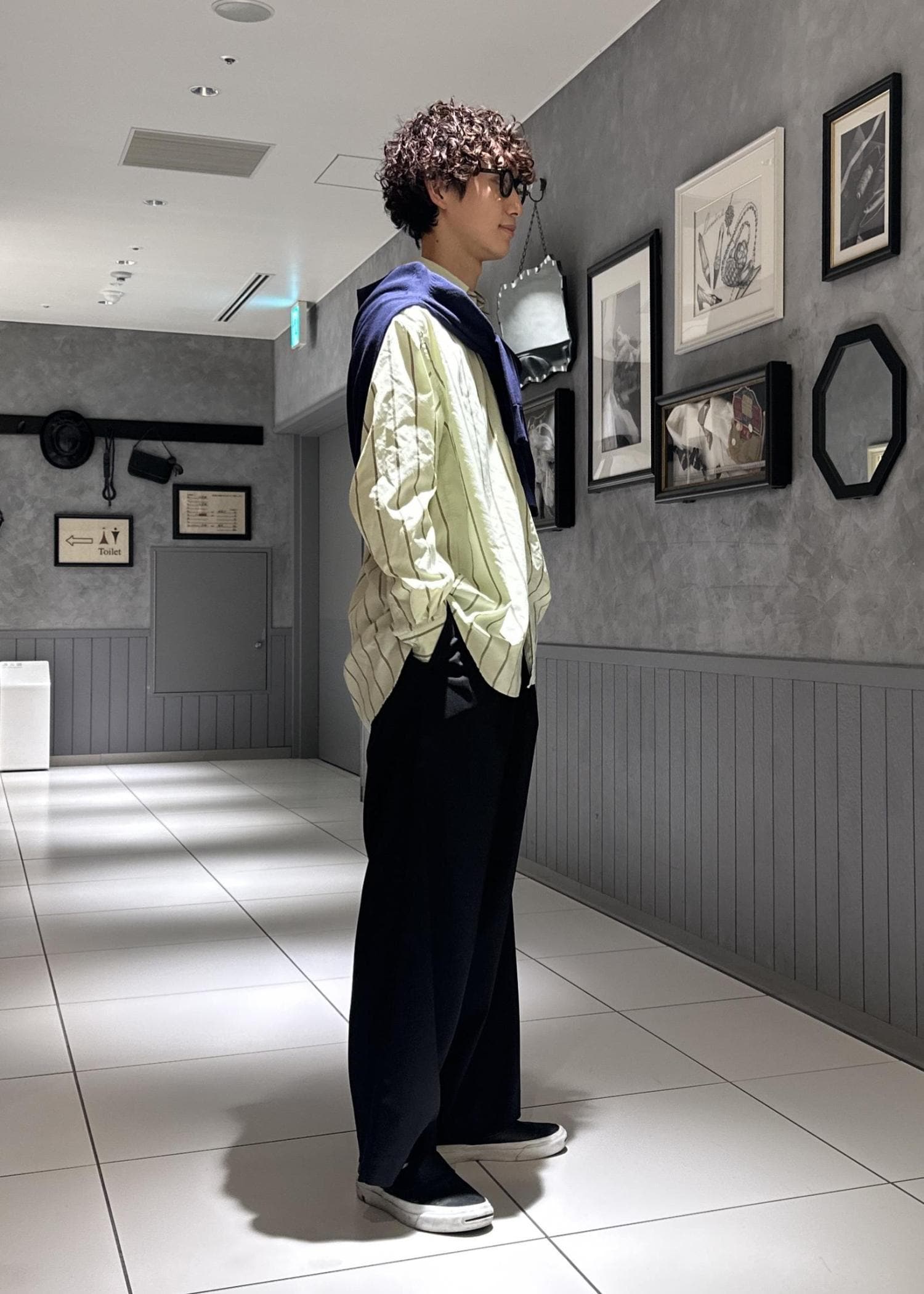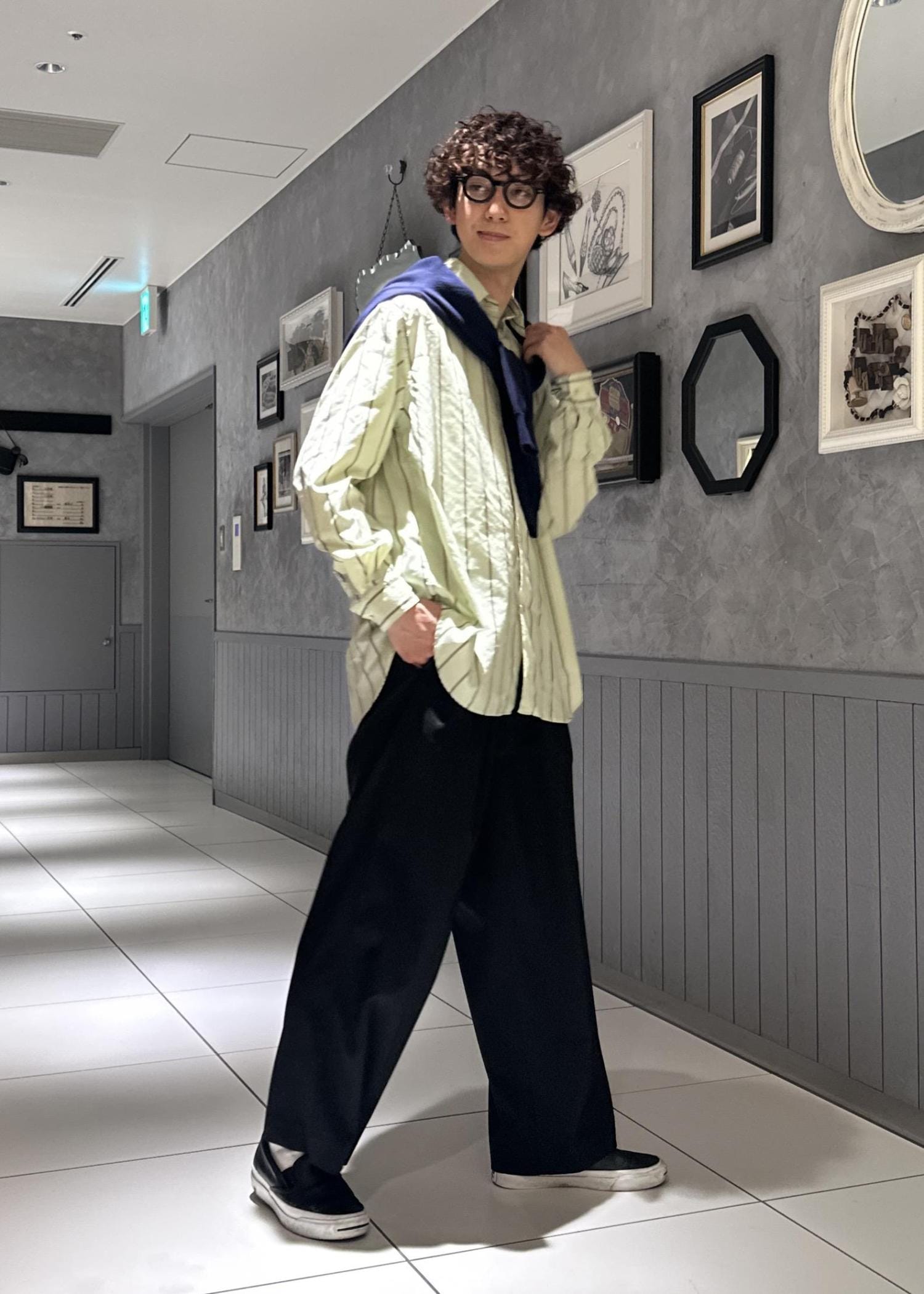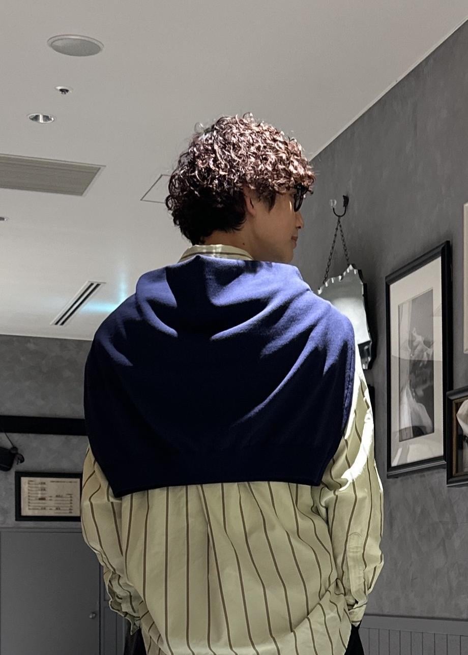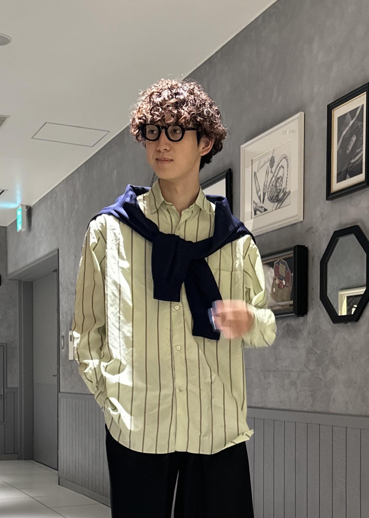 春色なグリーンのストライプシャツを使ったキレイめコーデ。シンプルに黒スラックスと合わせ、ネイビーのニットを肩掛けしました。寒い時はニットを着て気温調節できます。オシャレと機能面を掛け合わせ、大人っぽい雰囲気に仕上げました。