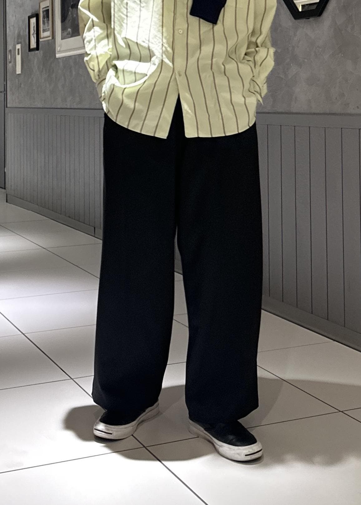 紐付きのリラックス感のあるスラックス。ウエスト調節楽ちん、履き心地も抜群。センタープレスがなく、フォーマルな感じが全くないので、私服に取り入れやすいです。
