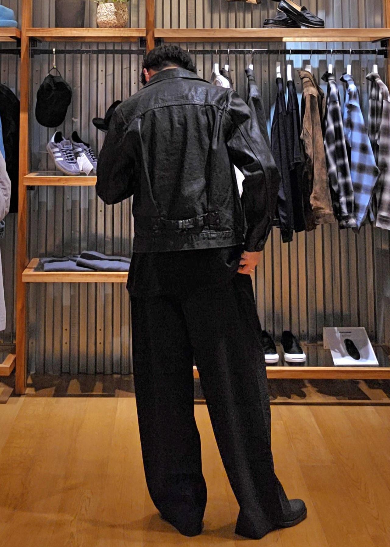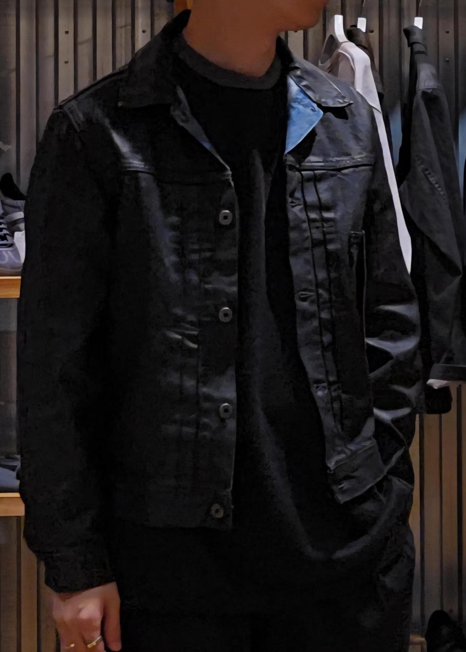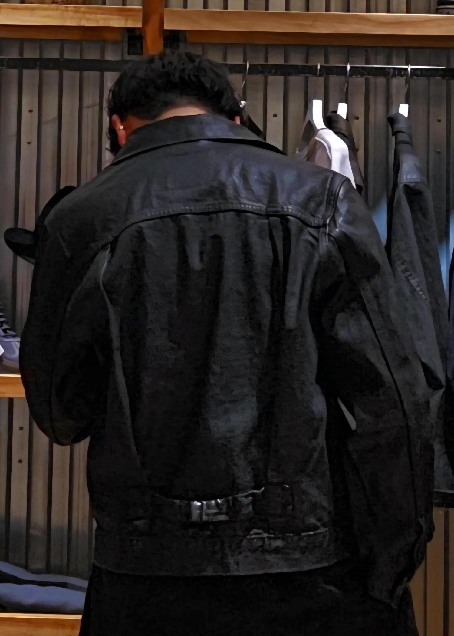 デニムのベースカラーにはウォッシュをかけたヴィンテージ風のライトインディゴカラ一に手作業 で加工を施したブラックのPUコーティングが最大の別注ポイントです!!!